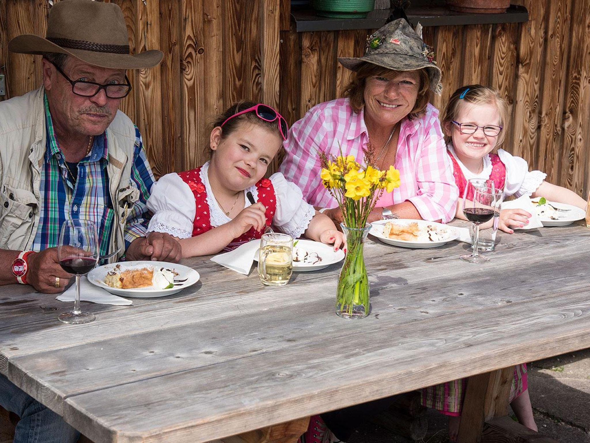 Während die Kinder am Spielplatz toben, genießen Sie auf der Panorama Sonnenterrassse hausgemachte Kaffee- und Kuchenspezialitäten, ein Zirbenschnapserl...