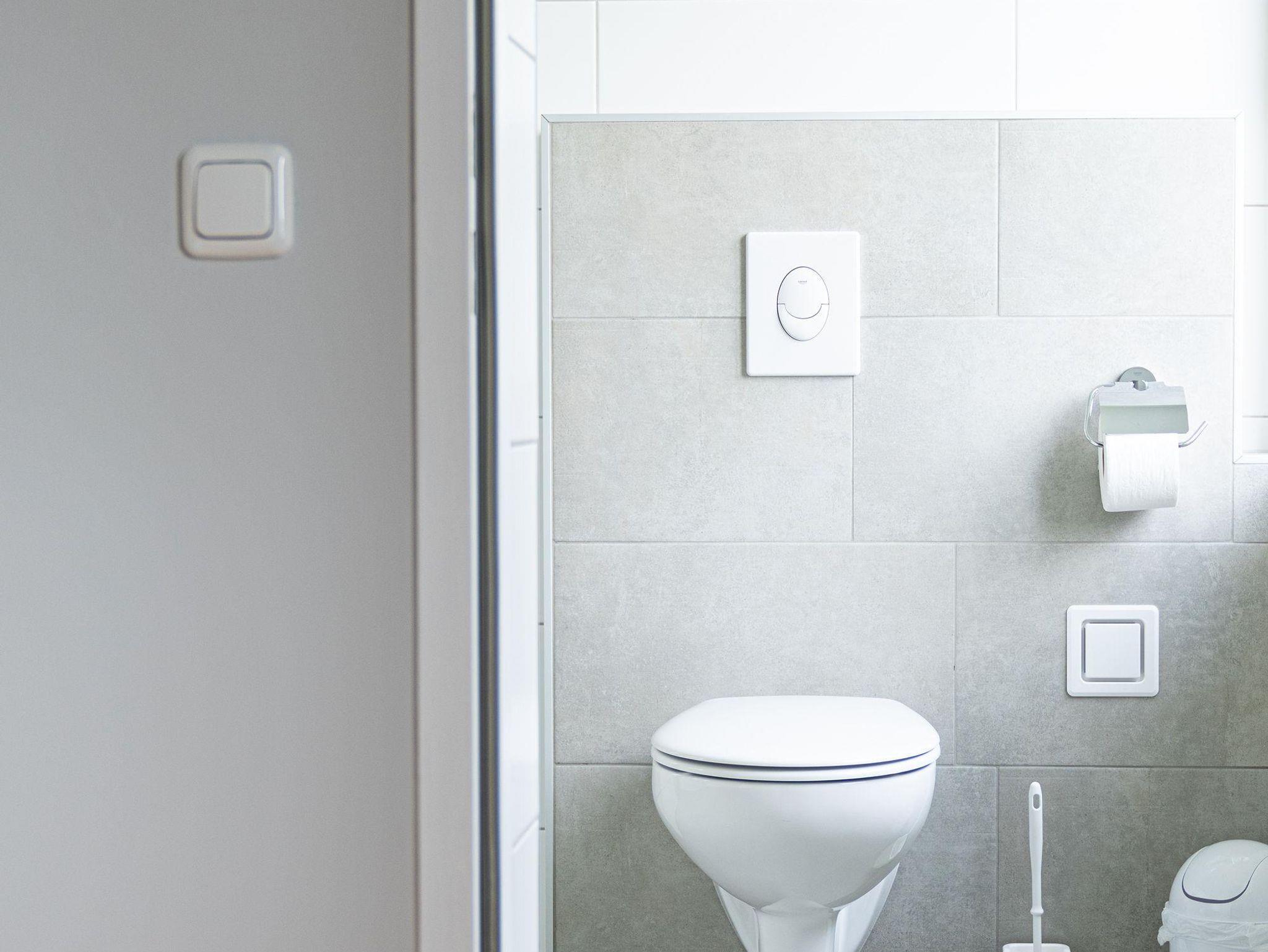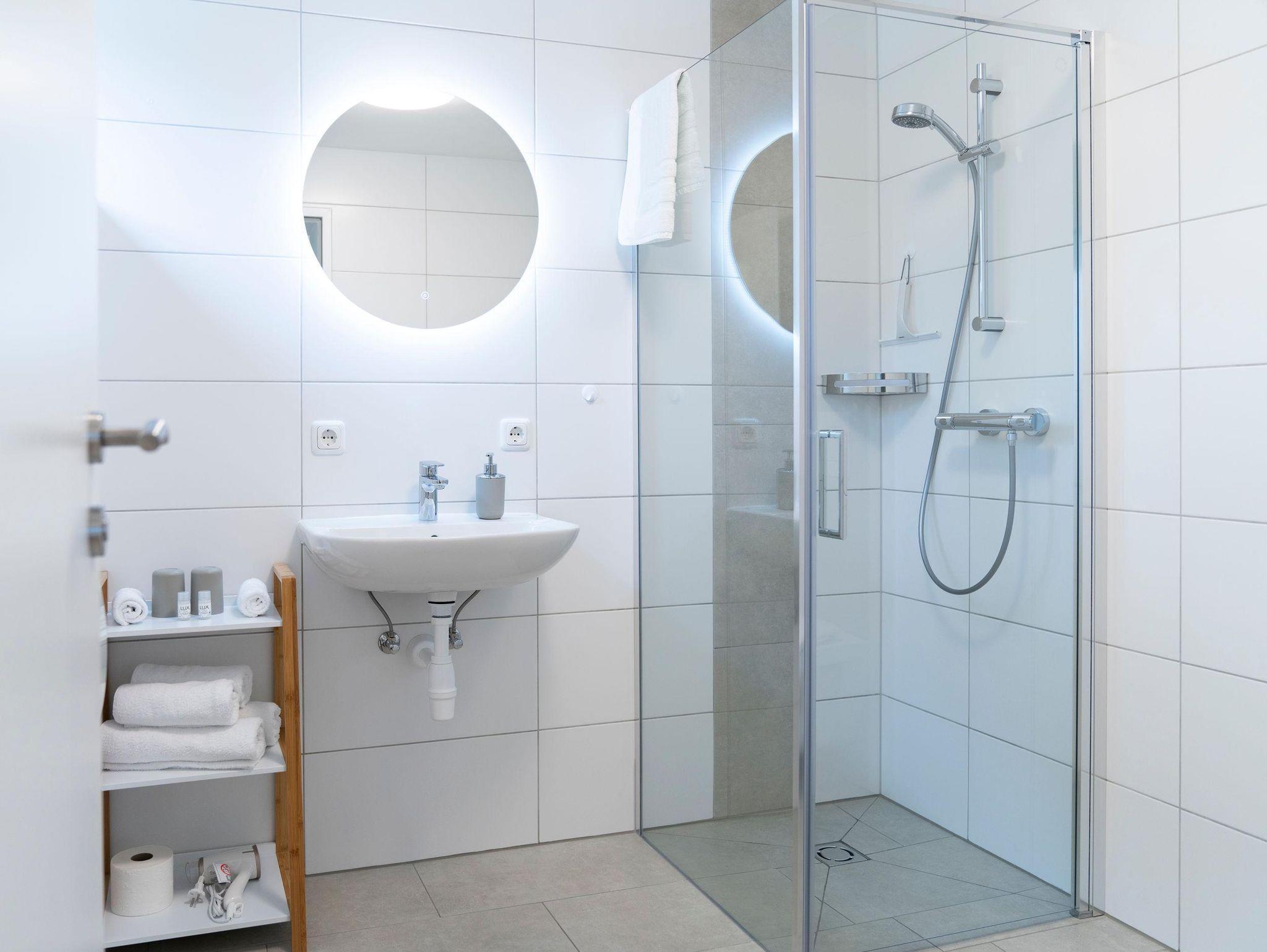 • Badezimmer mit Dusche, Toilette, Waschtisch, Spiegel, Föhn