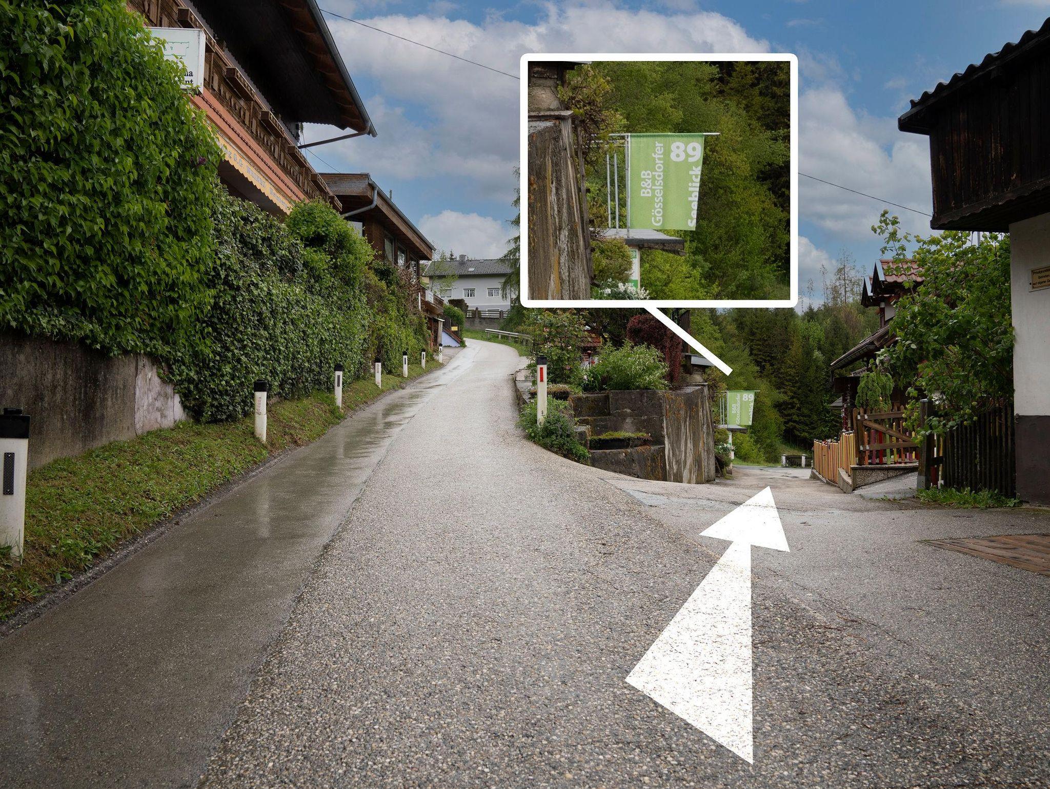 Anreisehinweis: Etwa 50 Meter vor dem Ziel sehen Sie die Tafel „B&B Gösselsdorfer Seeblick“. Hinter der Tafel biegen Sie sofort rechts ab.