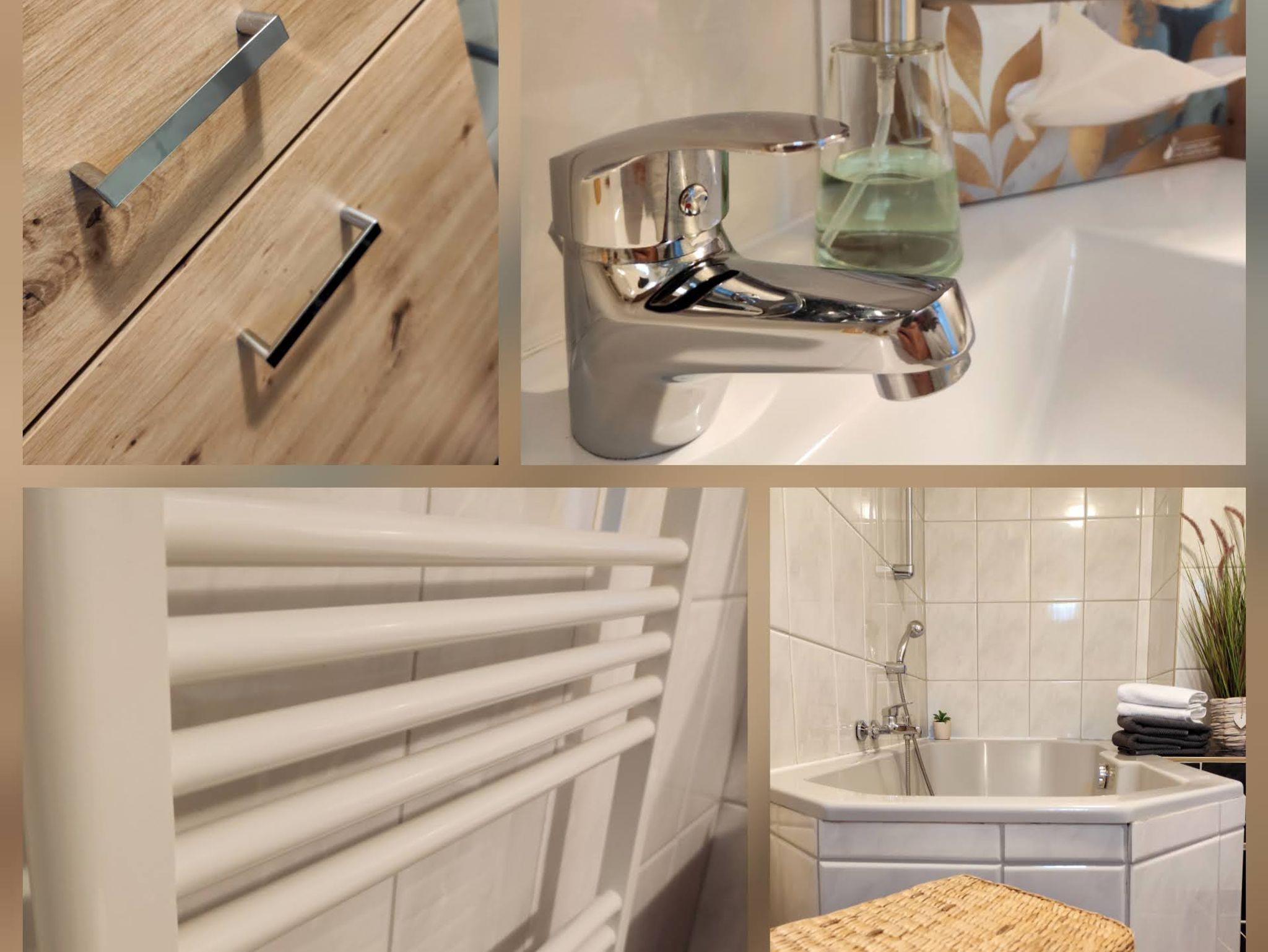 Das moderne Ferienhaus bietet ein Schlafzimmer, ein Badezimmer mit Badewanne, eine voll ausgestattete Küche mit Essbereich, ein Wohnzimmer mit ausziehbarem Sofa, Flachbild-Sat-TV und einen Business-Corner. Weitere Annehmlichkeiten umfassen einen Haartrockner, eine Mikrowelle, einen Kühlschrank mit Gefrierfach, einen Wasserkocher, einen Herd mit Cerankochfeld und eine Kaffeemaschine.