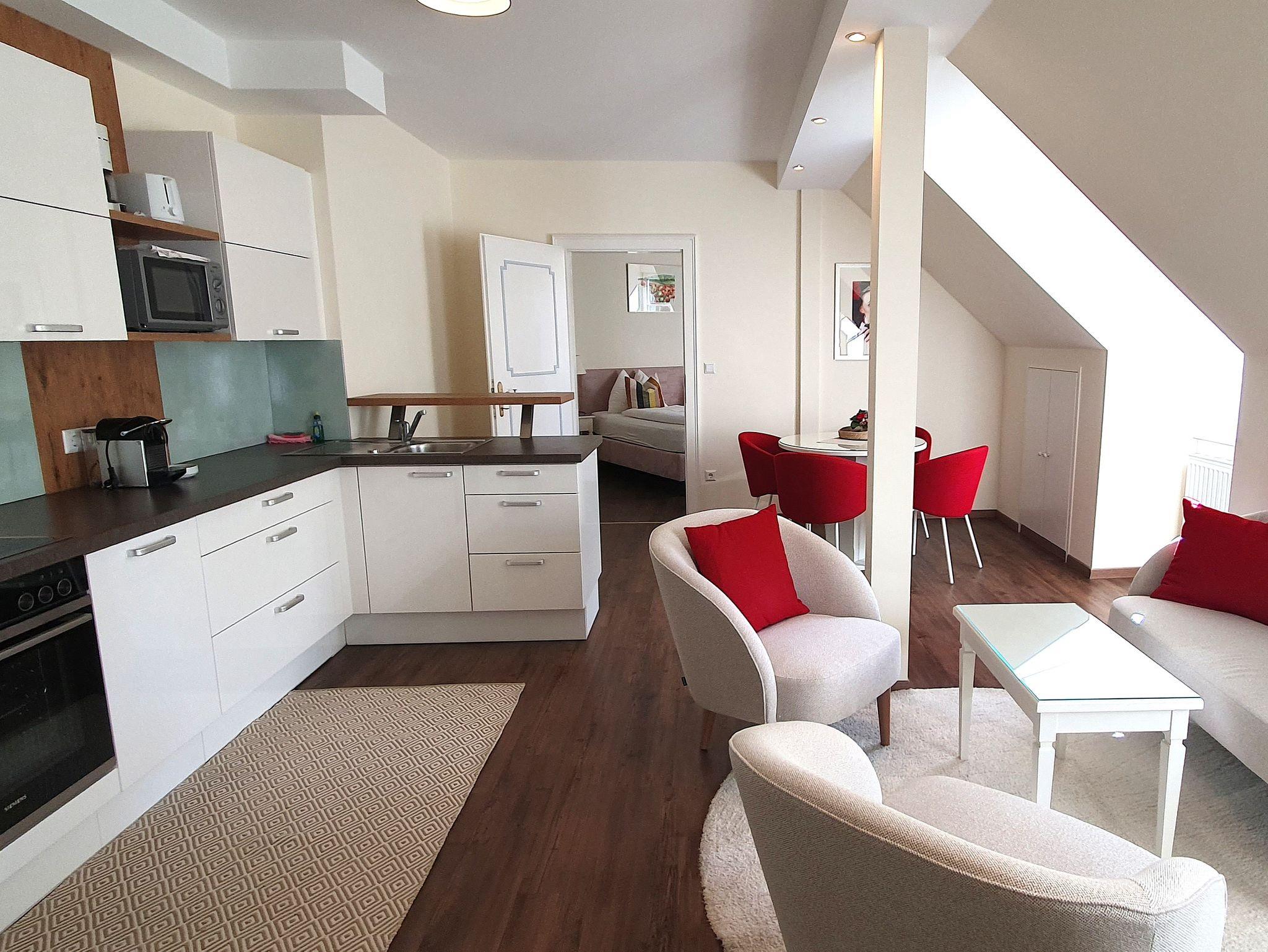 Zur Einrichtung gehören ebenso ein flat TV, ein Telefon und ein Safe. Die Ferienwohnung bietet herrlichen Weitblick auf die berühmten Spitzer Weinterrassen und die historische Pfarrkirche.