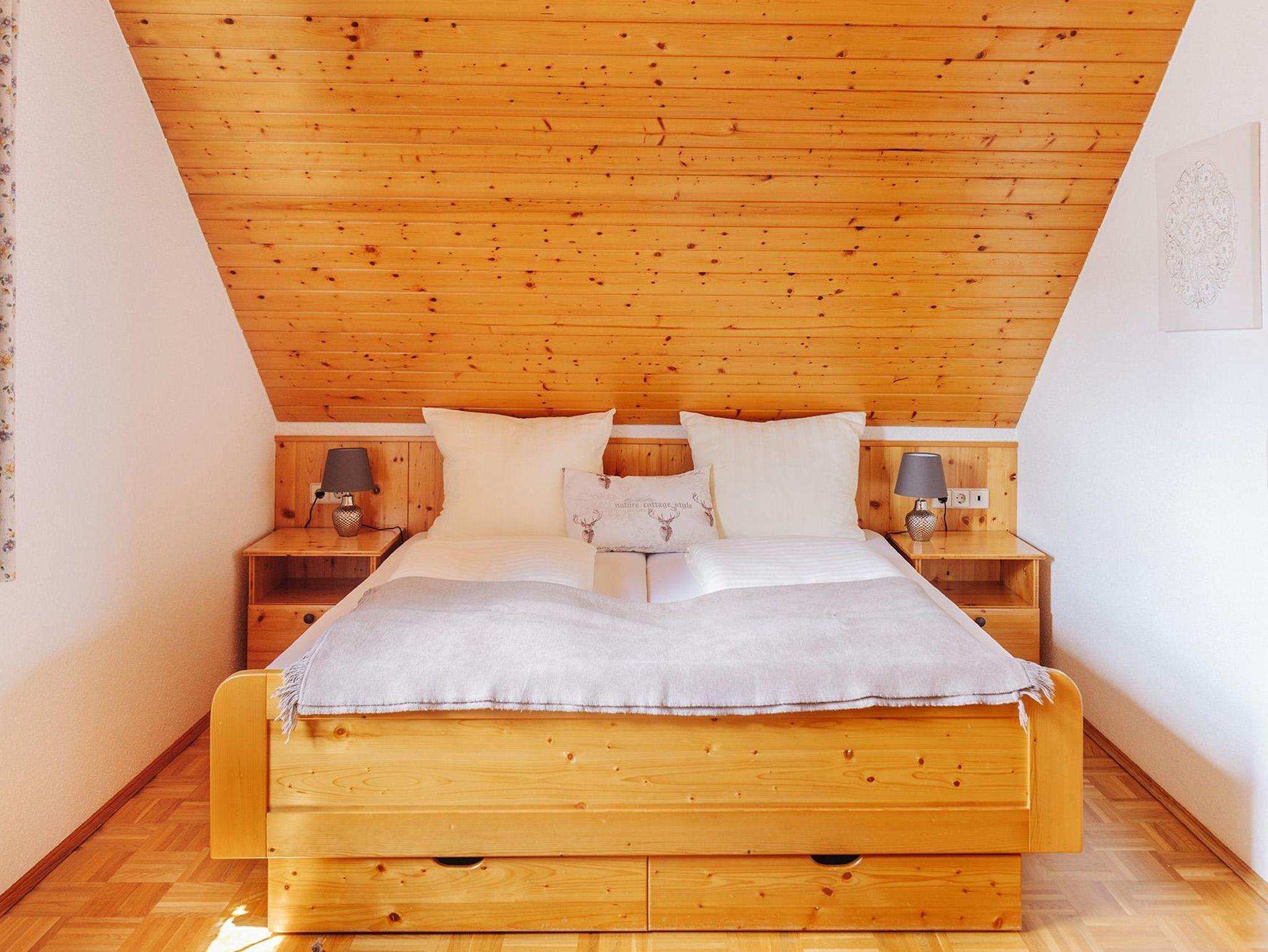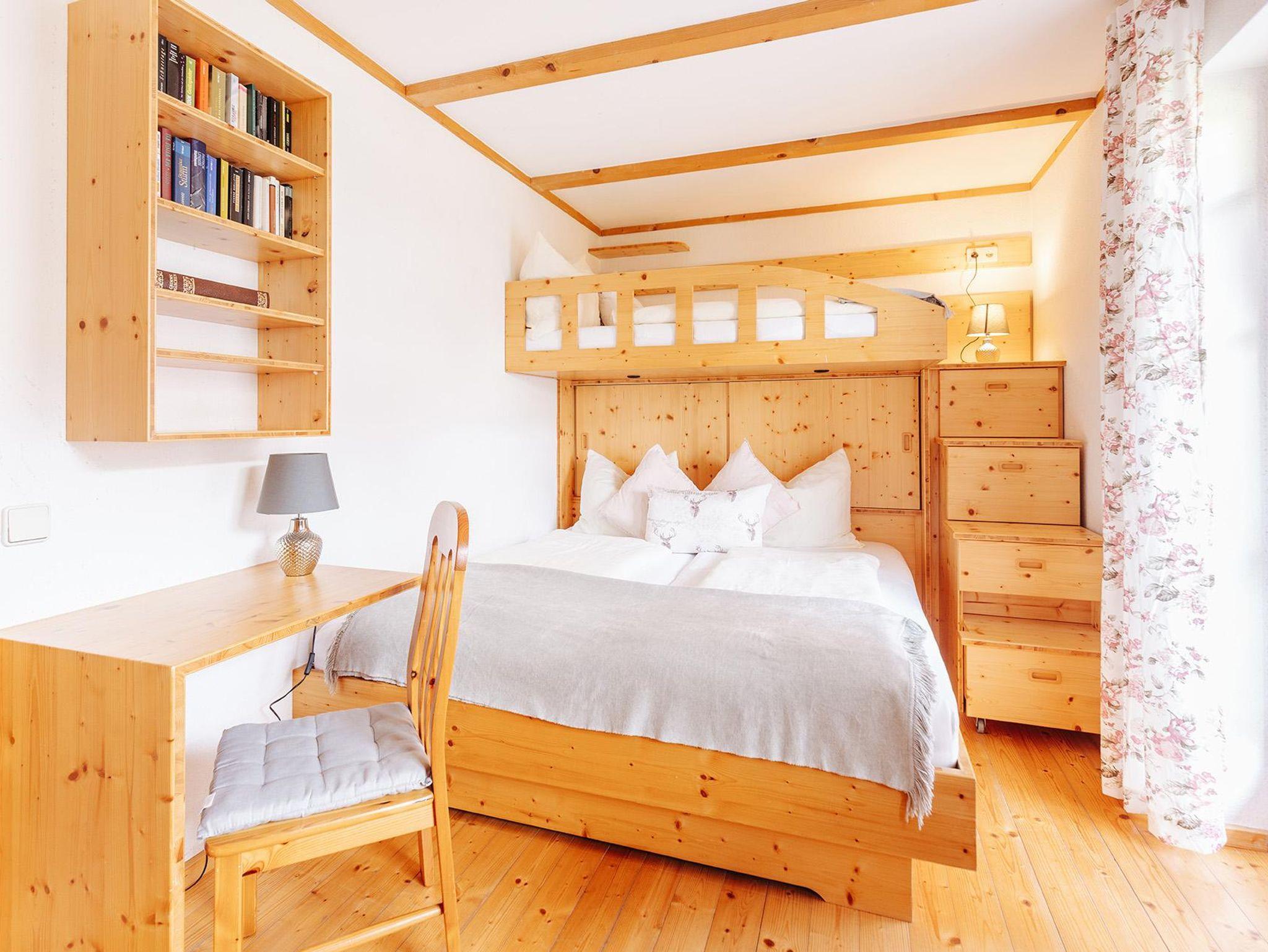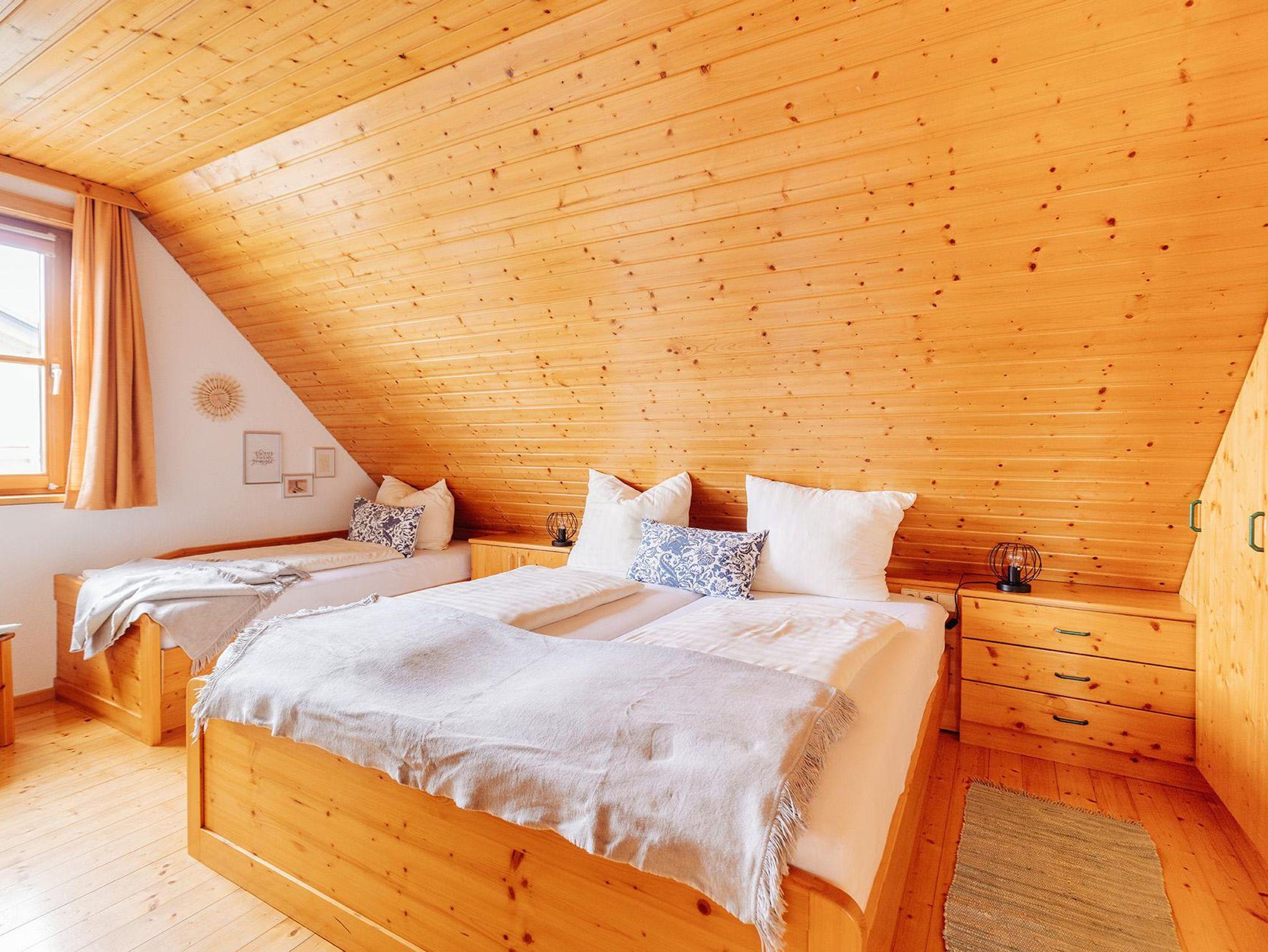 • Ein Schlafzimmer mit einem Doppelbett sowie ein Schlafzimmer mit zwei Schlafcouchen für bis zu 4 Personen mit Vollholzmöbel und Baumwollbettwäsche