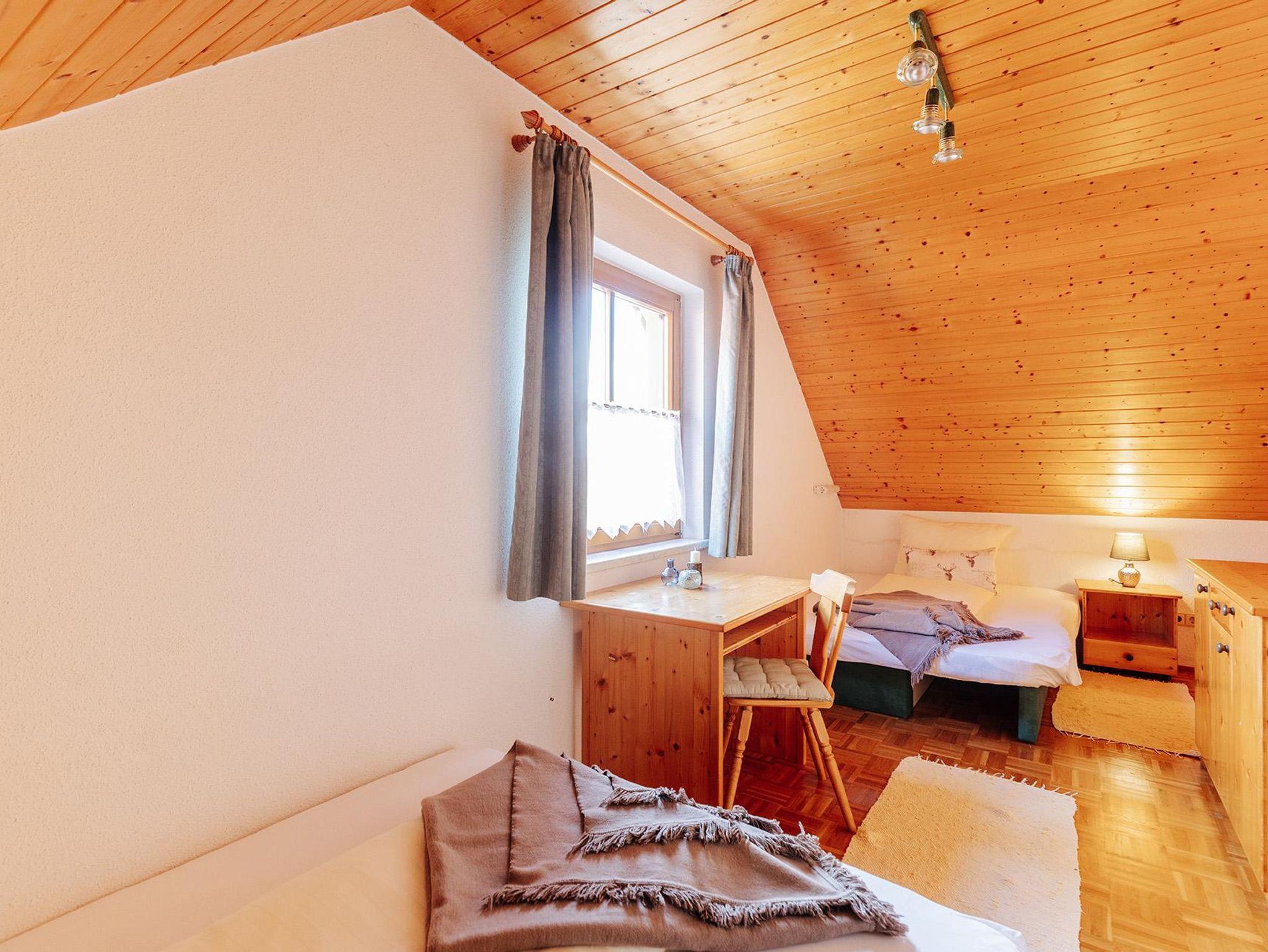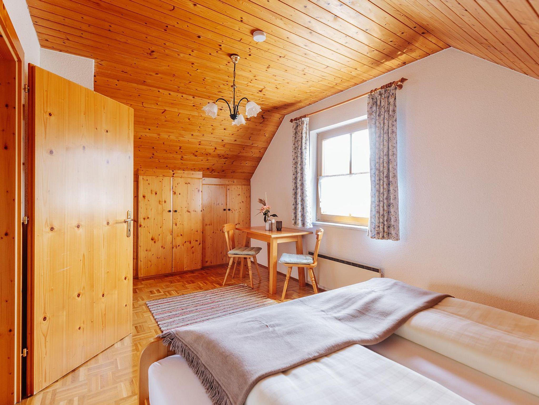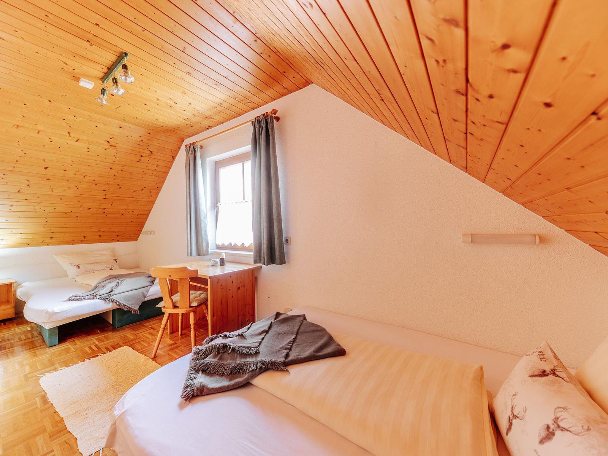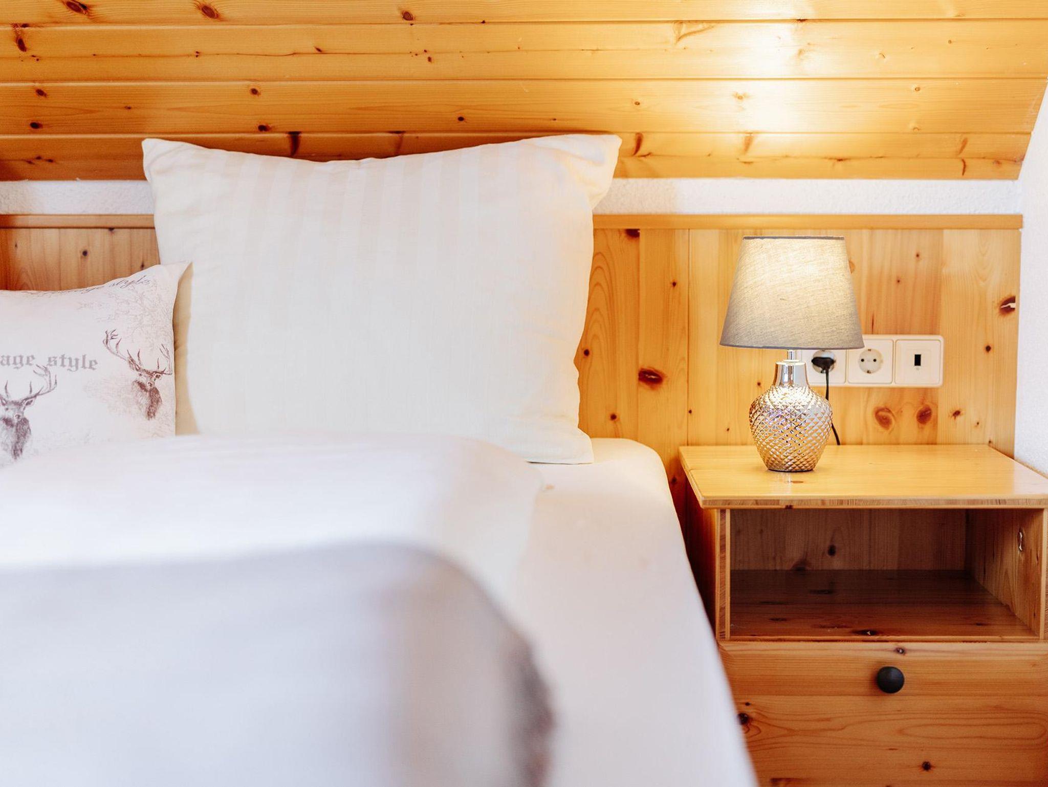 • Ein Schlafzimmer mit einem Doppelbett sowie ein Schlafzimmer mit zwei Schlafcouchen für bis zu 4 Personen mit Vollholzmöbel und Baumwollbettwäsche