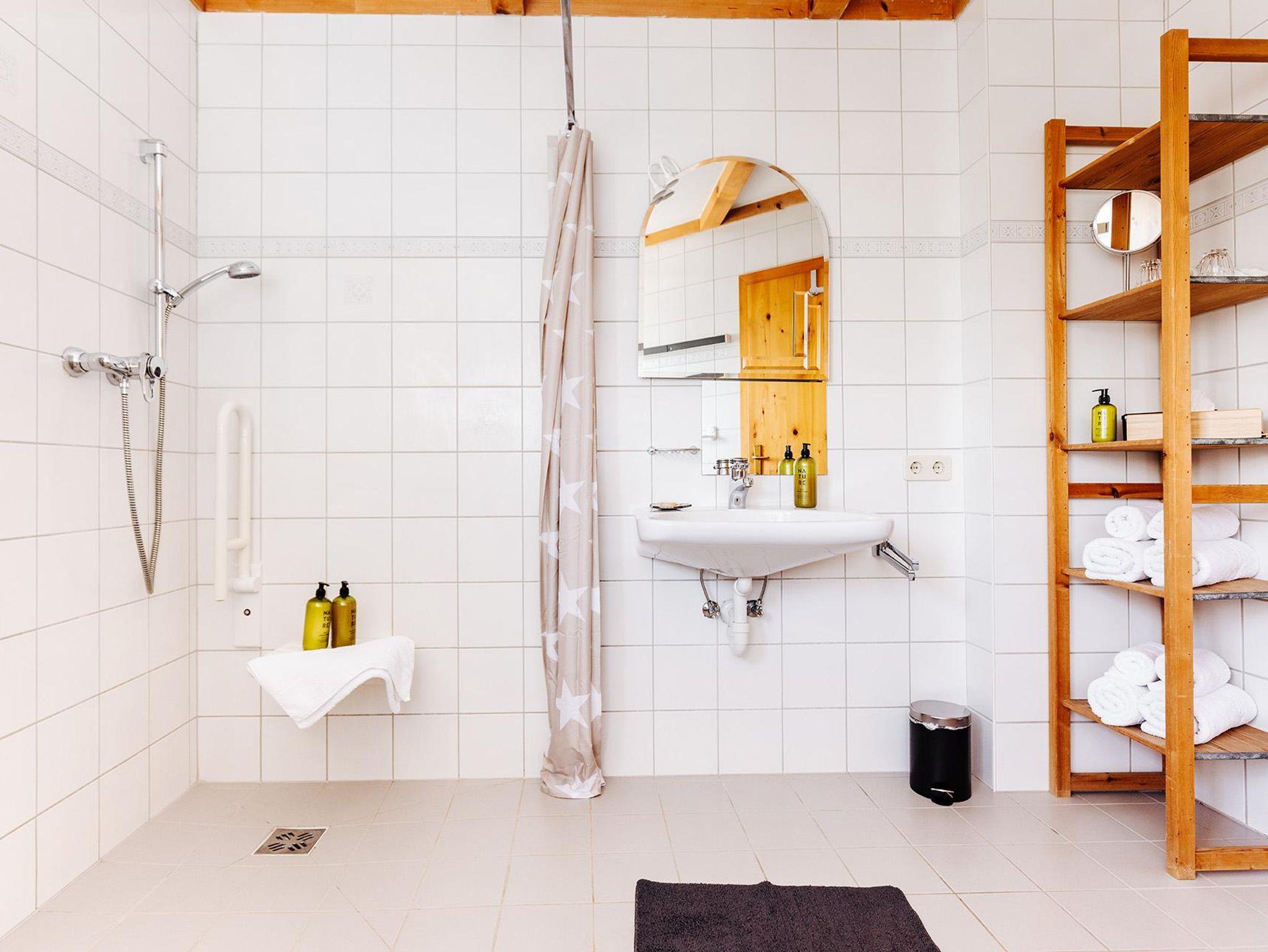Ein besonderes Highlight des Ferienhaus Nora ist, dass ein Apartment vollkommen Barrierefrei und rollstuhlfreundlich eingerichtet ist. Die Küche ist teilweise unterfahrbar und auch die Dusche ist befahrbar. Das WC verfügt über Haltegriffe