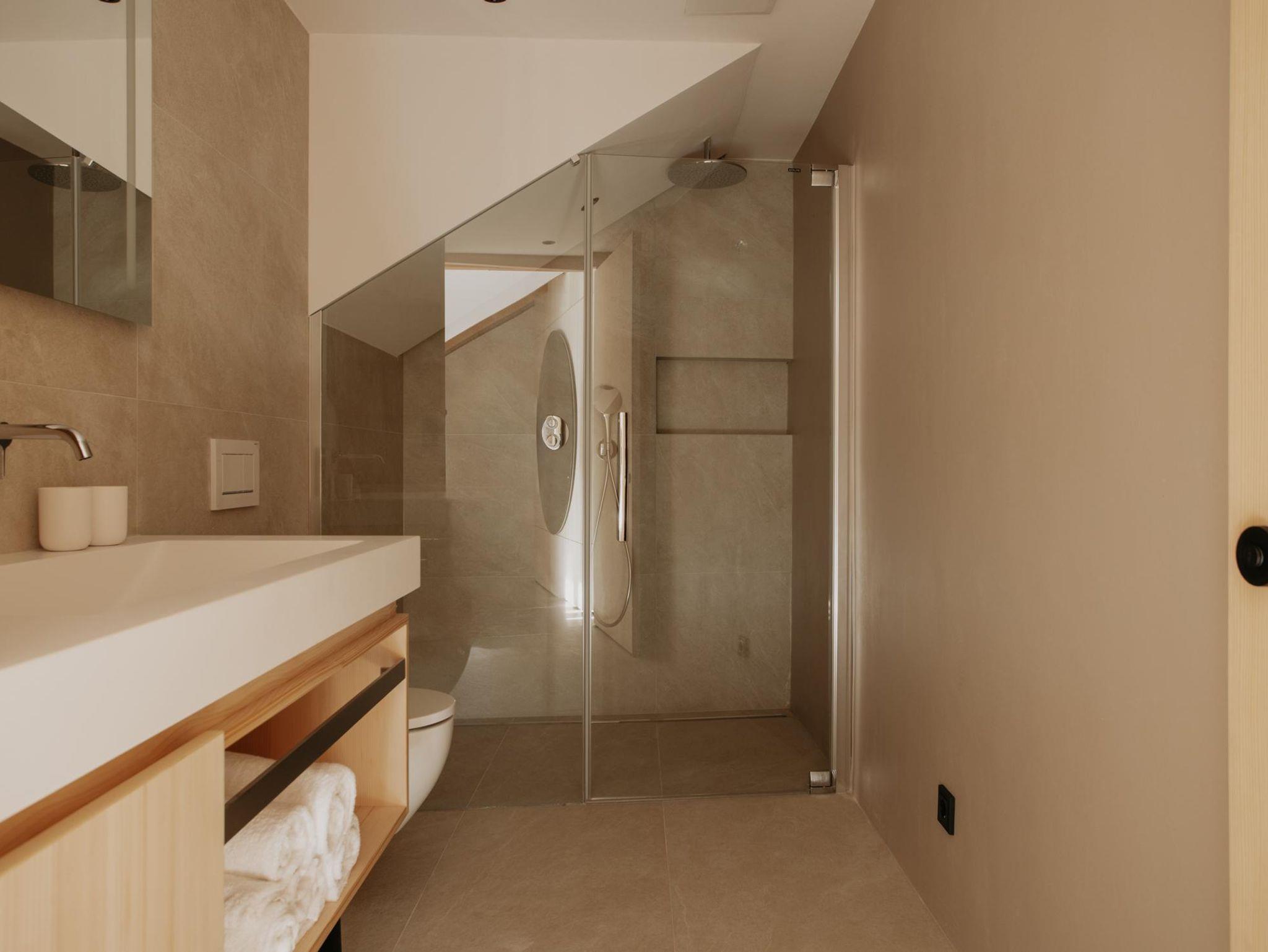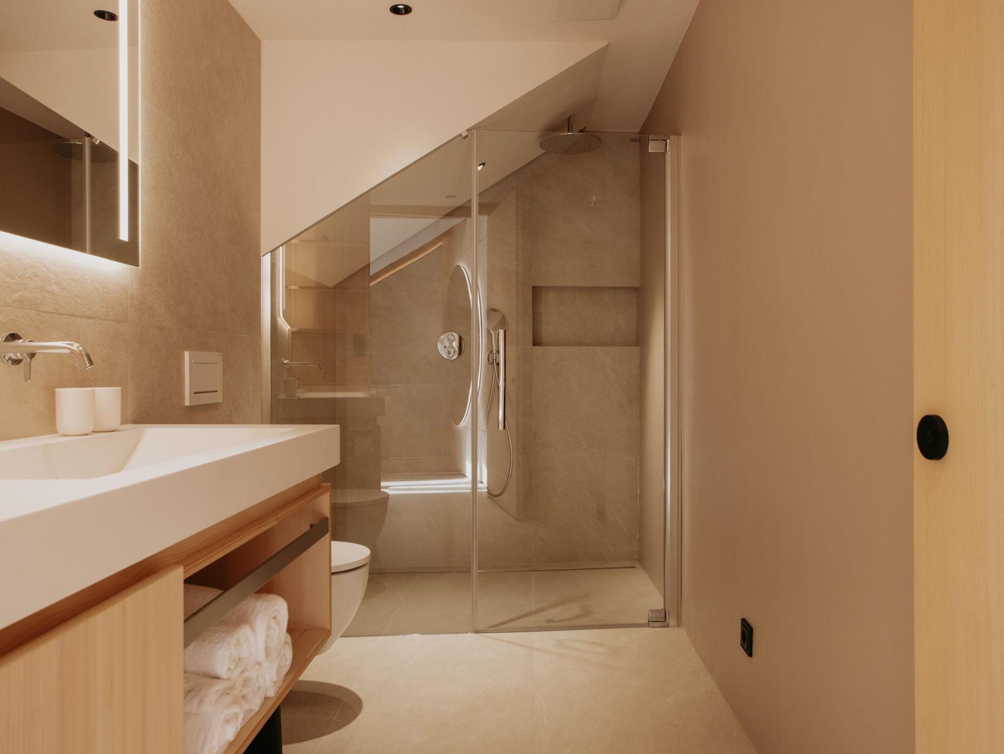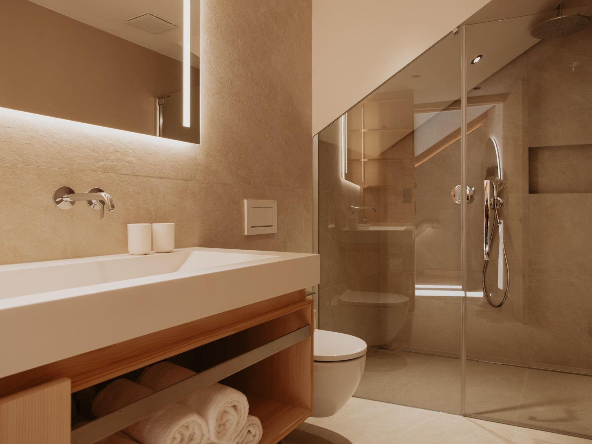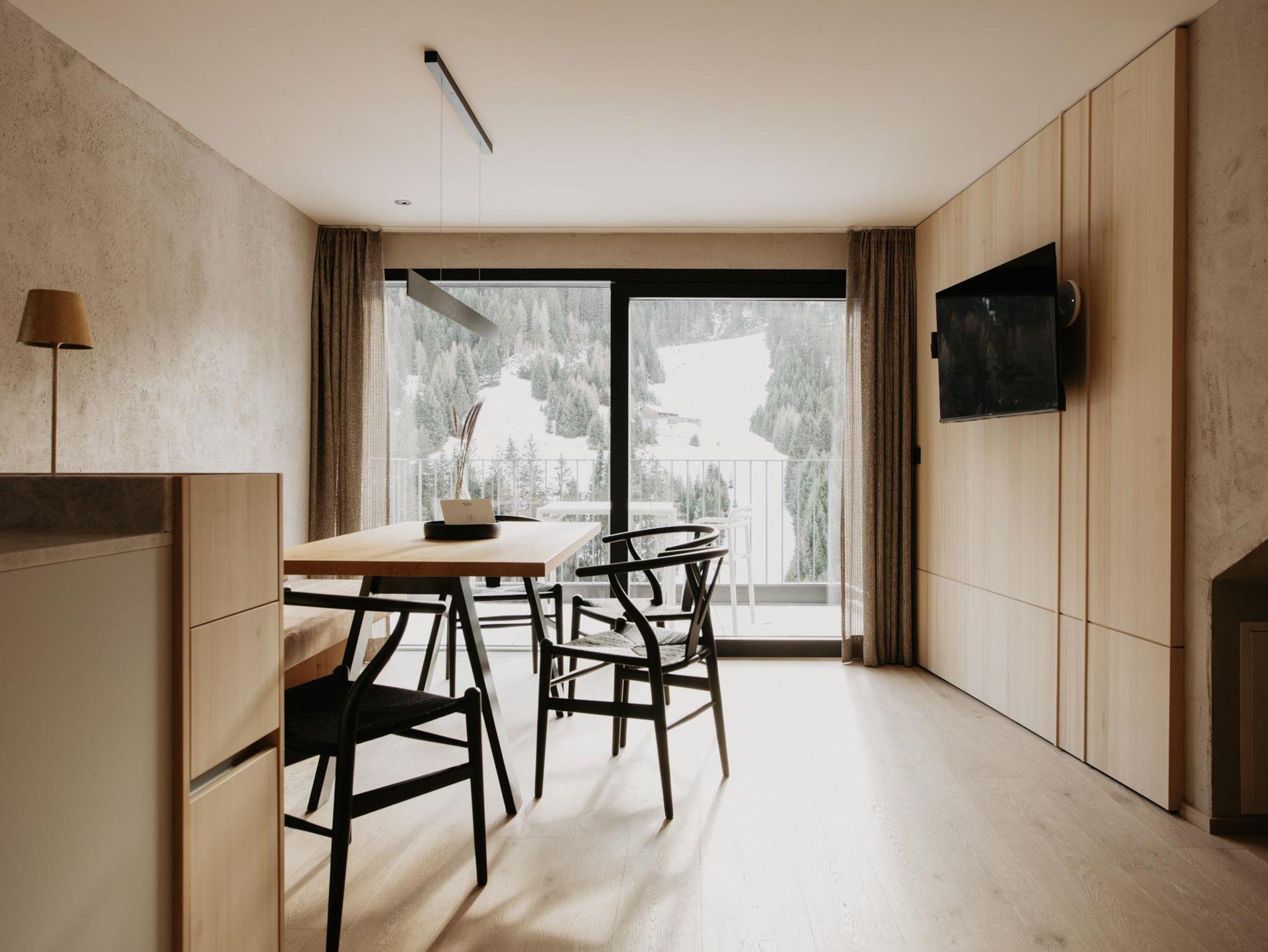 Toms View Premium Apartment 1 erstreckt sich über zwei Ebenen und bietet auf 66?m² Platz für bis zu 4 Personen. Im Obergeschoss haben Sie ein Schlafzimmer mit Doppelbett und Badezimmer. Im Erdgeschoss gibt es eine voll ausgestattete Küche mit offenem Wohn- und Essbereich. Die Schlafcouch bietet Platz für zwei weitere Personen, und von hier aus gelangen Sie auf den Balkon mit herrlichem Blick auf die Berge. Außerdem haben Sie im Untergeschoss Zugang zum Fitness- und Wellnessbereich.