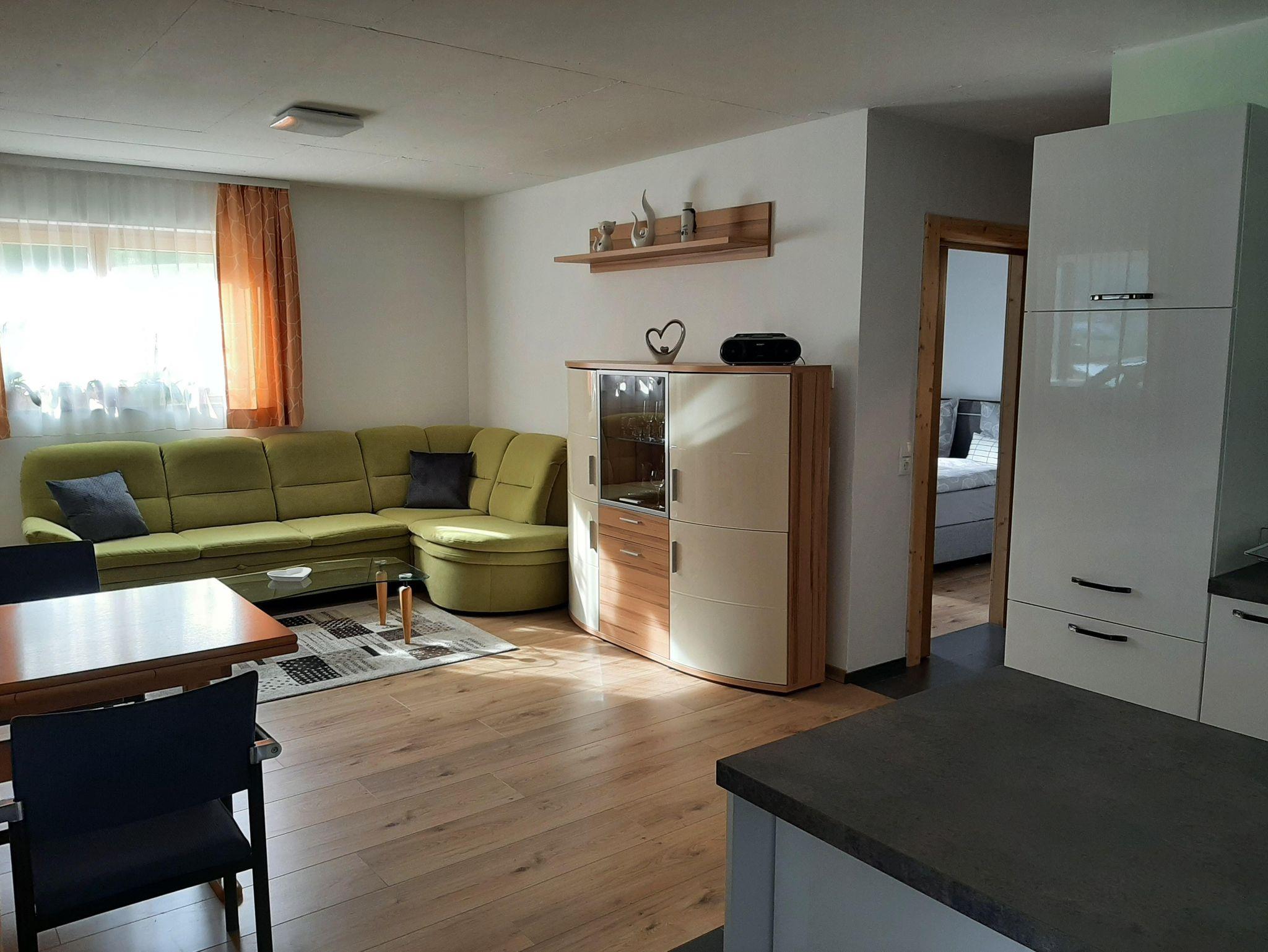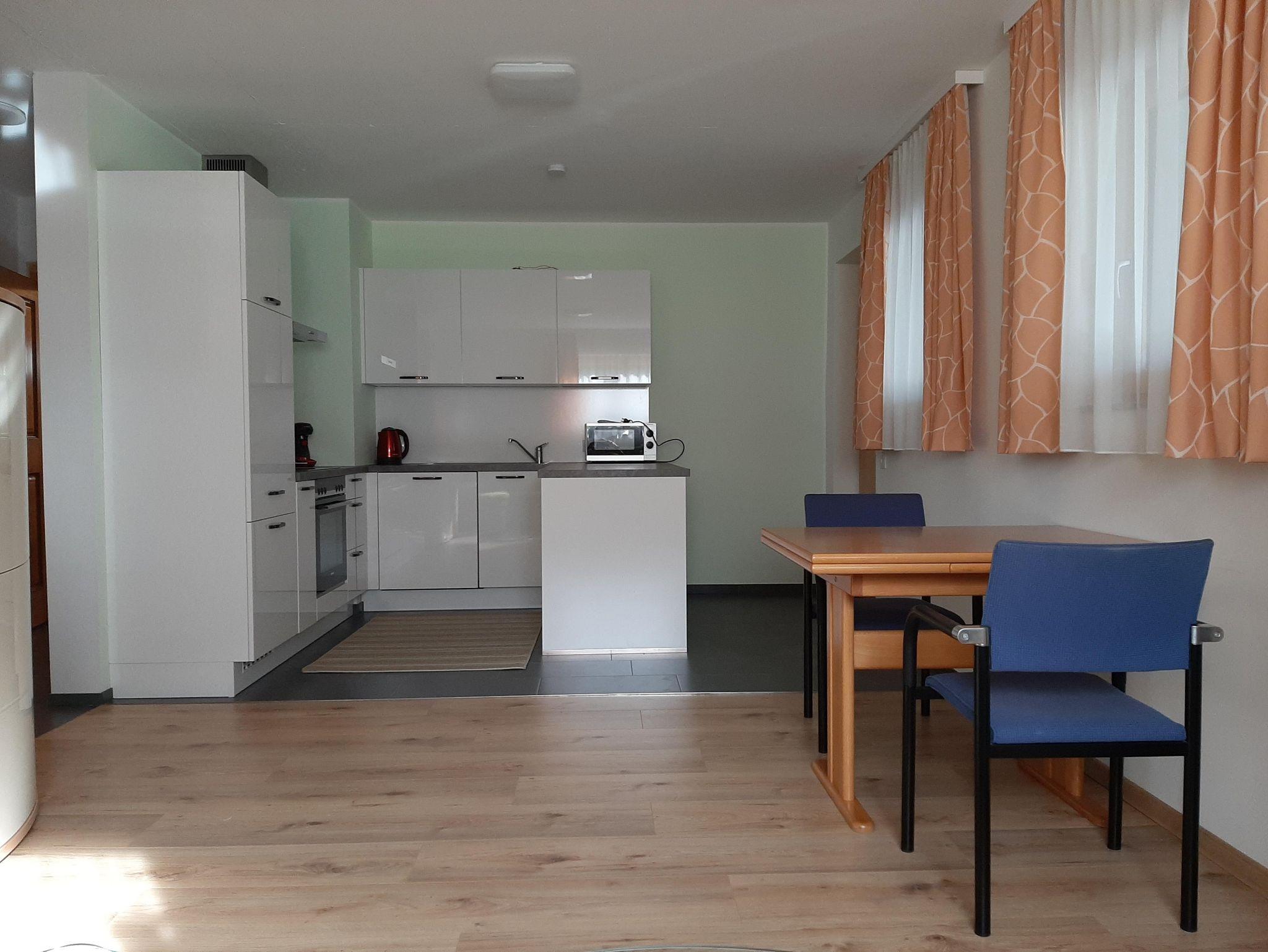 Die vollmöbelierte Ferienwohnung im Haus ist ebenerdig. Im offenen Wohn/Essbereich befindet sich eine komplett ausgestattete Küche (Herd, Backrohr, Geschirrspüler, Mikrowelle, Kaffeemaschine, Wasserkocher usw.). Im Wohnbereich befindet sich ein TV, Radio und eine gemütliche Schlafchouch. Das Schlafzimmer ist mit einem Boxspringbett und einem Kleiderkasten möbeliert.