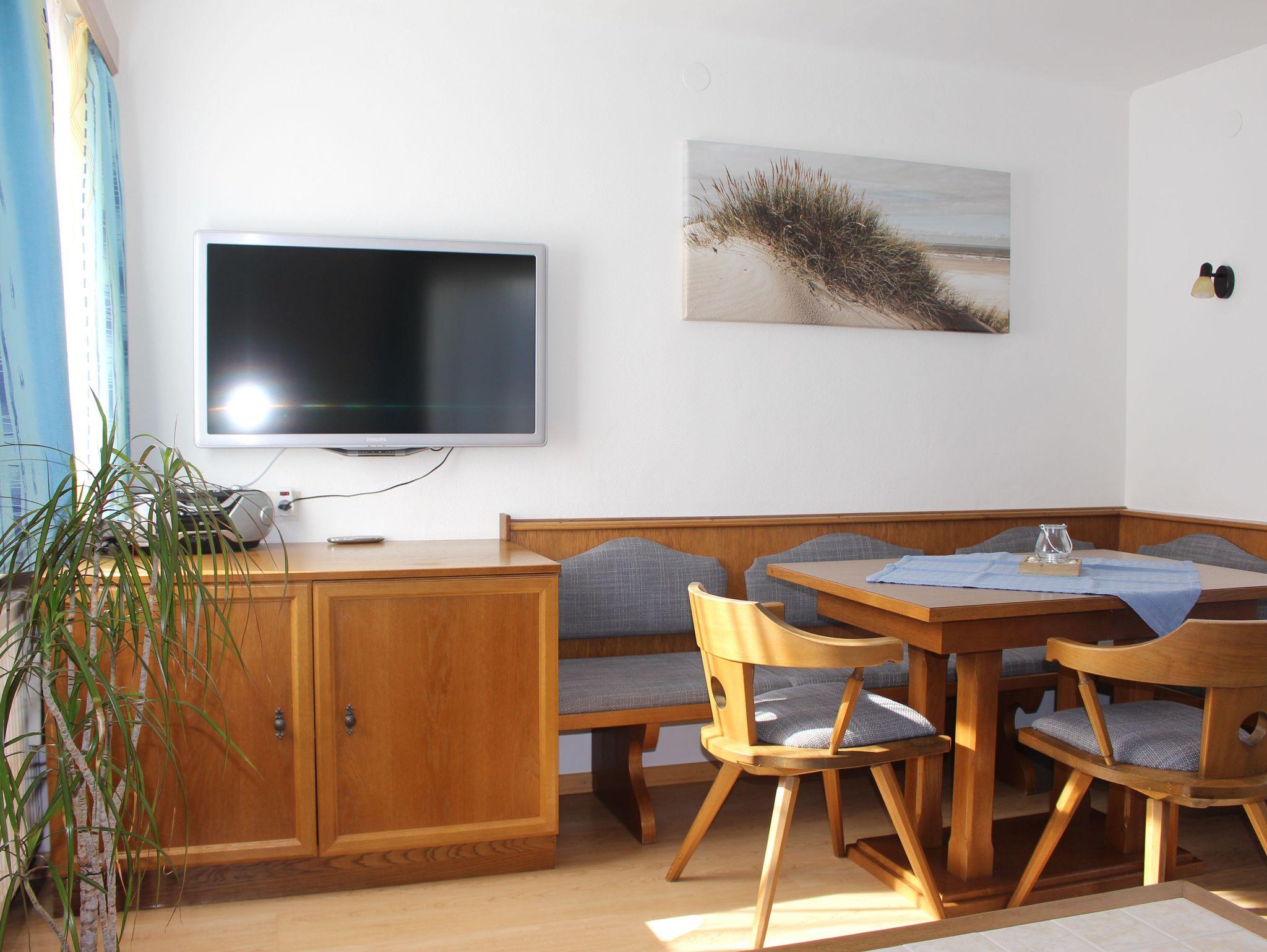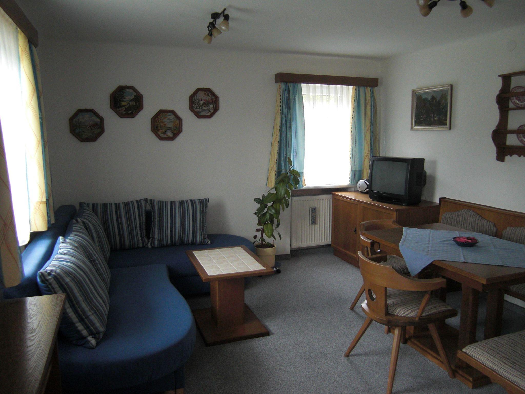Im gemütlich eingerichteten Wohnzimmer befindet sich eine rustikale Essecke und eine ausziehbare Couchecke, welche bei Belegung durch 5 Personen als Schlafstelle dient.