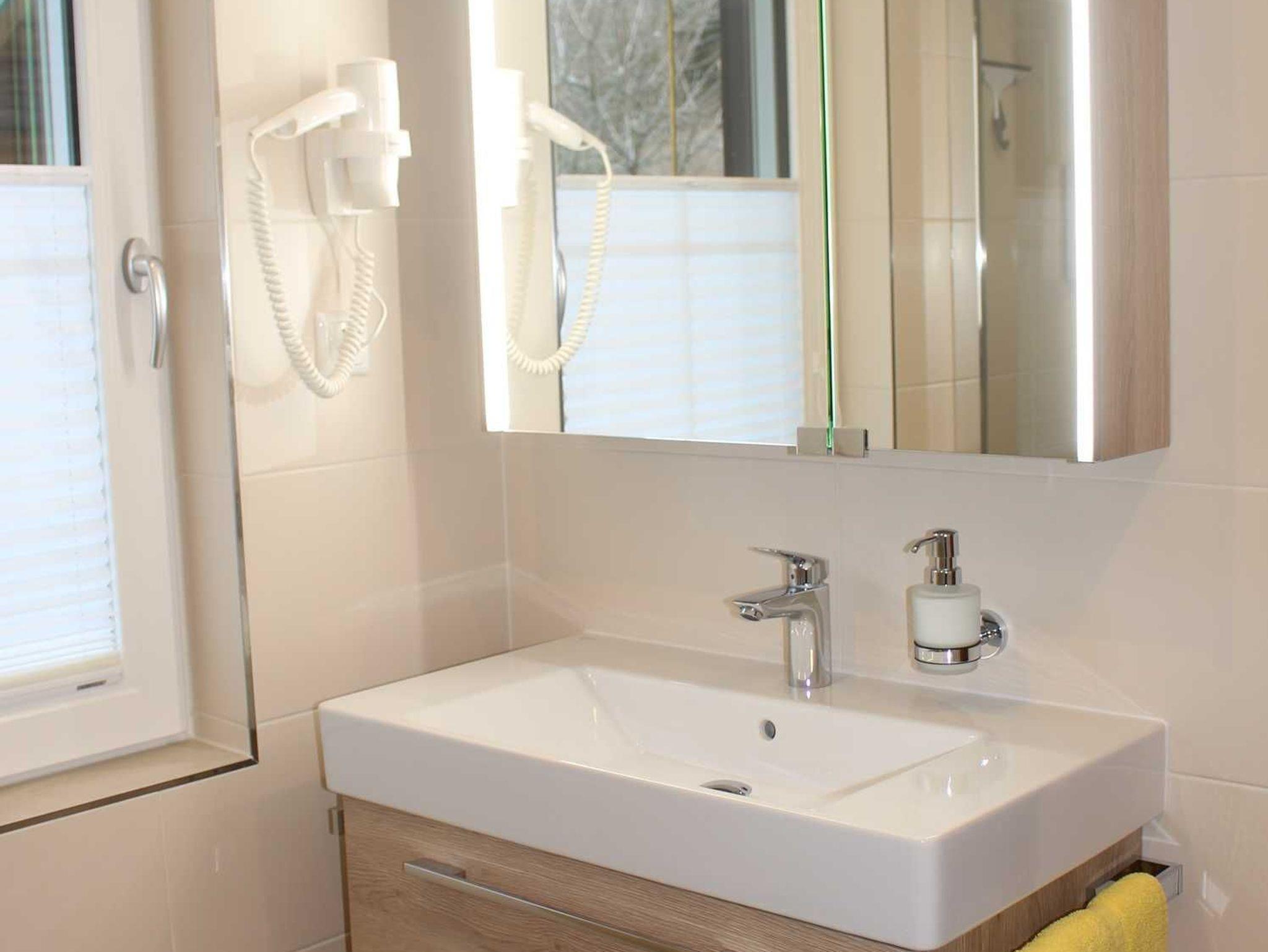 Das geräumige Bad verfügt über eine Badewanne mit Duschmöglichkeit, Waschbecken und einen Haarfön.