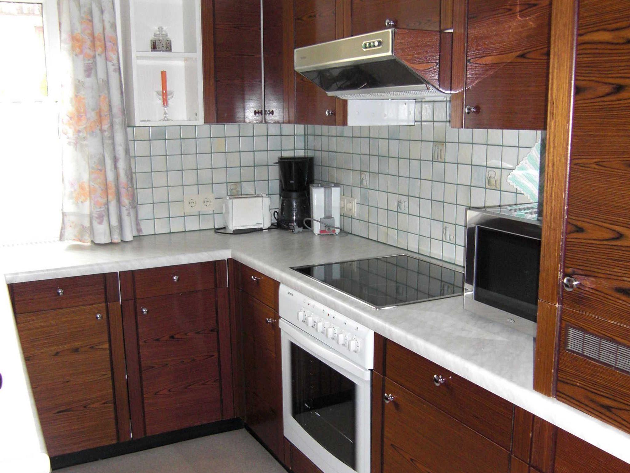 Die Küche ist mit E-Herd, Spüle, Kühlschrank mit Gefrierfach, Geschirrspüler, Wasserkocher, Mikrowellenherd, Dunstabzug und genügend Koch- und Essgeschirr ausgestattet.