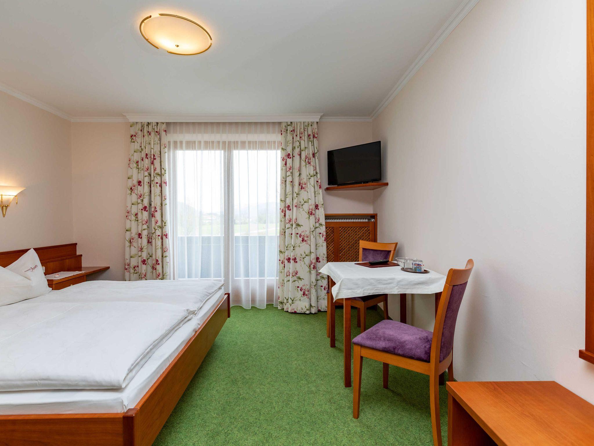Unsere Doppelzimmer sind im ersten Stock unseres Hauses. Der Blick richtet sich auf eine herrliche Berglandschaft und in die großzügige Gartenanlage mit neuem beheiztem Pool. Die Zimmer sind gemütlich eingerichtet. Einen schönen Balkon hat jedes Zimmer. Ein Gästekühlschrank ist am Gang.