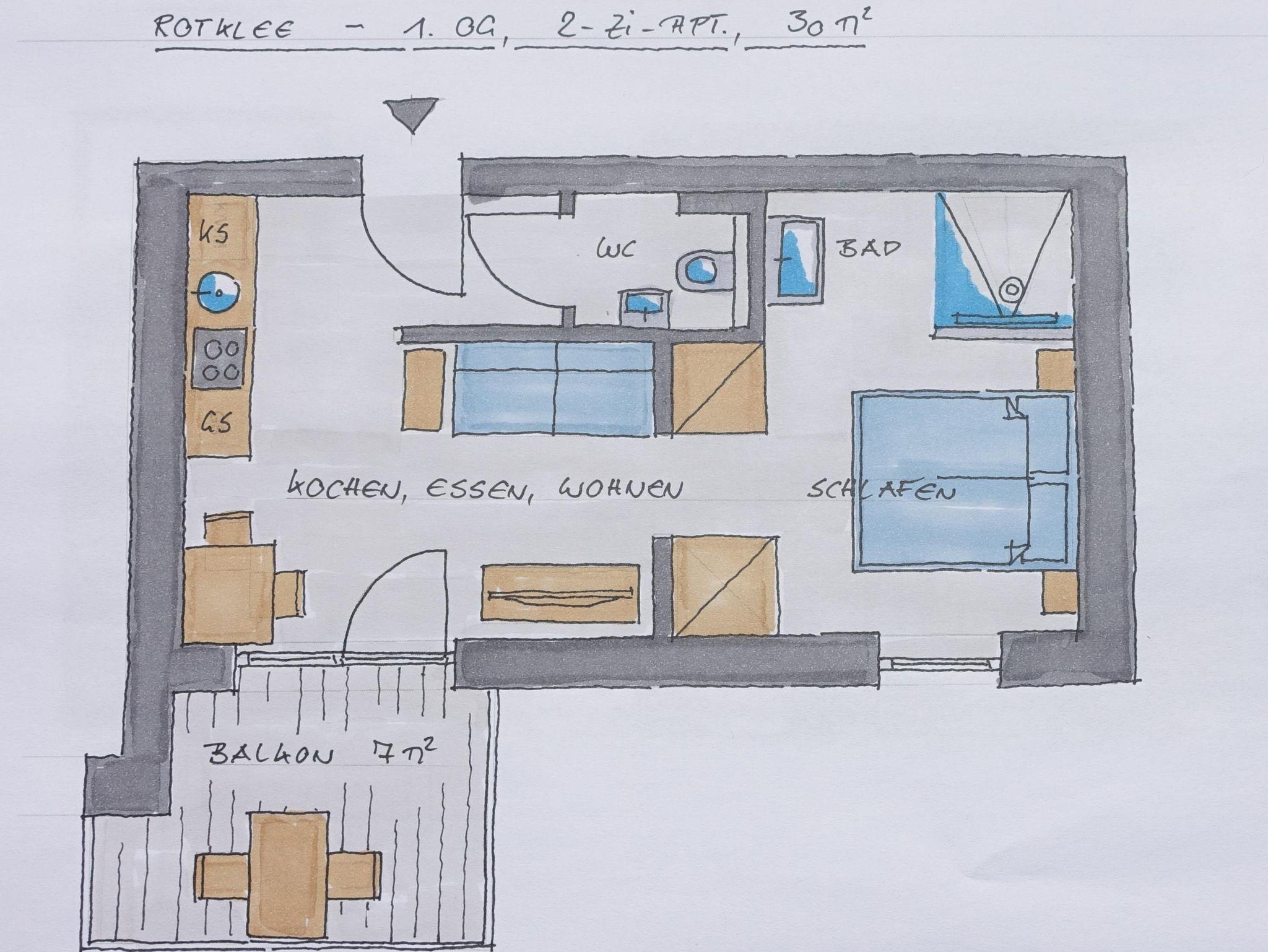 Dieses gemütliche Appartement mit 30 m² mit Südausrichtung liegt im 1. Stock, es hat einen sonnigen Balkon und Blick in den oberen Garten. Der gemütliche Wohn-Essbereich mit vollausgestatteter Küche und Flat-screen TV lädt zum Verweilen ein.