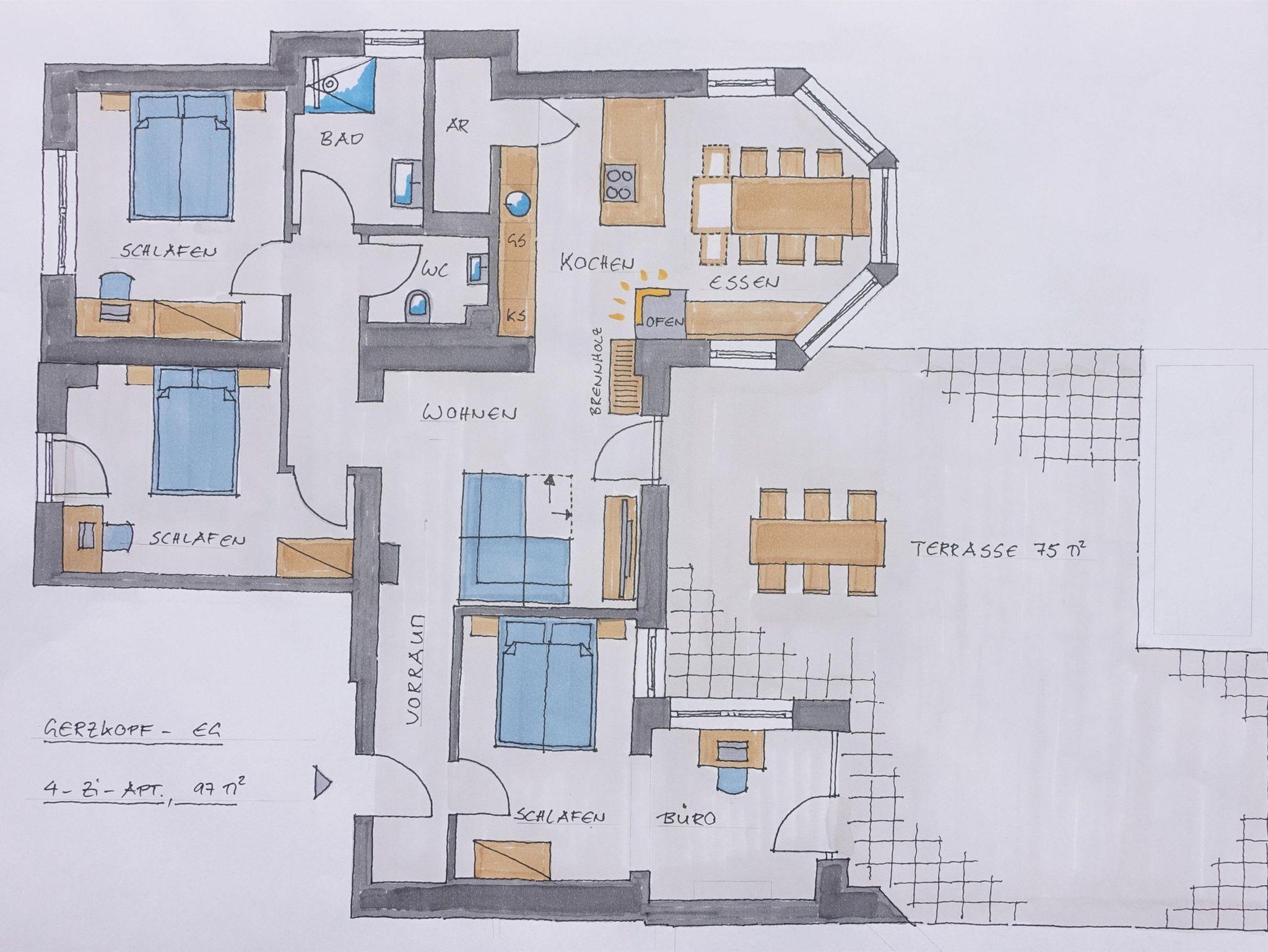 Dieses große Appartement mit 98 m² im Erdgeschoss hat eine ca. 60 m² Terrasse Richtung Süden und grenzt an den Garten mit Kinderspielplatz an. Es gibt eine vollausgestattete Küche mit großzügigem Essbereich, der zum Verweilen einlädt. Ein Highlight ist der gemütliche Holzofen zwischen Wohn- und Essbereich.