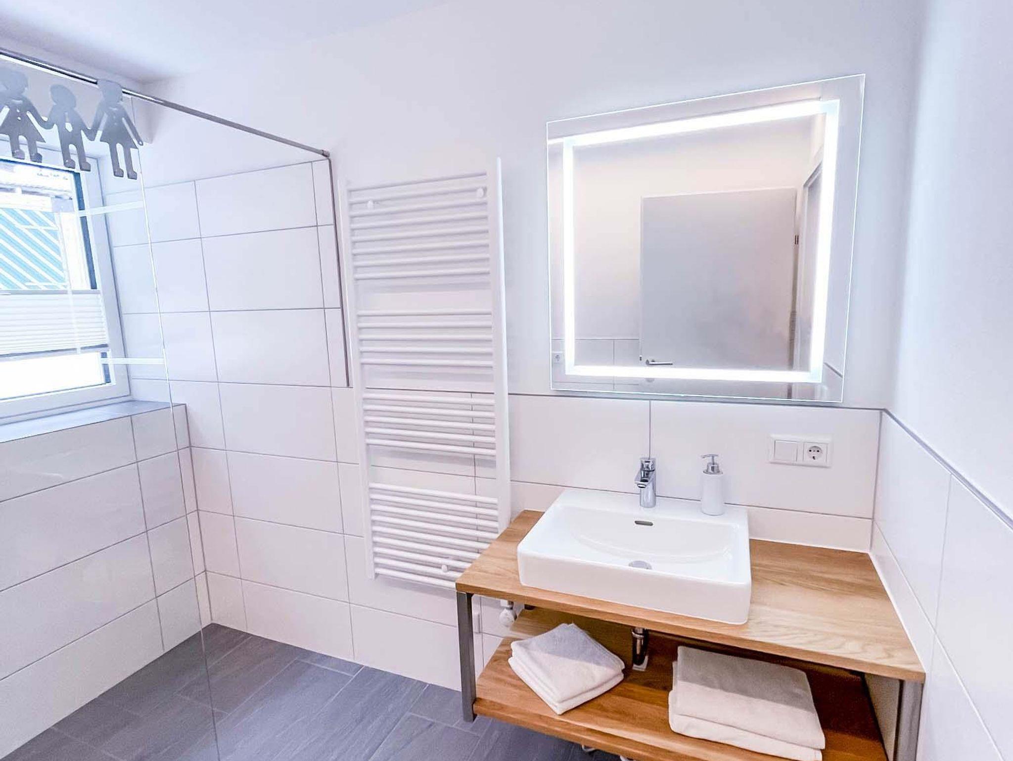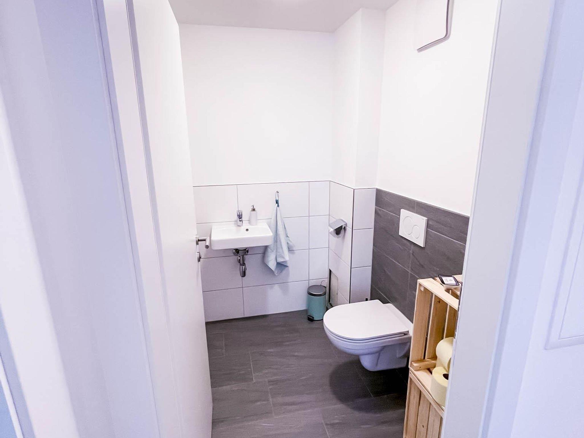 Es gibt ein Badezimmer mit Dusche und Fön sowie ein separates WC.