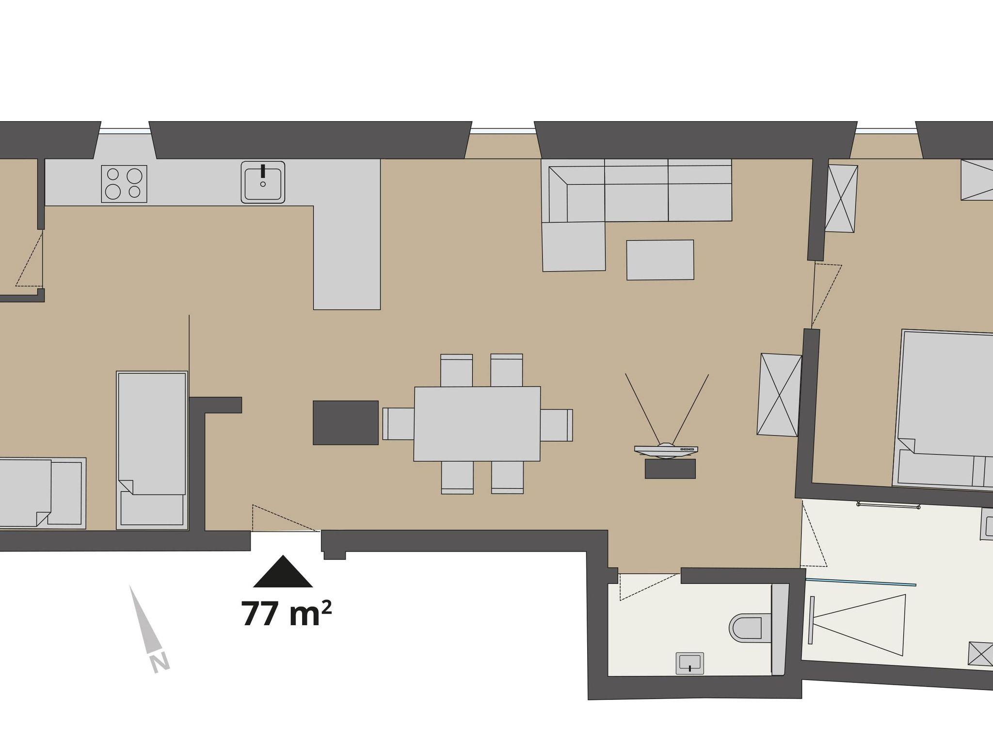 Das großzügige Apartment hat eine Fläche von 77m2 und Platz fu¨r bis zu 6 Personen. Es besteht aus einer offenen Wohnküche mit kleinem Abstellraum, einem ausziehbaren Ecksofa, TV, einem Schlafzimmer mit Platz fu¨r ein Gitterbett, einer mit einem schweren Vorhang abgetrennten Niesche mit 2 Einzelbetten, einem Bad mit Dusche und Waschmaschine sowie einem separaten WC mit Waschbecken. Das Apartement wurde 2023 renoviert.