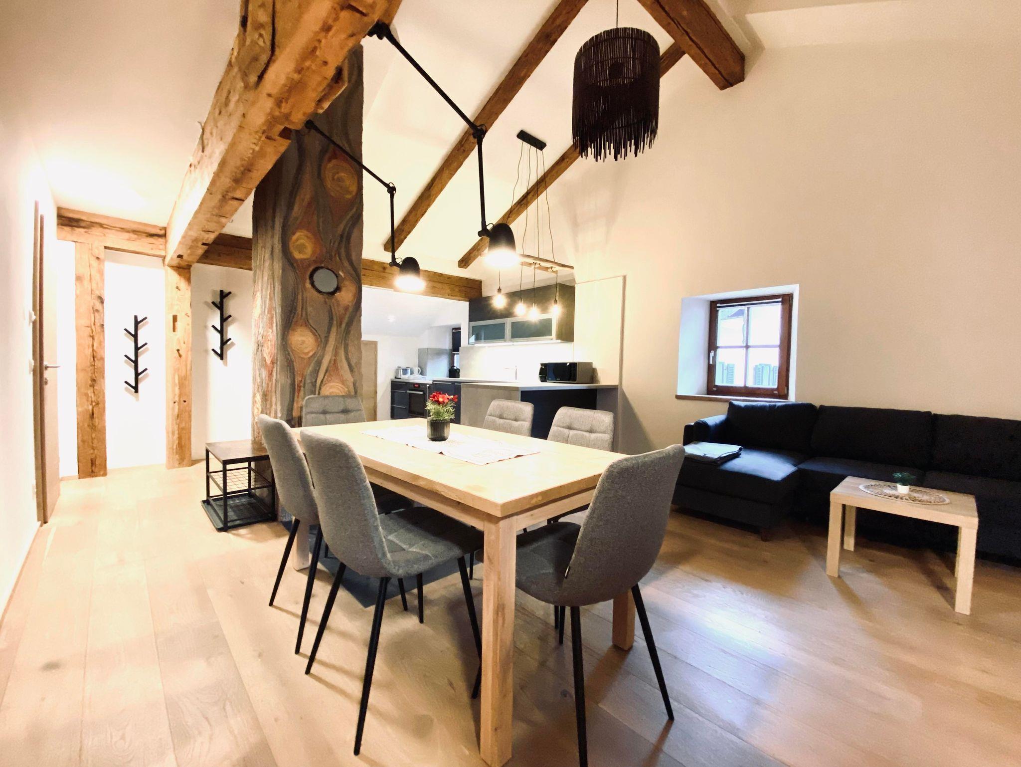 Unsere größte Ferienwohnung erinnert mit ihrer Deckenhöhe von über 5 Metern und den sichtbaren Altholz-Balken an ein gemütliches Loft.