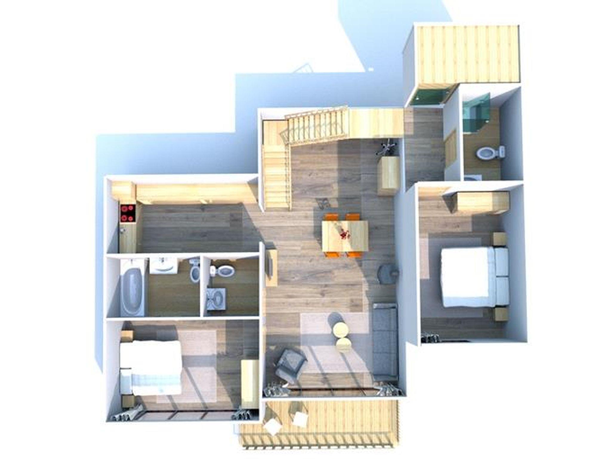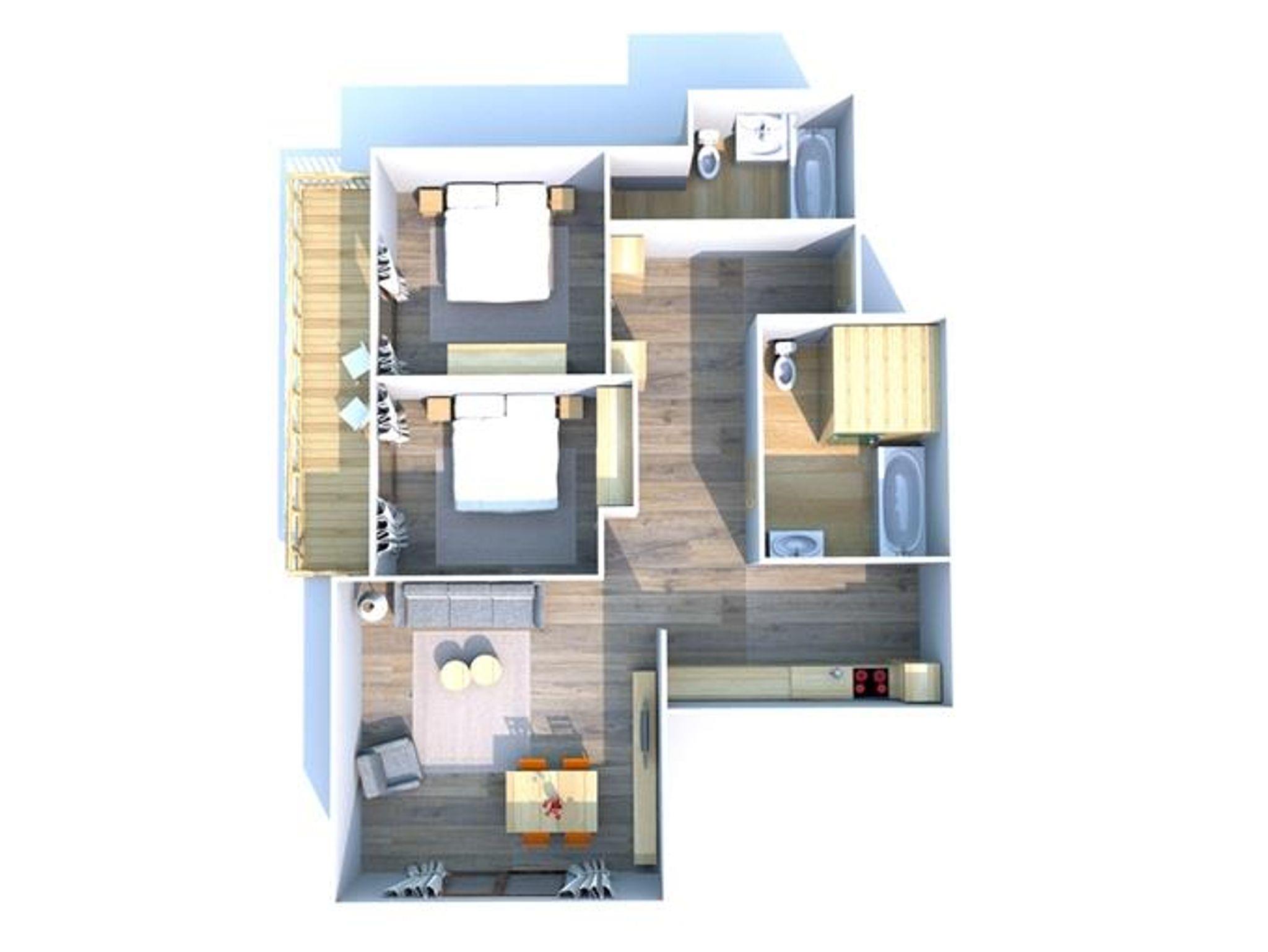 2 Schlafzimmer mit je 1 Doppelbett, Wohn-Schlafzimmer mit Essbereich und Küche (Kochplatte, Backofen, Mikrowelle, Kaffeemaschine, Geschirrspüler, Teekocher, Geschirrset, Kühlschrank mit Gefrierfach), TV, Safe, 2 Badezimmer mit Badewanne oder Dusche und WC, Balkon