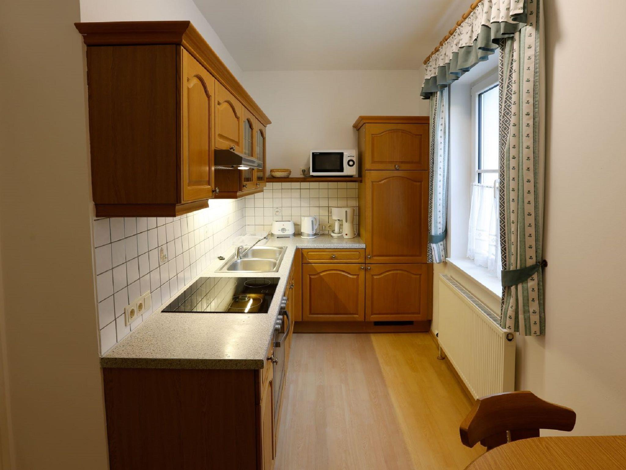 Die Küche ist ausgestattet mit Kühlschrank, Geschirrspüler, Herd, Mikrowelle, Kaffeemaschine, Wasserkocher und Toaster.