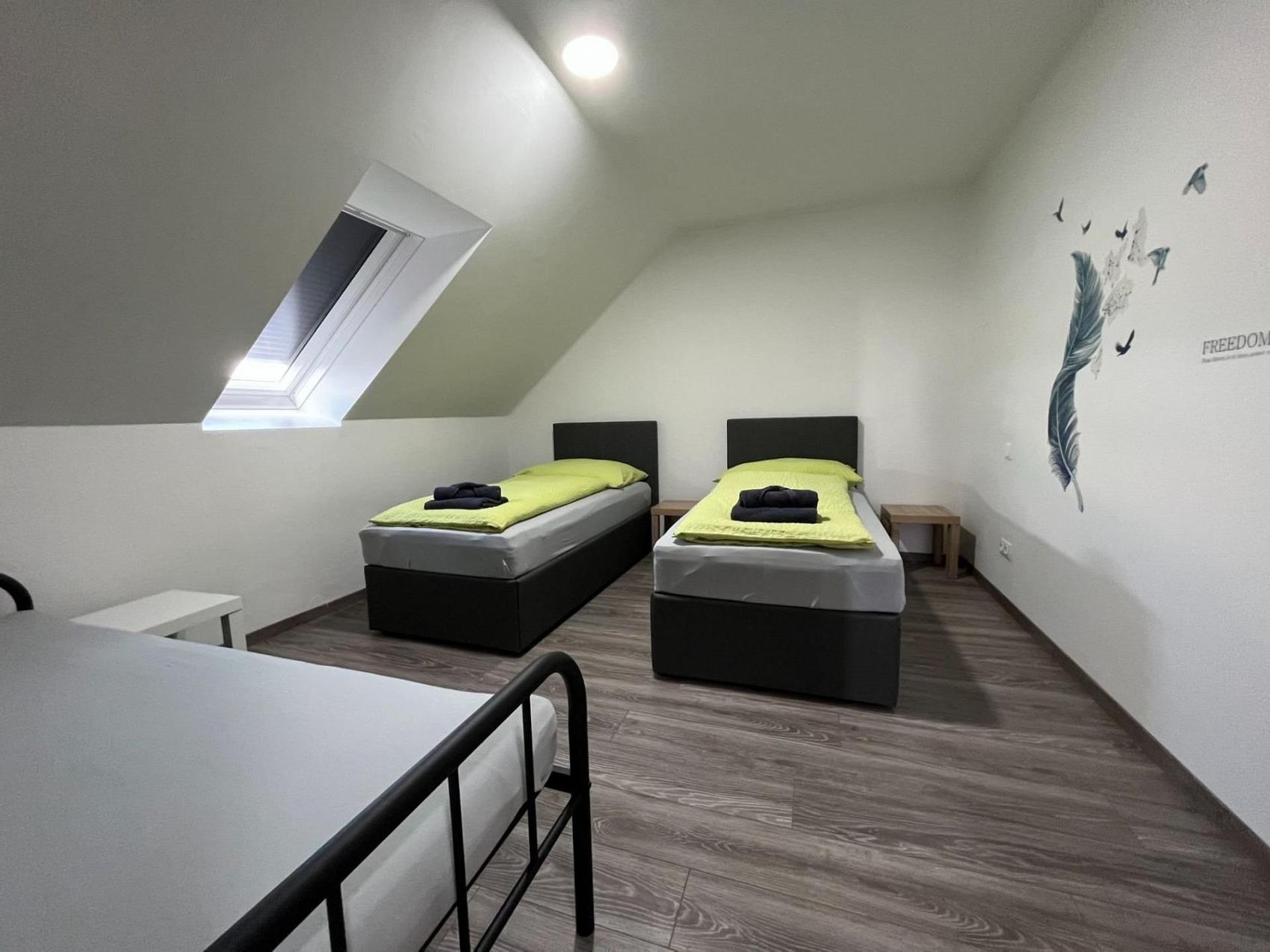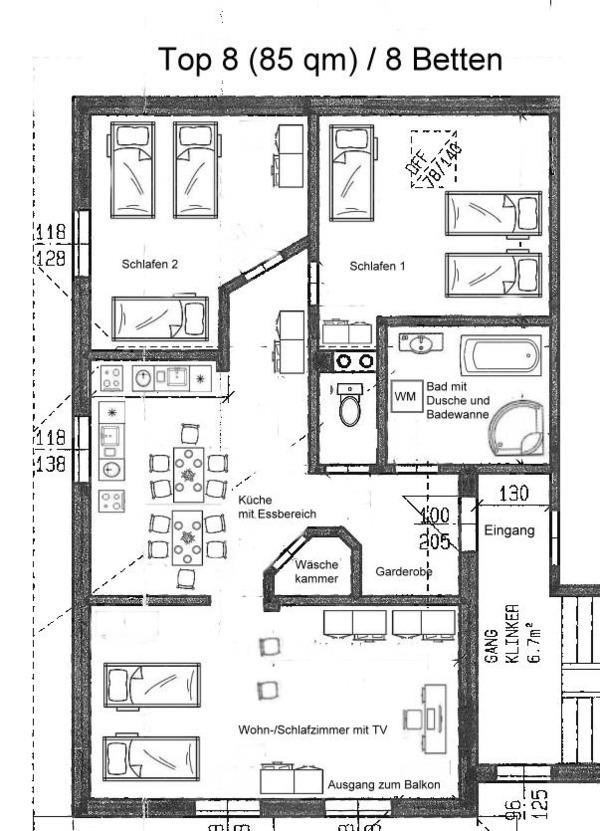 Im Apartment befinden sich ausschließlich hochwertige Einzelbetten (6 Boxspringbetten) sowie 2 stabile Gästebetten aus Metall(90 x 200 cm). Die Boxbetten können jeweils zu einem großen Kingsize-Bett zusammengestellt werden ohne "Besucherritze".