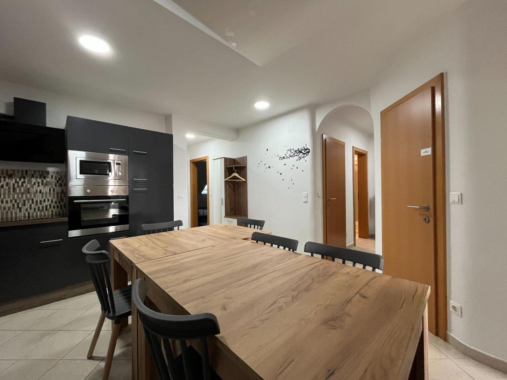 Das Apartment im 2. Stock ist ausgestattet mit kompletter Küche, Herd, Backofen, Mikrowelle, Kühlschrank mit Gefrierfach und Waschmaschine (10 kg).