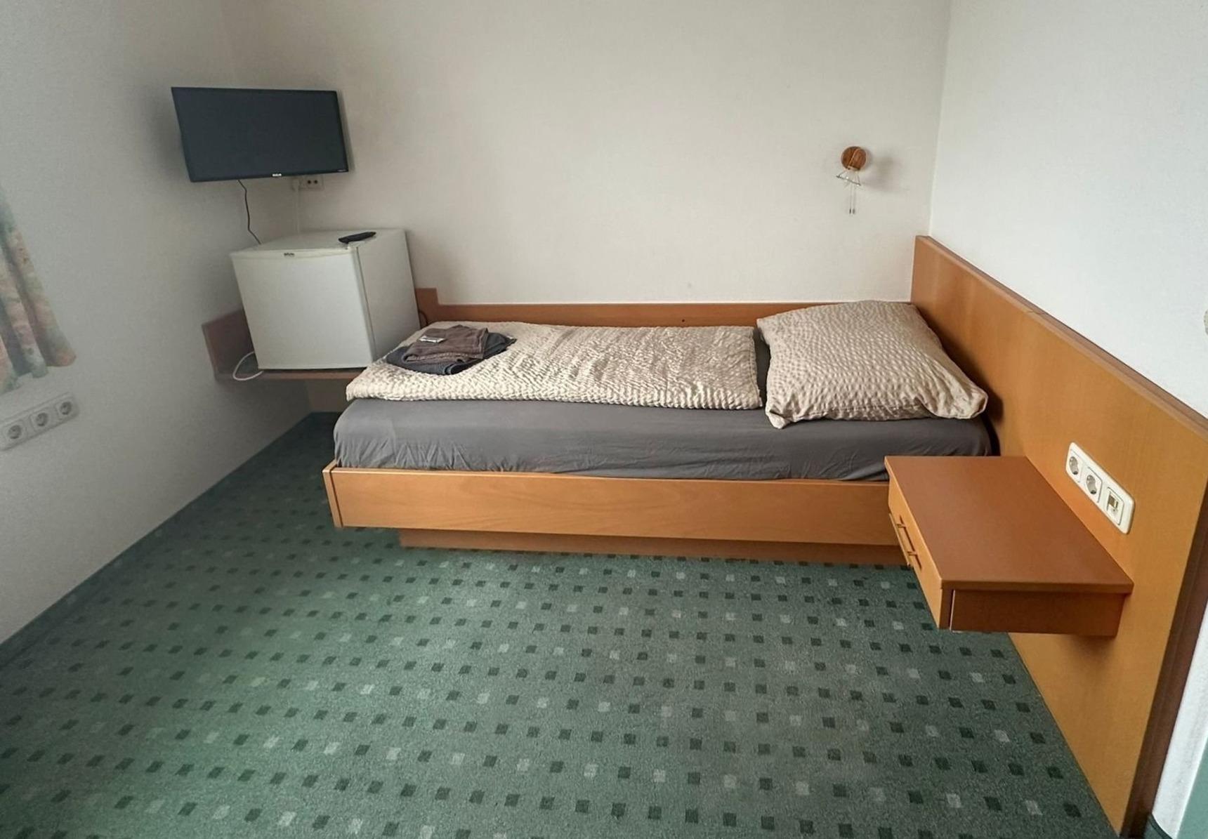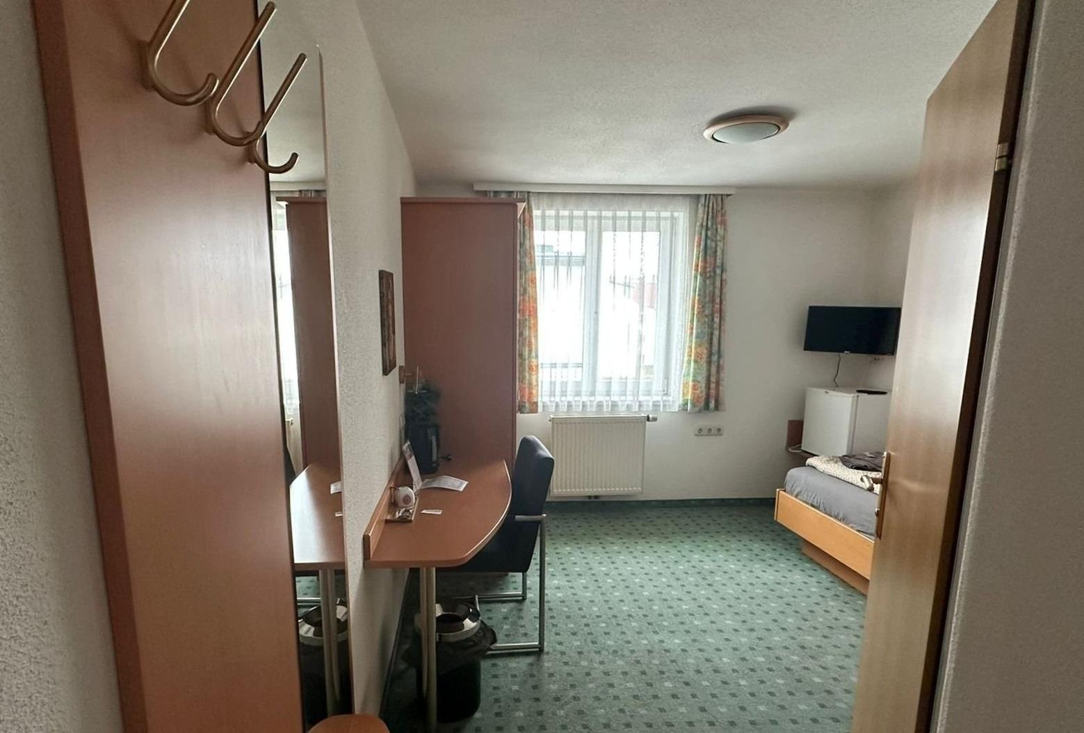 Ihr Einzelzimmer Nr. 203 im 2. Stock ist ausgestattet mit einem Einzelbett, Schreibtisch, Kühlschrank mit Gefrierfach, Wasserkocher, TV, WLAN, Duschbad/WC.