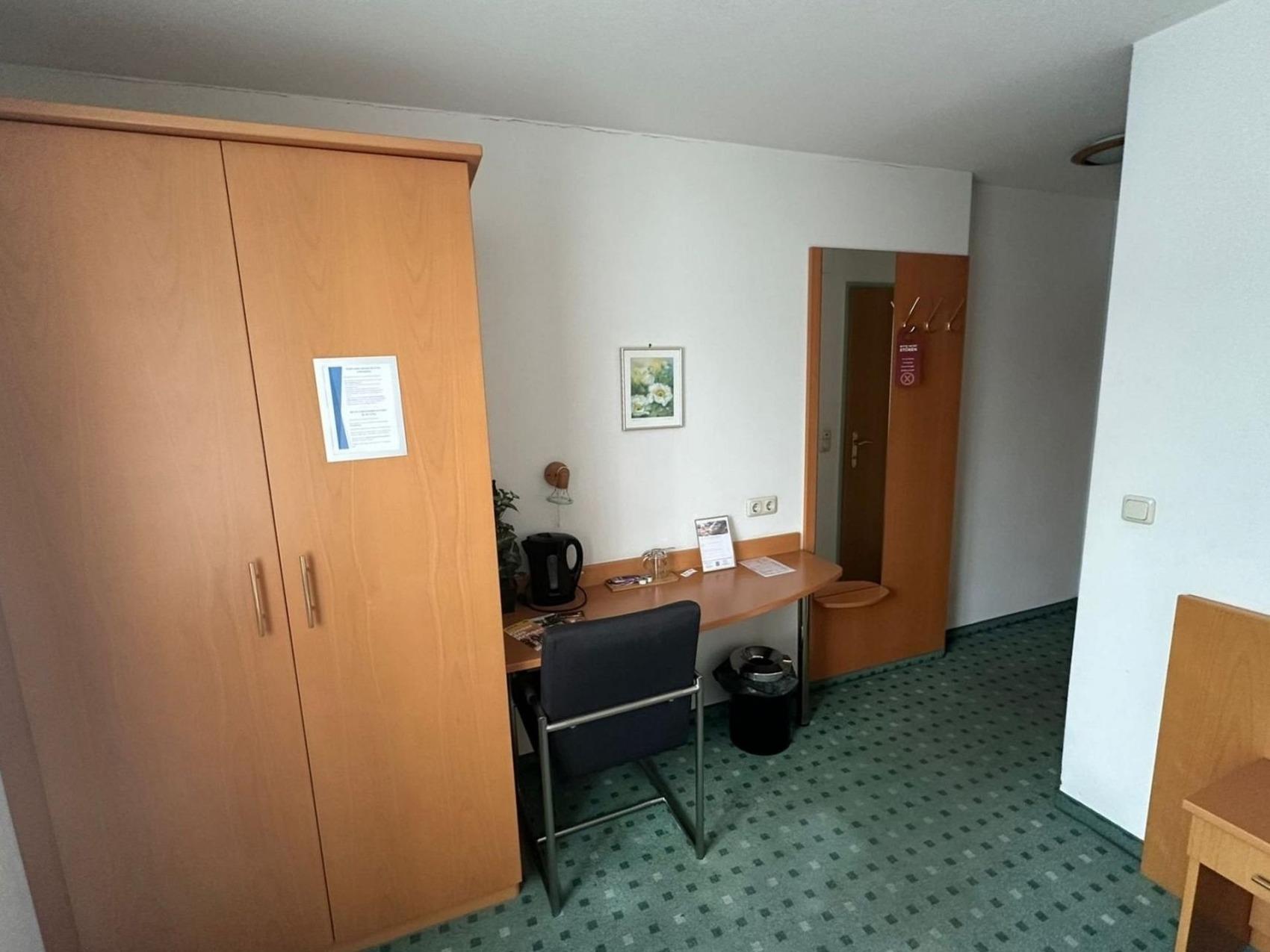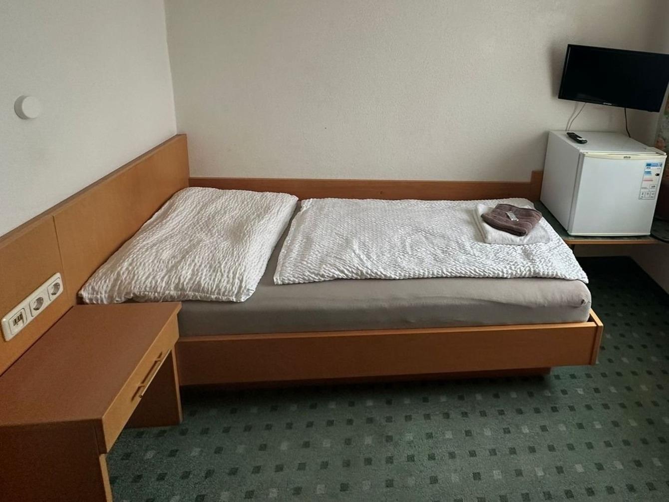 Ihr Einzelzimmer Nr. 202 im 2. Stock ist ausgestattet mit einem Einzelbett, Schreibtisch, Kühlschrank, TV, WLAN, Duschbad/WC.