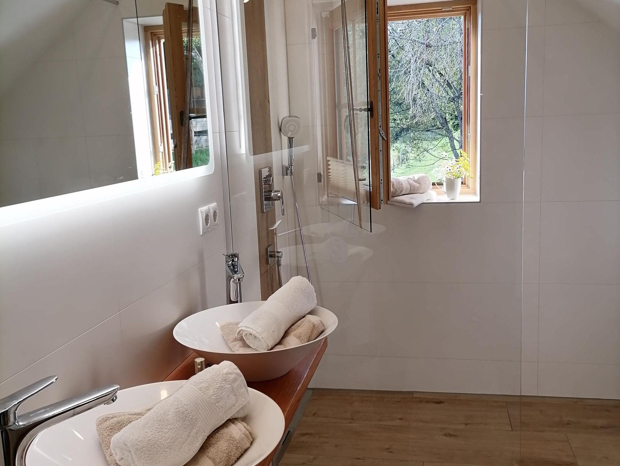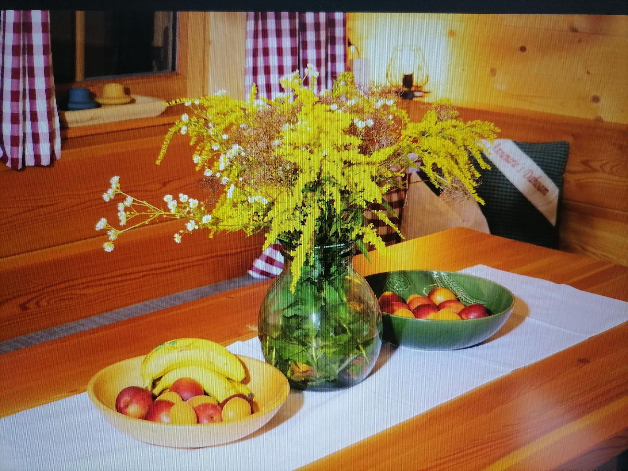 Der untere Bereich des Haus besteht aus einem Schlafzimmer, einem WC mit Waschtisch und Spiegel, einem Abstellraum, ein Vorhaus mit Garderobe und dem Herzstück der Wohnkuchl mit handgemachten Holzmöbeln. Dieser Raum verfügt außerdem über einen wunderschönen handgemachten Holzofen mit roten Kacheln, der noch weitere Gemütlichkeit in diesen Raum zaubert. Die einladende Holztreppe führt in den oberen Bereich. Dort befinden sich zwei weitere Schlafzimmer sowie das Badezimmer mit Ausblick direkt in die Natur. Im Badezimmer befinden sich ein WC, eine Dusche, zwei Waschbecken, eine Waschmaschine sowie weitere Abstellmöglichkeiten.