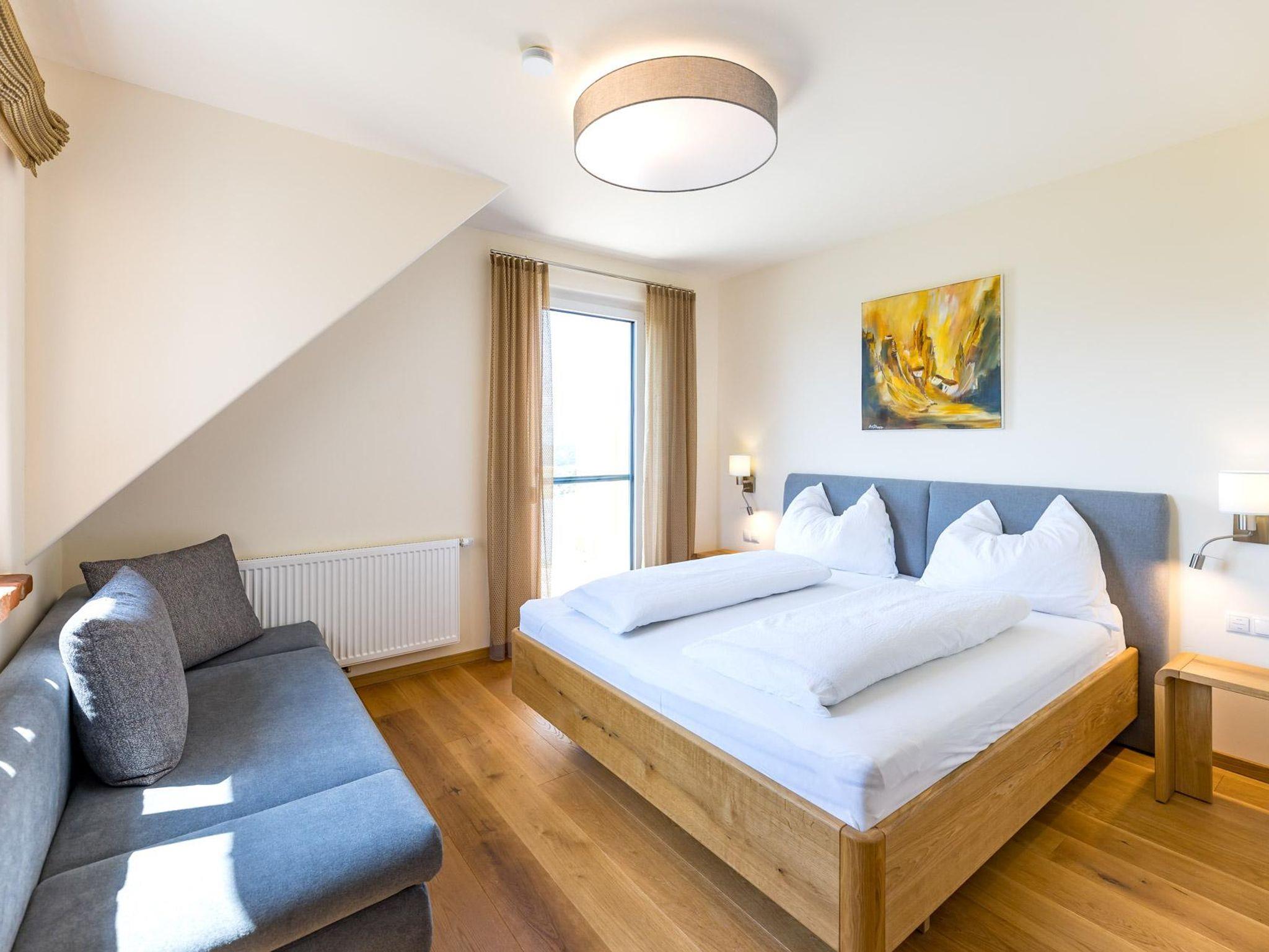 Geschmackvoll eingerichtetes Doppelzimmer mit einem Balkon der zum Entspannen mit einem Glaserl Wein einlädt.