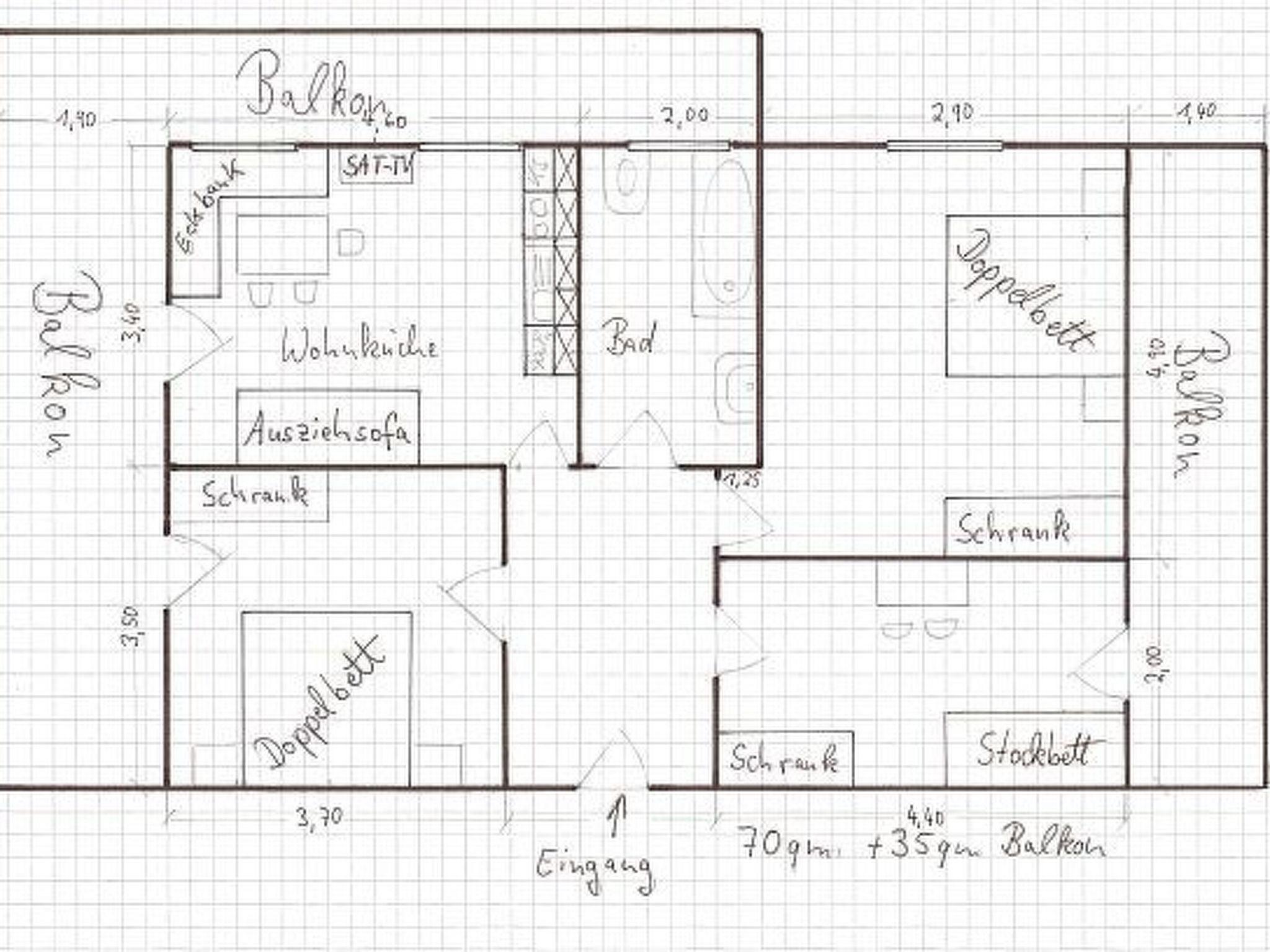 The holiday apartment is on the first floor and is suitable for up to 7 people. It has a bedroom with a double bed (180 x 200cm), a supplementary bed for one person and a washbasin, a second bedroom with a double bed (180 x 200cm), washbasin and shower, and a bedroom with a bunk bed (2 x 80 x 190cm) and a washbasin. The living room-kitchen is fully-equipped, with a dishwasher, a four-ring hob with an oven, a fridge, coffee machine, kettle, satellite TV and wireless Internet access, as well as a corner bench group. A washing machine and a freezer are provided. The bathroom has a bath and a WC.
