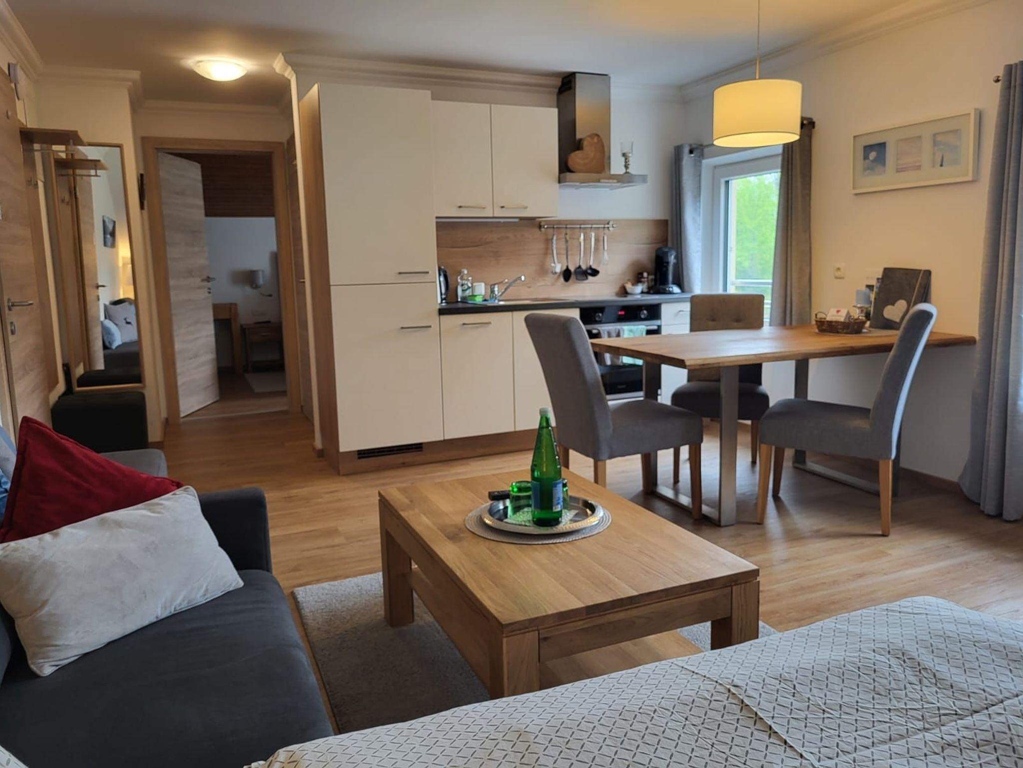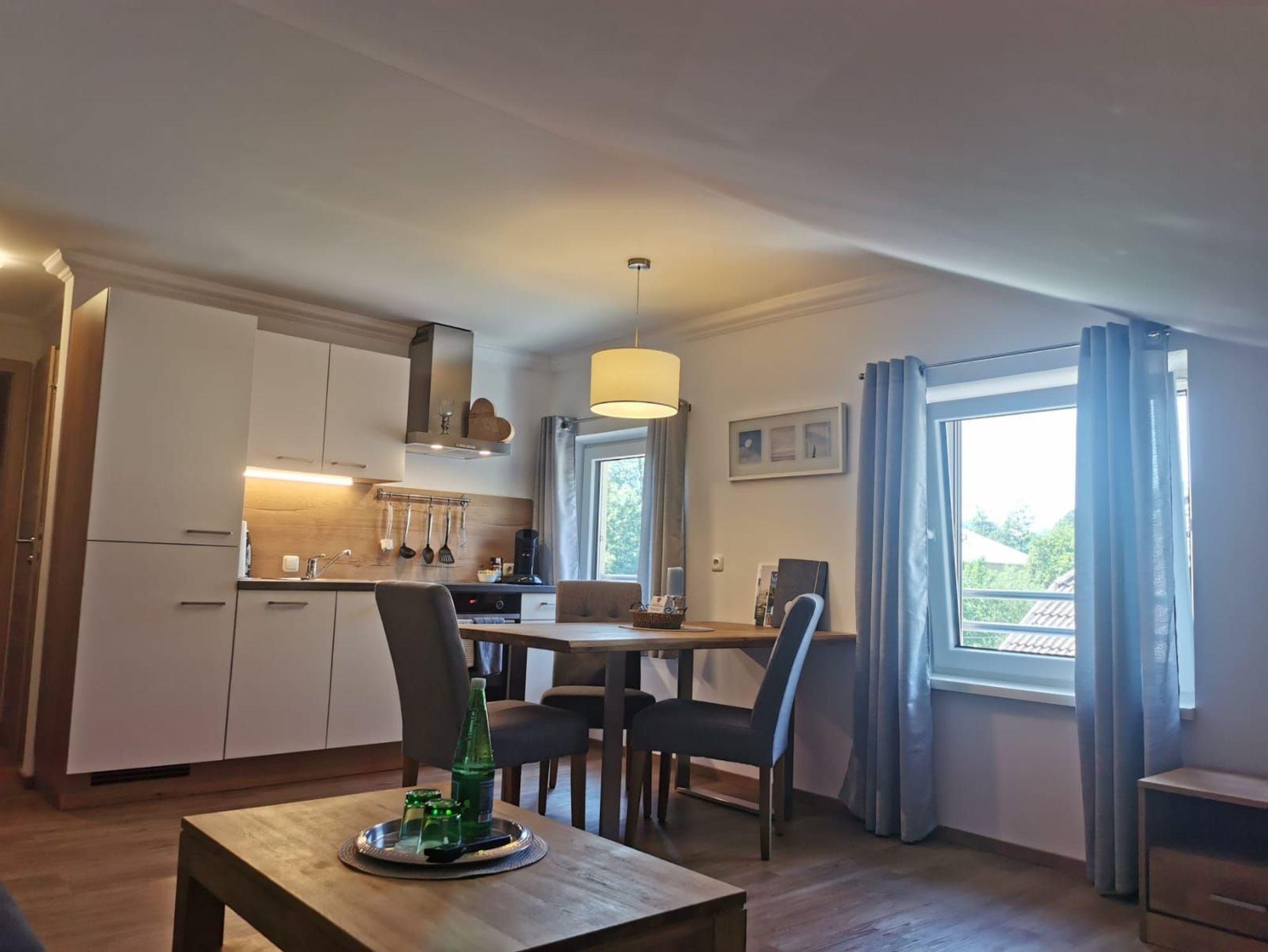 Ihre Unterkunft besteht aus einem Wohnraum mit gemütlicher Sitzecke mit Flat-TV, ausziehbarer Couch und einer Essecke mit Tisch, einer vollständig ausgestatteten Küche mit Herd, Kühl- Gefrierschrank, Kaffeemaschine,