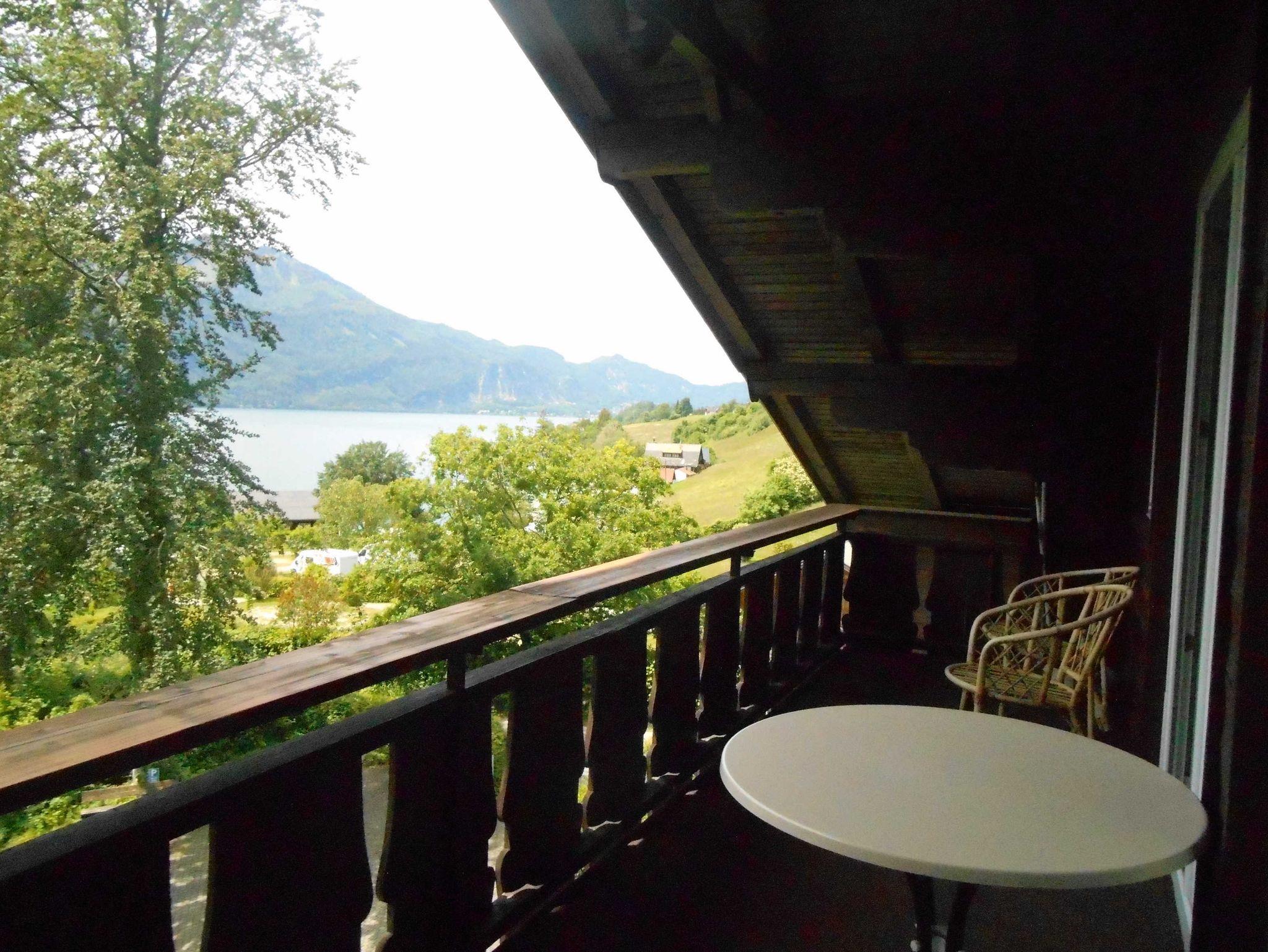 Genießen Sie Ihr Essen draußen von Ihrem wind- und wettergeschützter Panorama-Süd-Balkon mit herrlicher Aussicht auf den Wolfgangsee und die Berge !