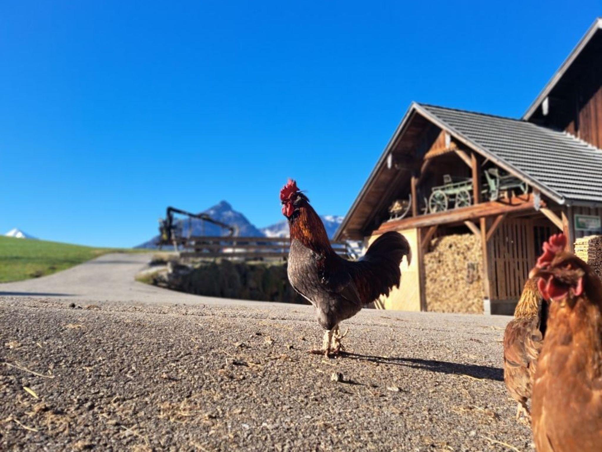 Am Bauernhof selbst gibt es Kühe, Hühner und Katzen. Die Kinder dürfen natürlich mitgehen in den Stall und mithelfen.