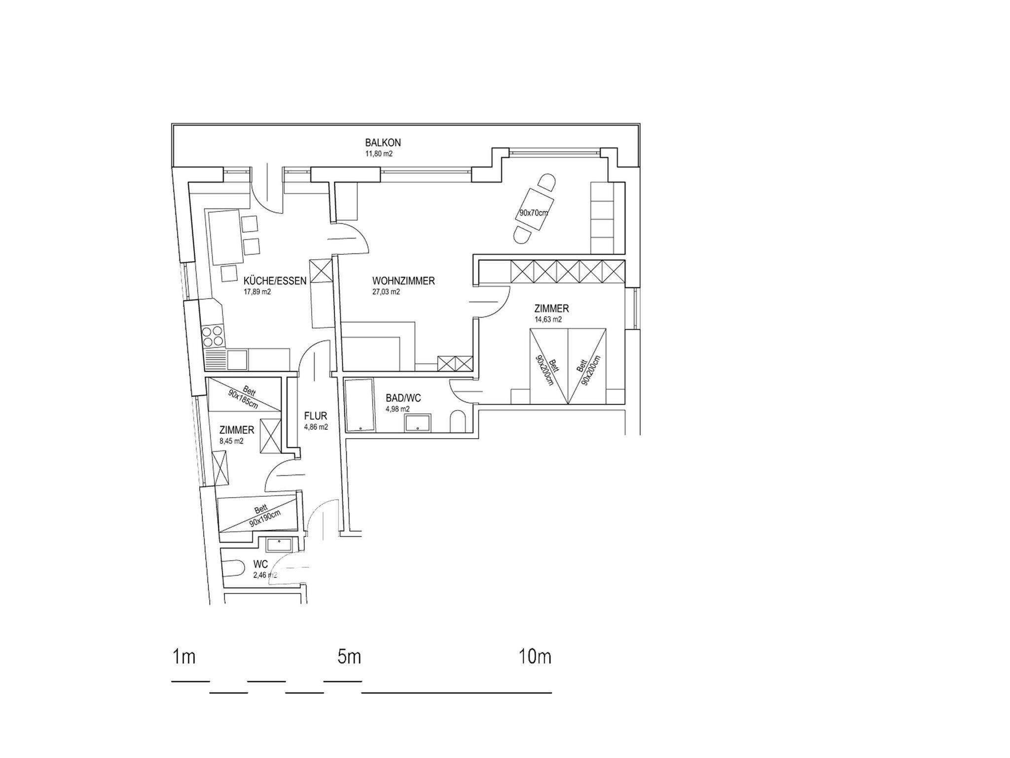 2 Doppelbettschlafzimmer, Badezimmer mit WC, WC extra, Küche, Wohnzimmer und großer Balkon.