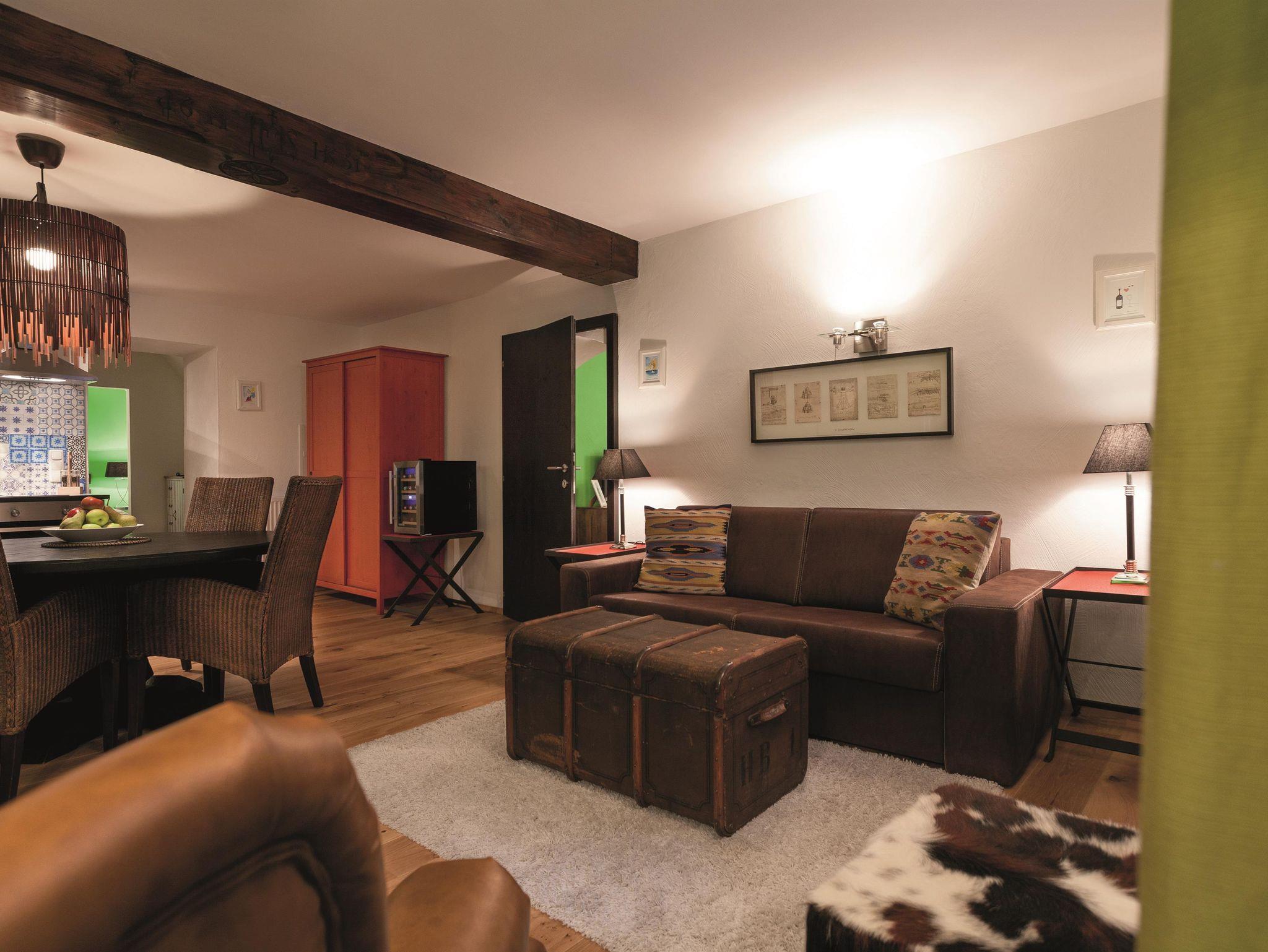 Apartment 1 im ersten Stock bietet auf 45 m² Platz für bis zu vier Personen. Es verfügt über ein Schlafzimmer mit Doppelbett sowie ein Schlafsofa im Wohnbereich. Eine Küchenzeile und ein Essbereich sind ebenfalls vorhanden, und die Fenster bieten Blick auf die alten Marktstraßen von St. Wolfgang. Das eigene Badezimmer ist mit Dusche, Waschbecken und WC ausgestattet. Ein besonderes Highlight ist die Decke mit freiliegenden Holzbalken aus dem Jahr 1416.