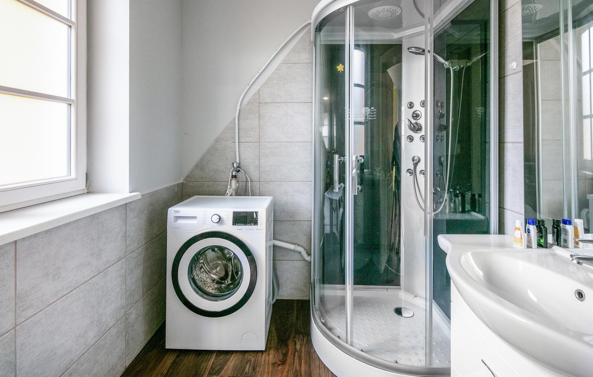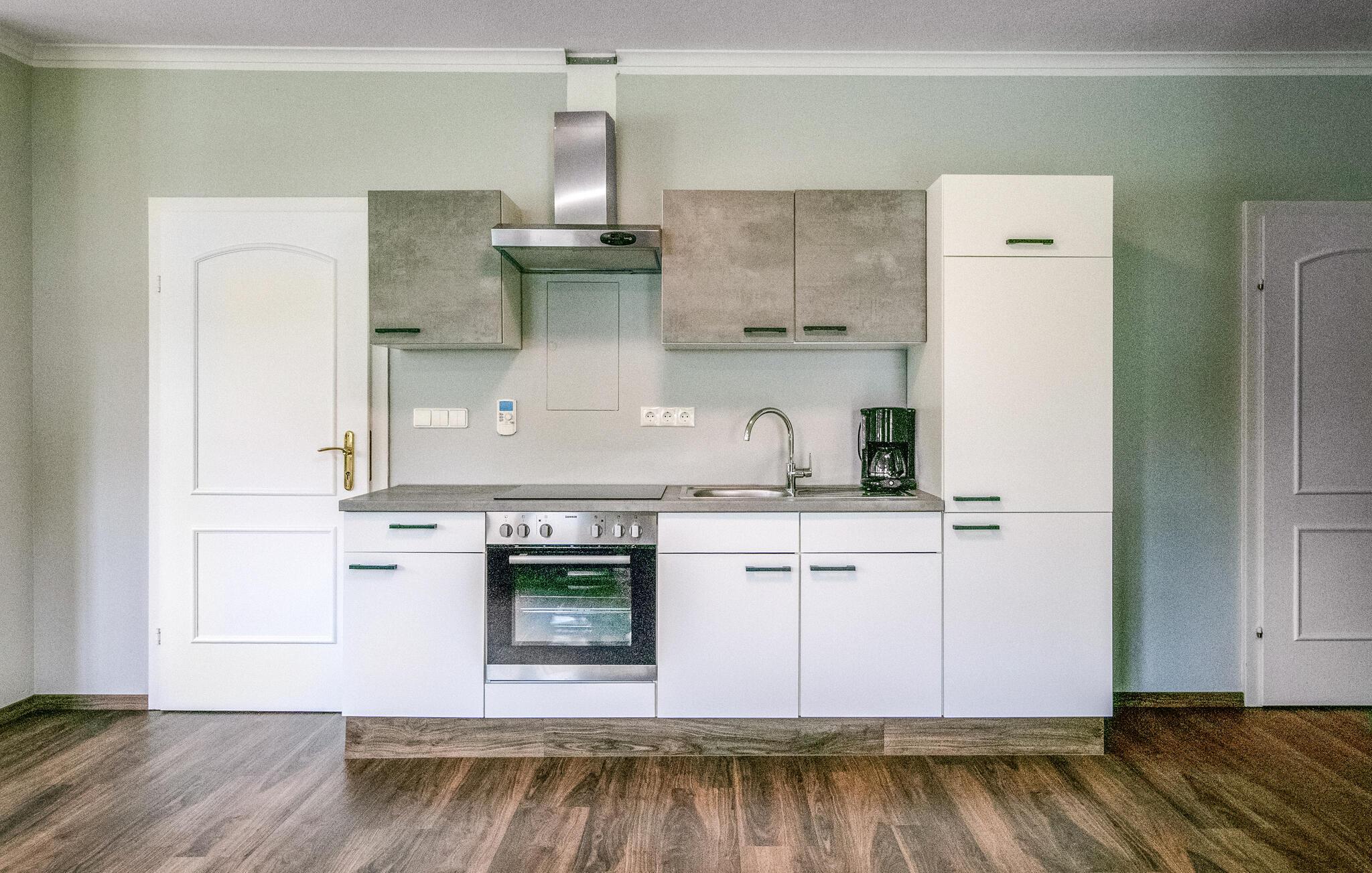 Føl jer straks velkommen i de lyse rum. Læn jer tilbage i den åbne stue, der er udstyret med et moderne tekøkken, en komfortabel spiseplads og et tv. Brug køkkenet til at tilberede jeres måltider efter jeres ønsker og afslut dagen med en god film. Det venlige farveskema og den rummelige plads skaber en behagelig atmosfære, der lægger op til at slappe af.