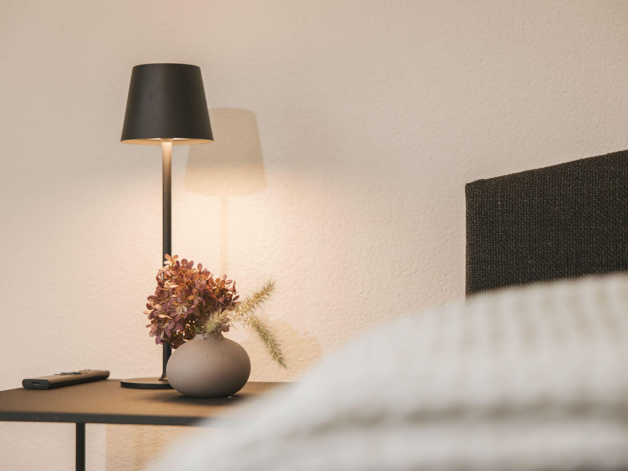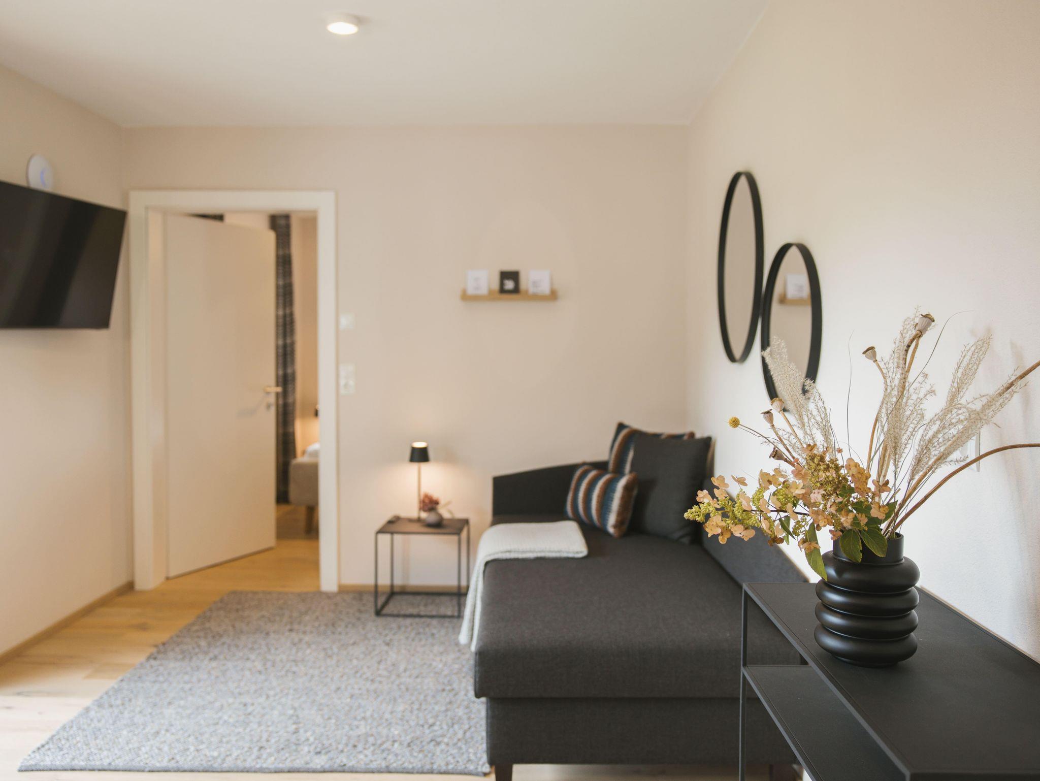 Das Apartment Franz befindet sich im ersten Stock des Nebenhauses und bietet Platz für bis zu drei Personen. Zwei Erwachsene schlafen im separaten Schlafzimmer mit Doppelbett, eine dritte Person auf der gemütlichen Couch im Wohnbereich.