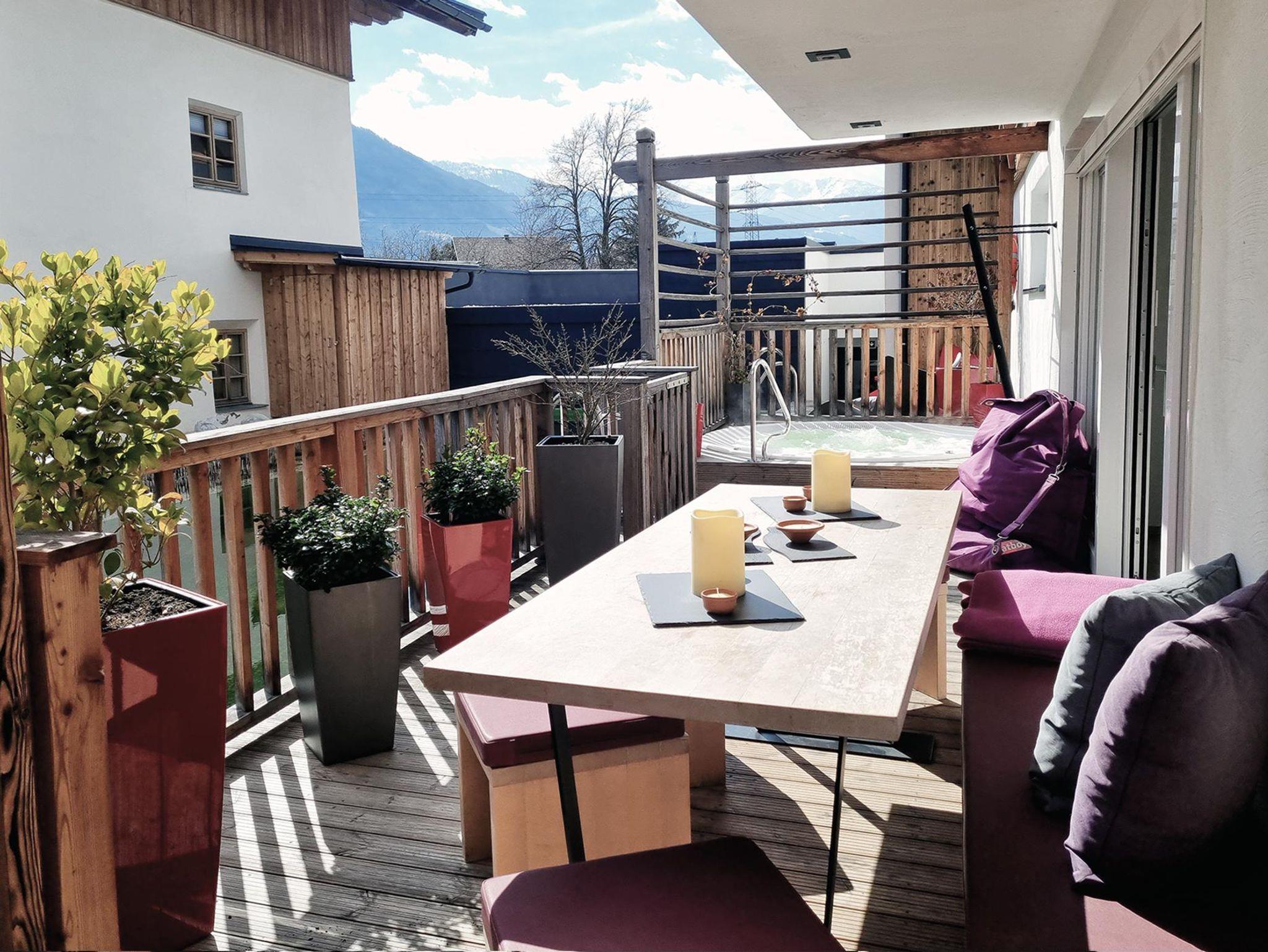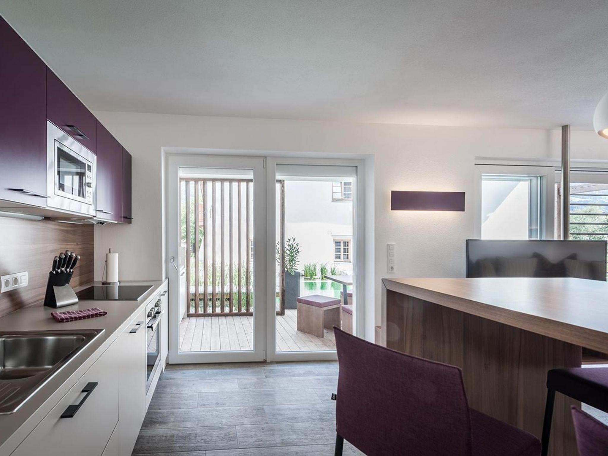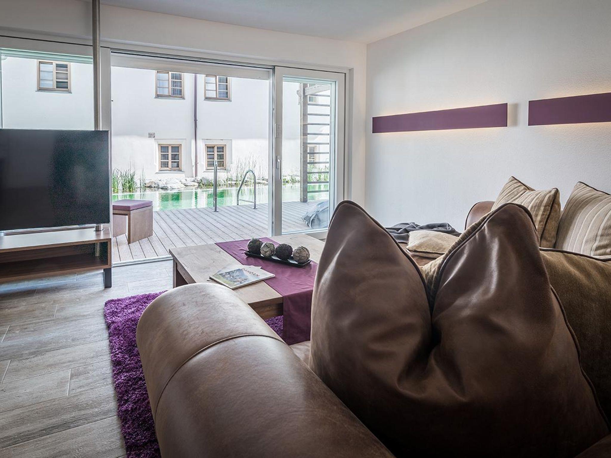Die große Fensterfront eröffnet den Blick zum Schwimmteich und auf die Holzterrasse, die einen direkten Zugang zum Pool hat. Auf der Terrasse befindet sich zusätzlich ein Außen-Whirlpool.