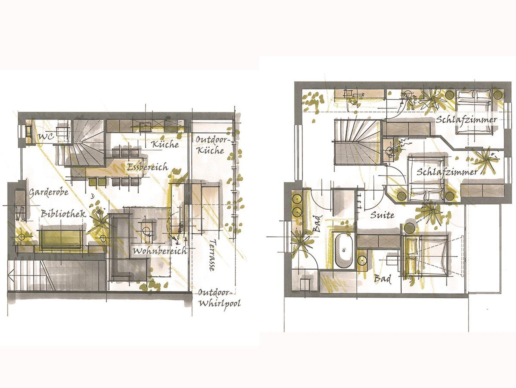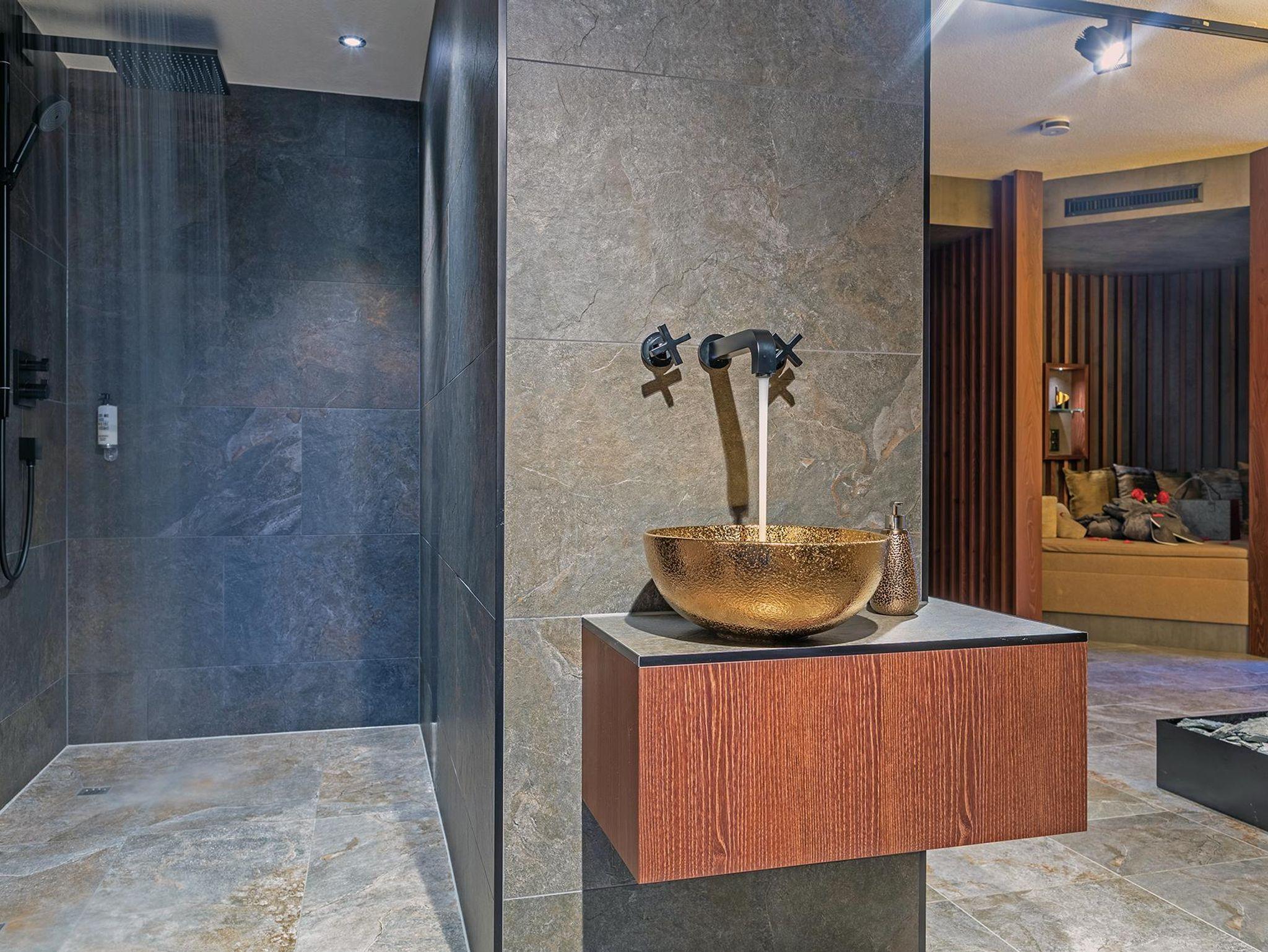 Das große Bad bietet eine Badewanne, eine Dusche und ein abgetrenntes WC. Die Suite im Obergeschoss verfügt über einen Ankleideraum, ein großes Doppelbett, einen Balkon und ein eigenes Bad mit Dusche und WC. Das Fernsehbild wird mittels eines Beamers auf eine Leinwand projiziert.