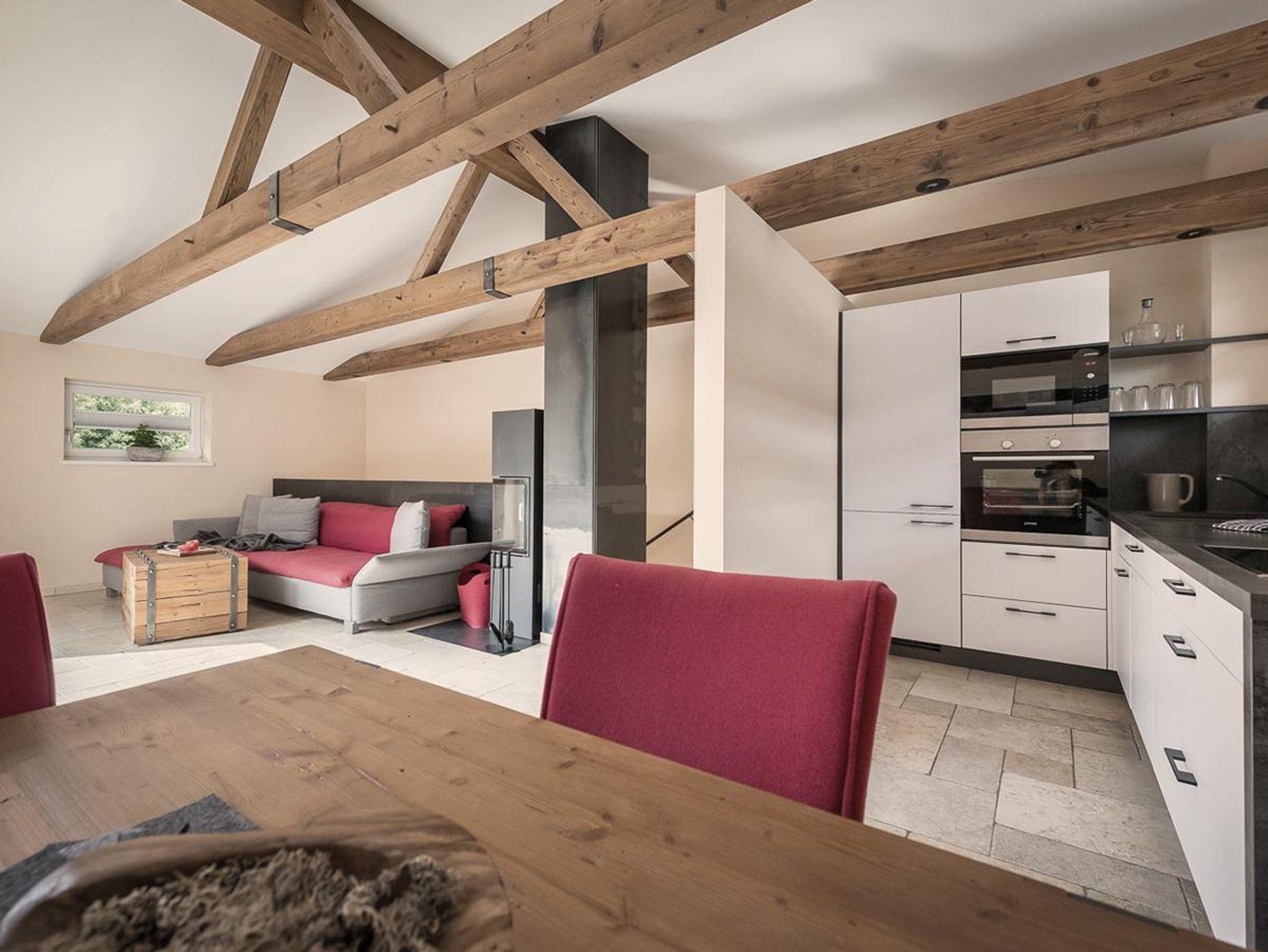 Das Obergeschoss erschließt sich als offener Wohnraum unterteilt in Wohn- und Essbereich mit angeschlossener Küche. Der Kamin erzeugt im Winter eine angenehme, natürliche Wärme und erlaubt auch einen Blick auf das knisternde Feuer in seinem Inneren.