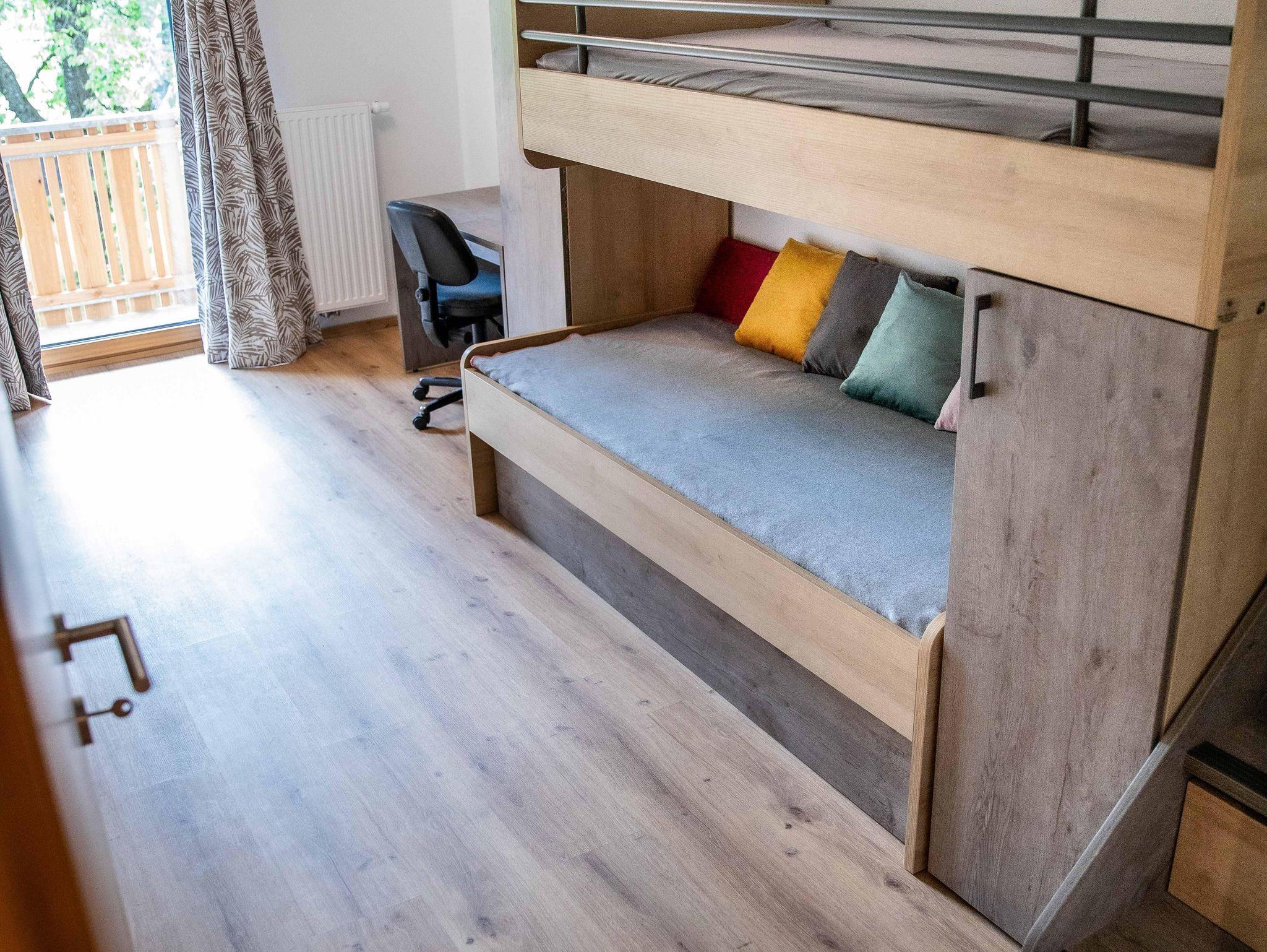 Das Appartement befindet im ersten Stock und verfügt über ein Schlafzimmer mit Doppelbett, zweites Schlafzimmer mit Etaggenbett für 3 Personen, ein Wohnzimmer mit einem Schlafsofa, sowie eine voll ausgestattete Küche (Induktionsherd, Geschirrspüler, Mikrowelle, Waschmaschine) und Bad mit Badewanne und separates WC. Zusätzlich kann man von jedem Raum den Balkon erreichen.