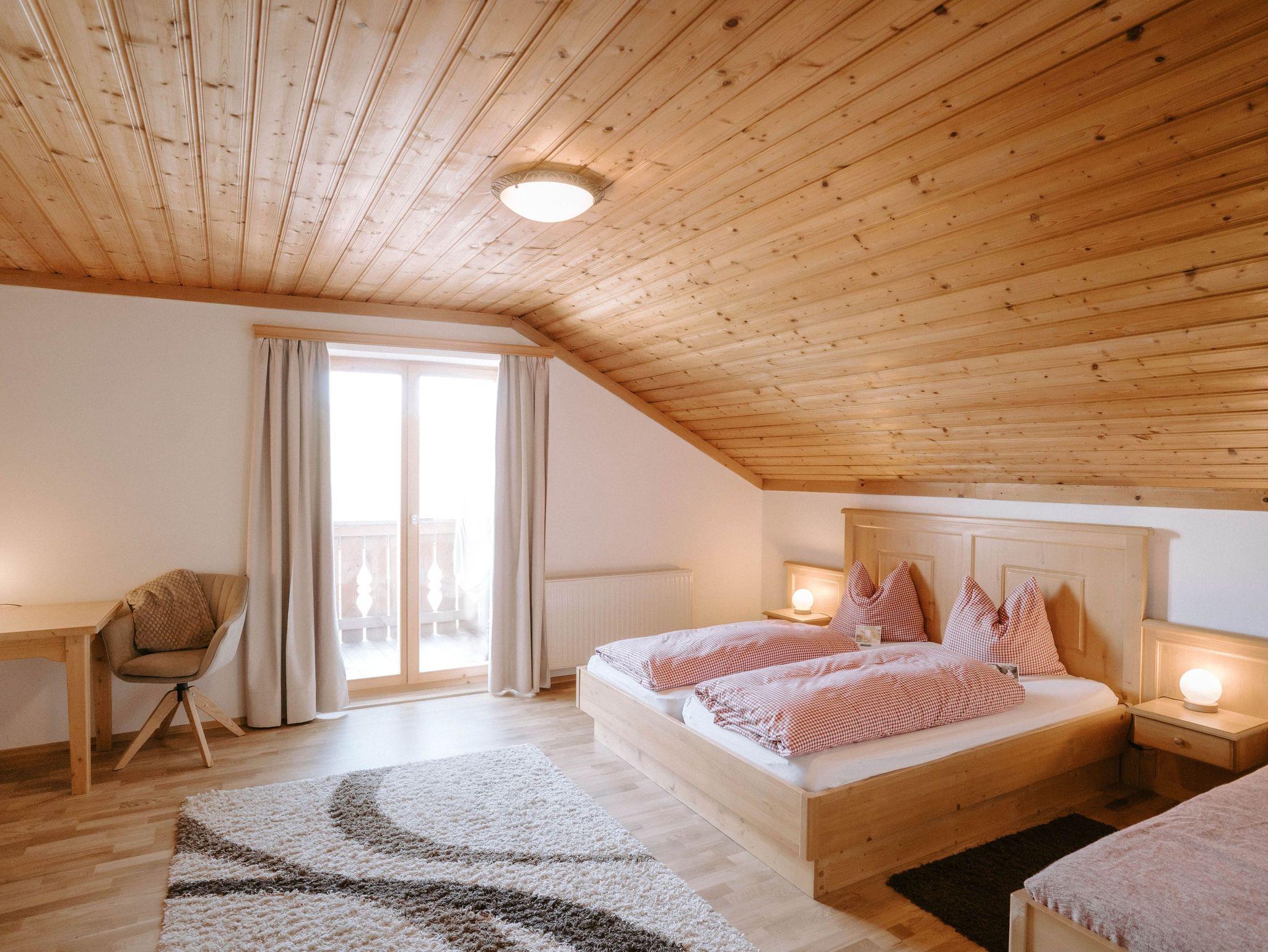 Geräumige Ferienwohnung im Dachgeschoss mit Schlafzimmer, Küche, Vorraum, Badezimmer und Balkon. Neben dem Doppelbett und dem Einzelbett gibt es bei Bedarf noch ein Reisegitterbett.