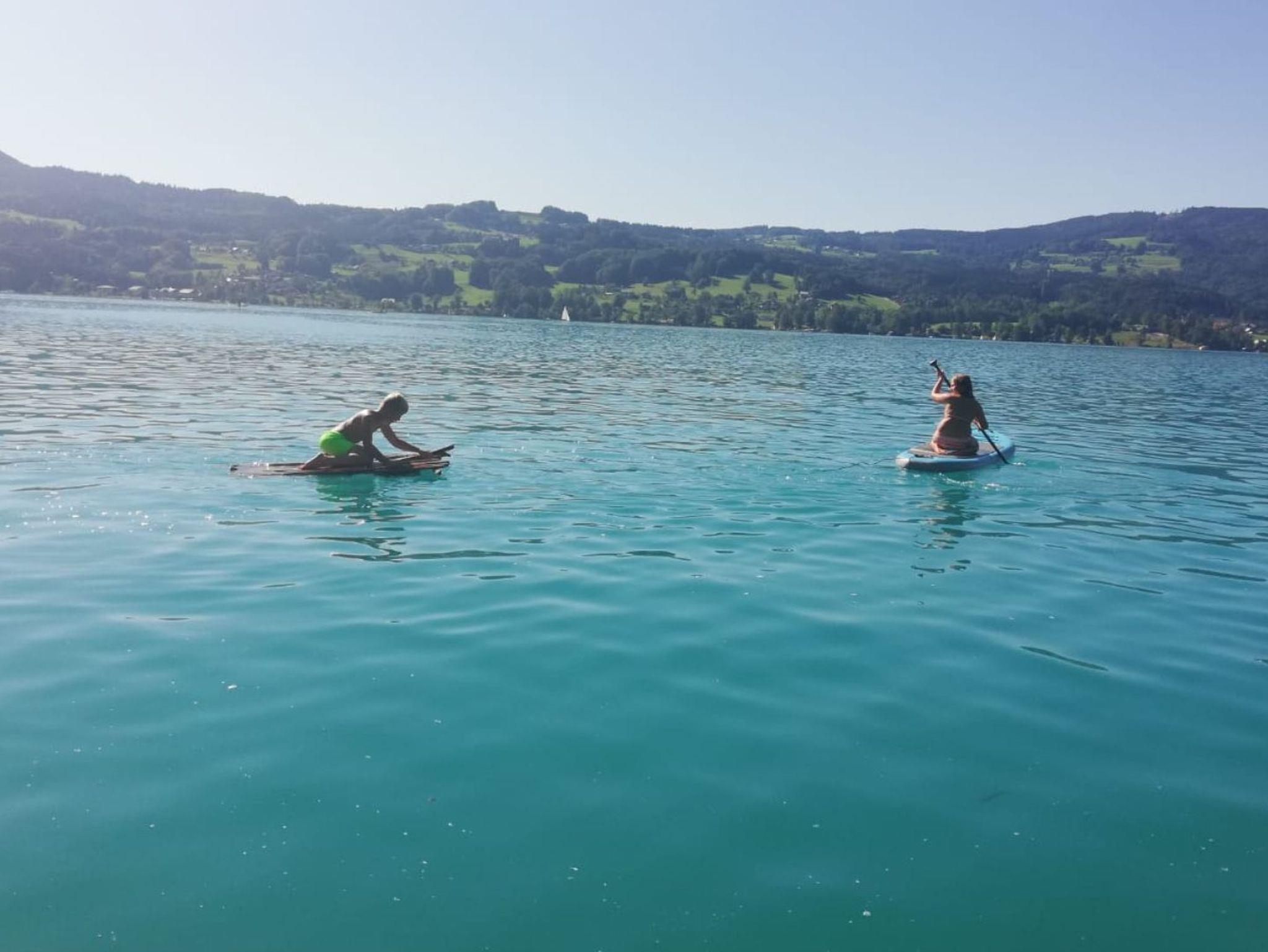 Unser Doppelzimmer BIRNE ist mit Möbeln aus Birnenholz ausgestattet. Vom großen Balkon hat man einen herrlichen Blick auf den Attersee und das Gebirge.