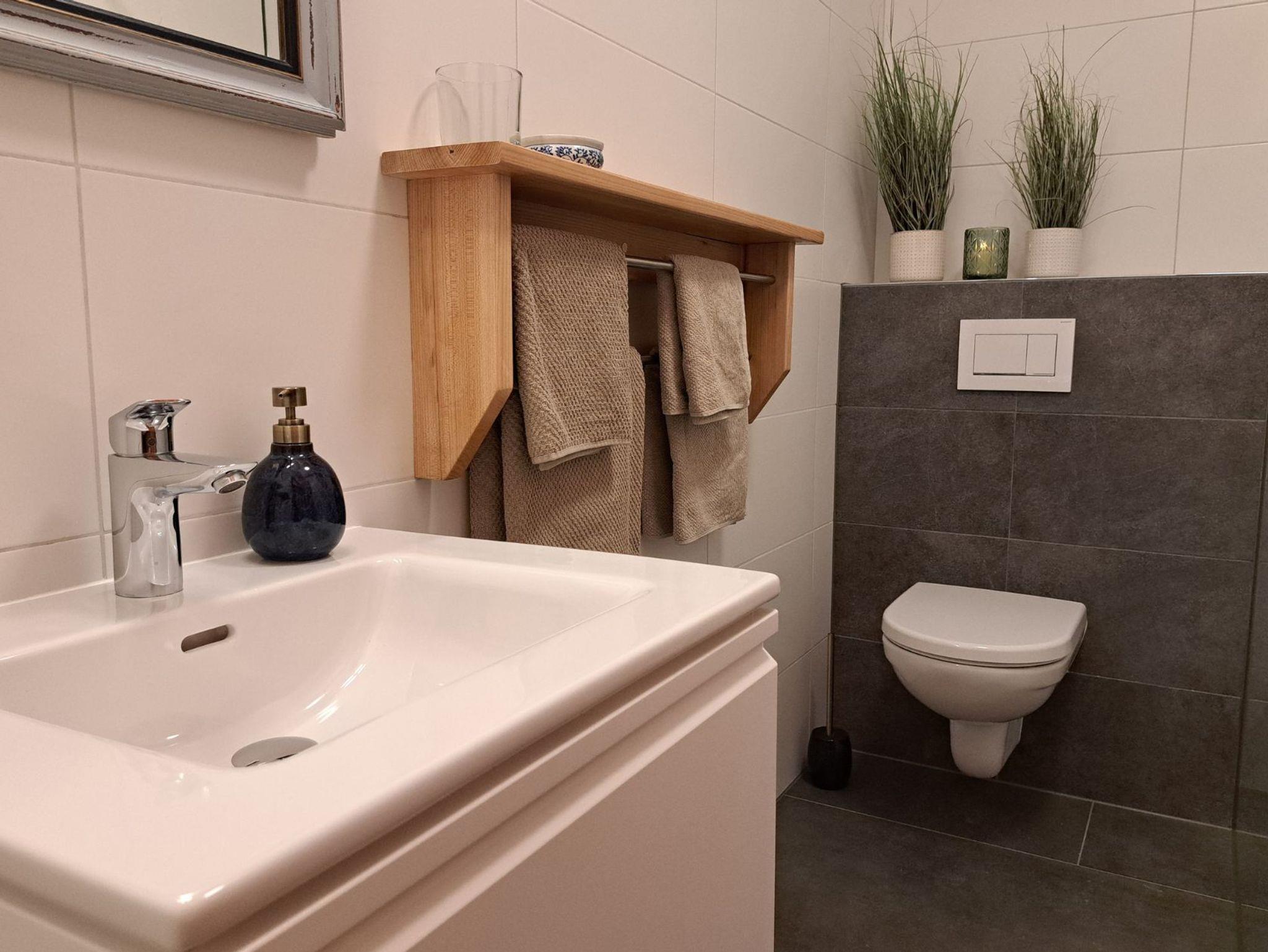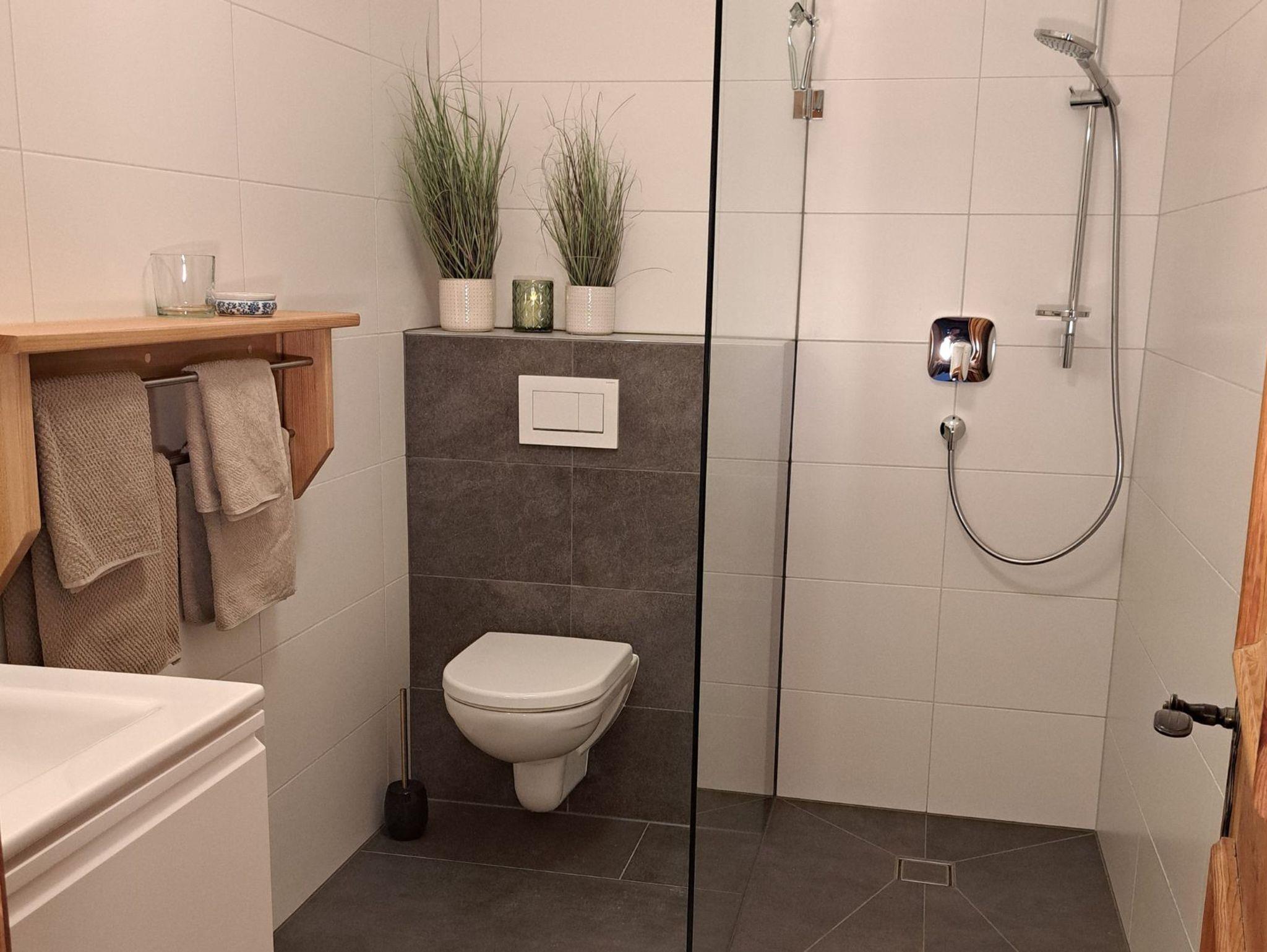 Nebenan geht es ins neue Badezimmer mit großer Dusche und WC.