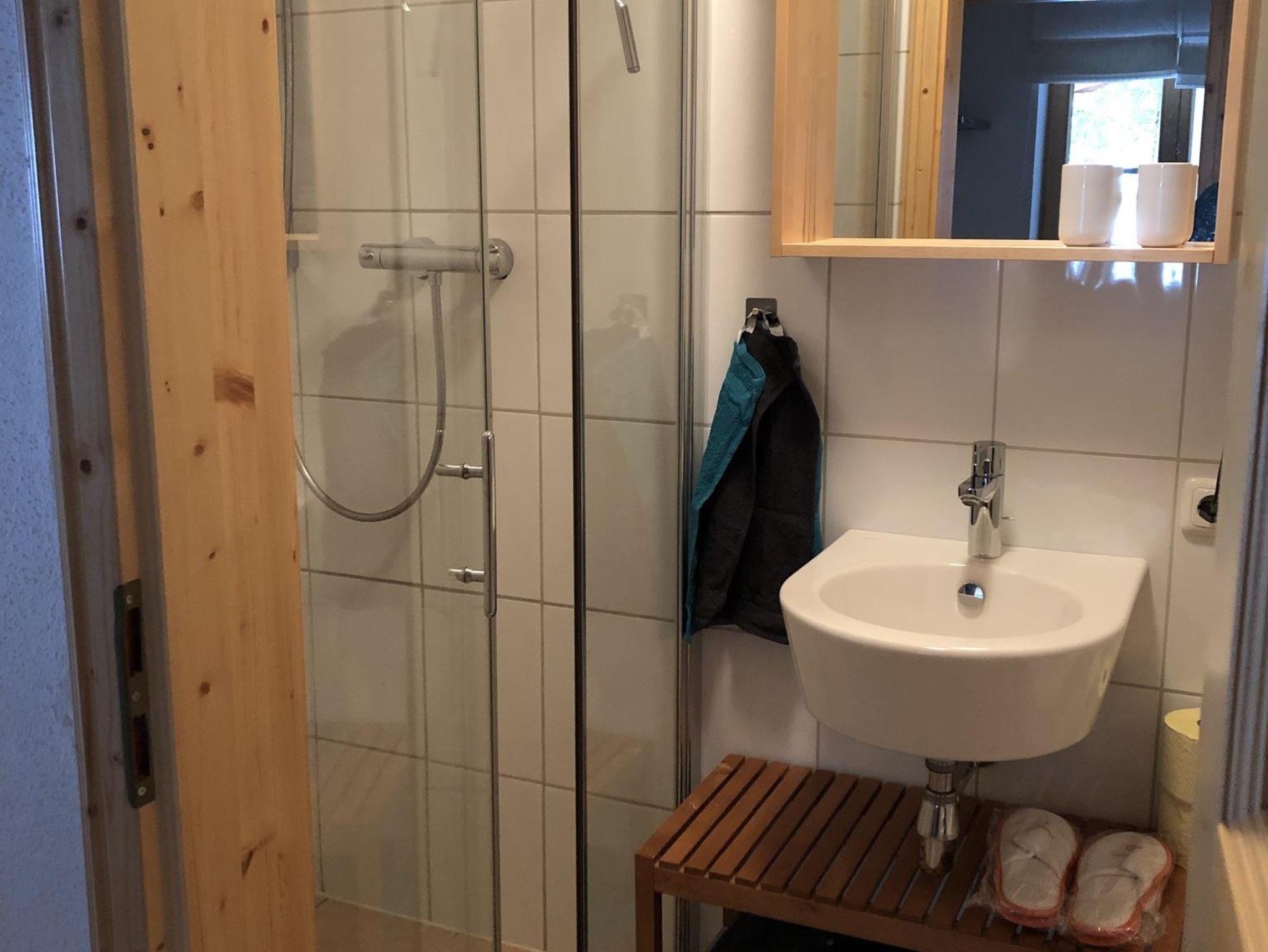 Im Badezimmer befinden sich neben der sanitären Anlagen auch Handtücher, Klopapier, Seife und ein Föhn.