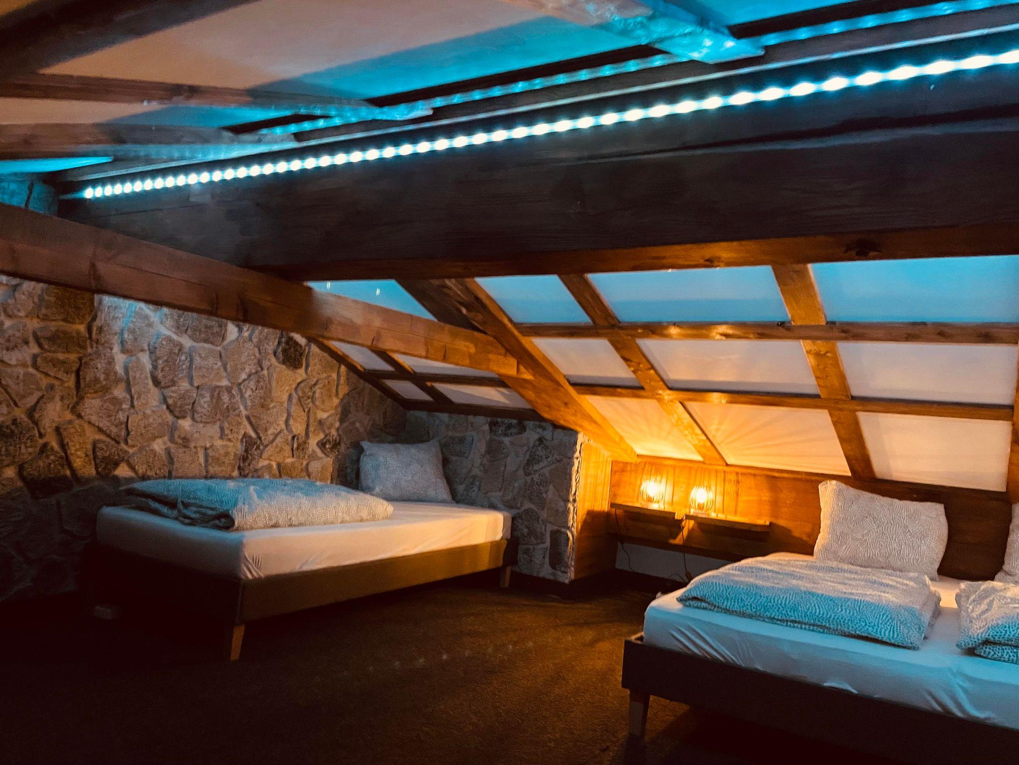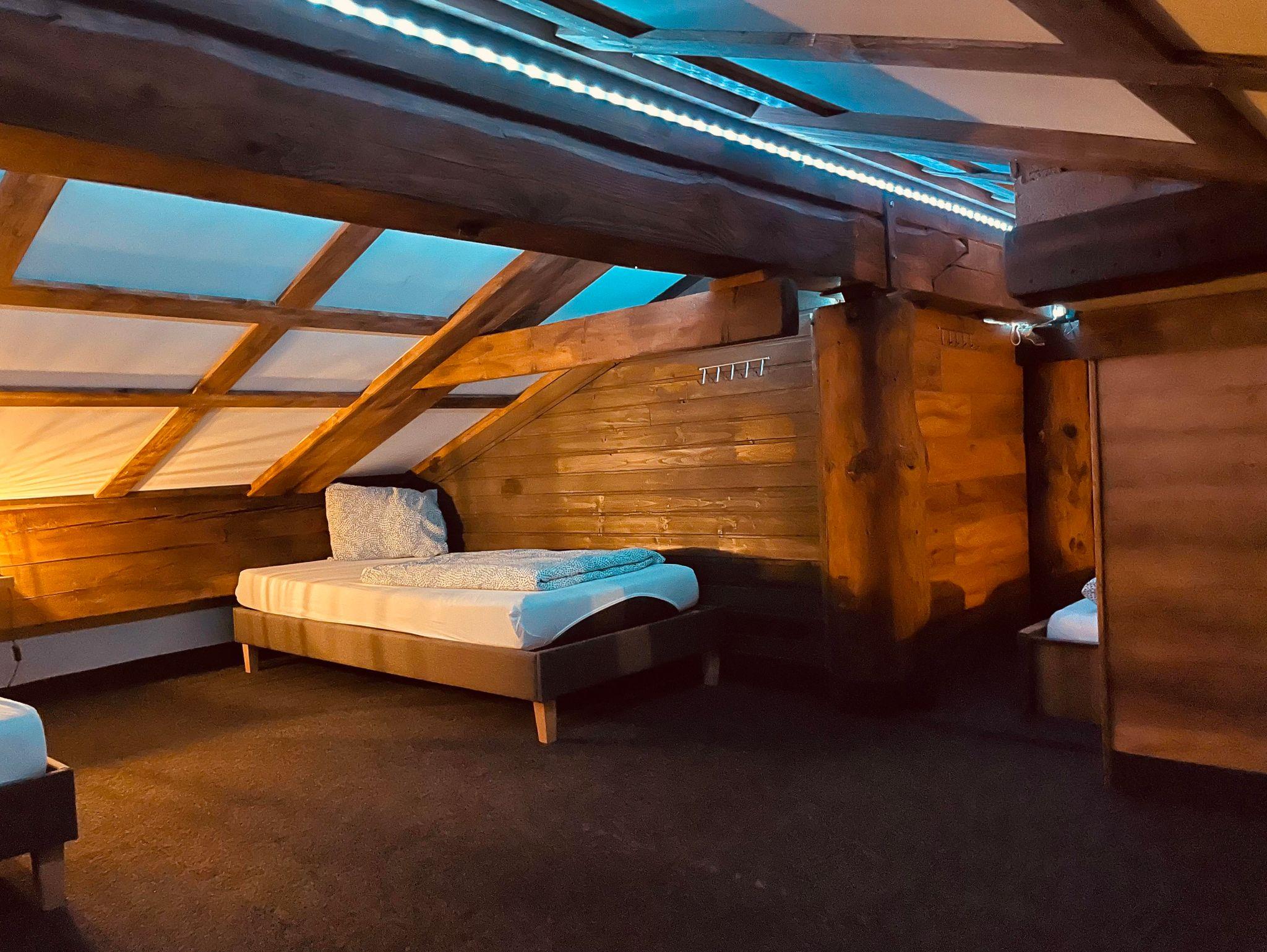 5 Personen finden Platz in einer kuscheligen Schlafhöhle mit 5 Einzelbetten, die sich im Wohnzimmer über eine Treppe finden lässt.