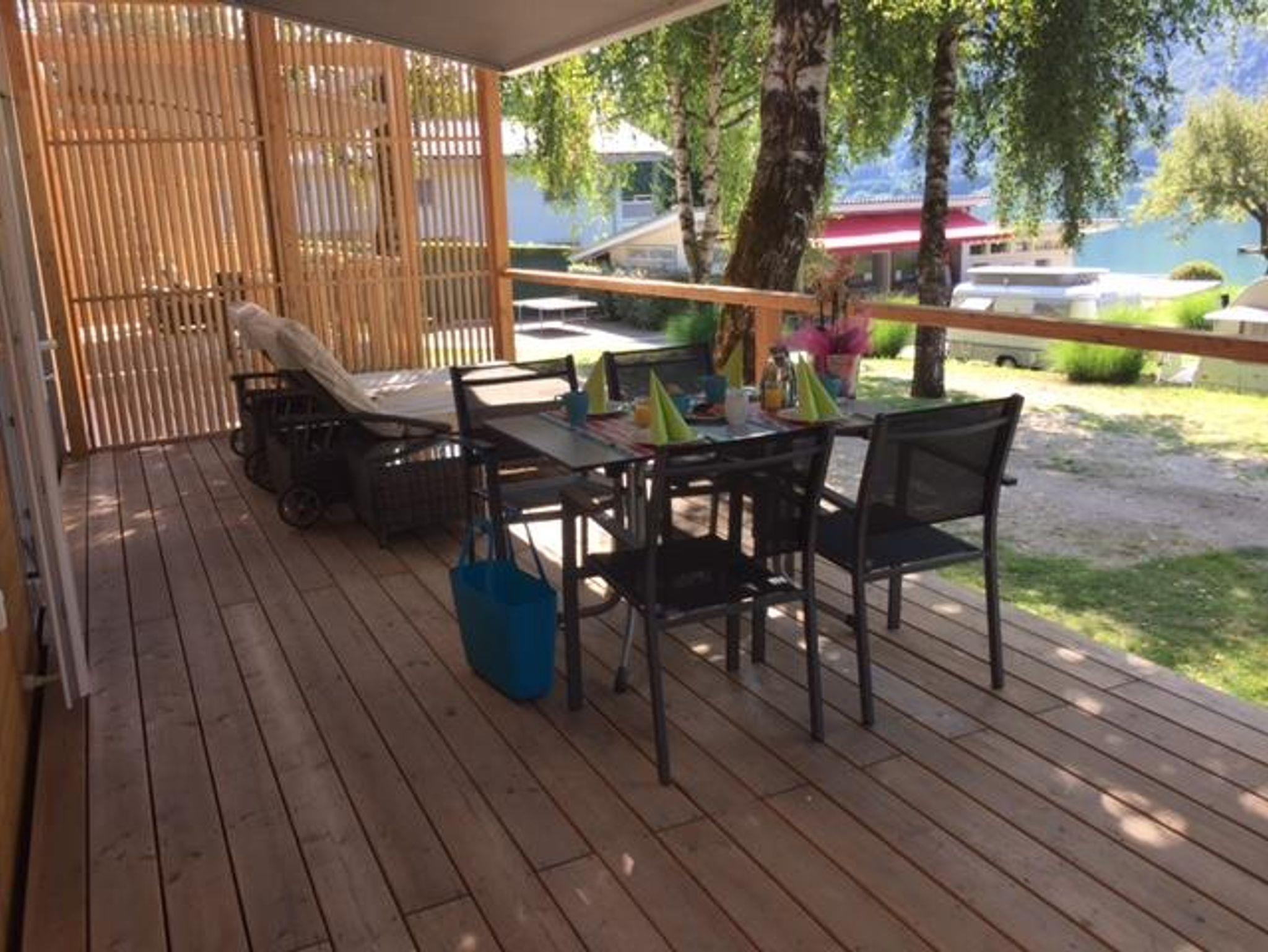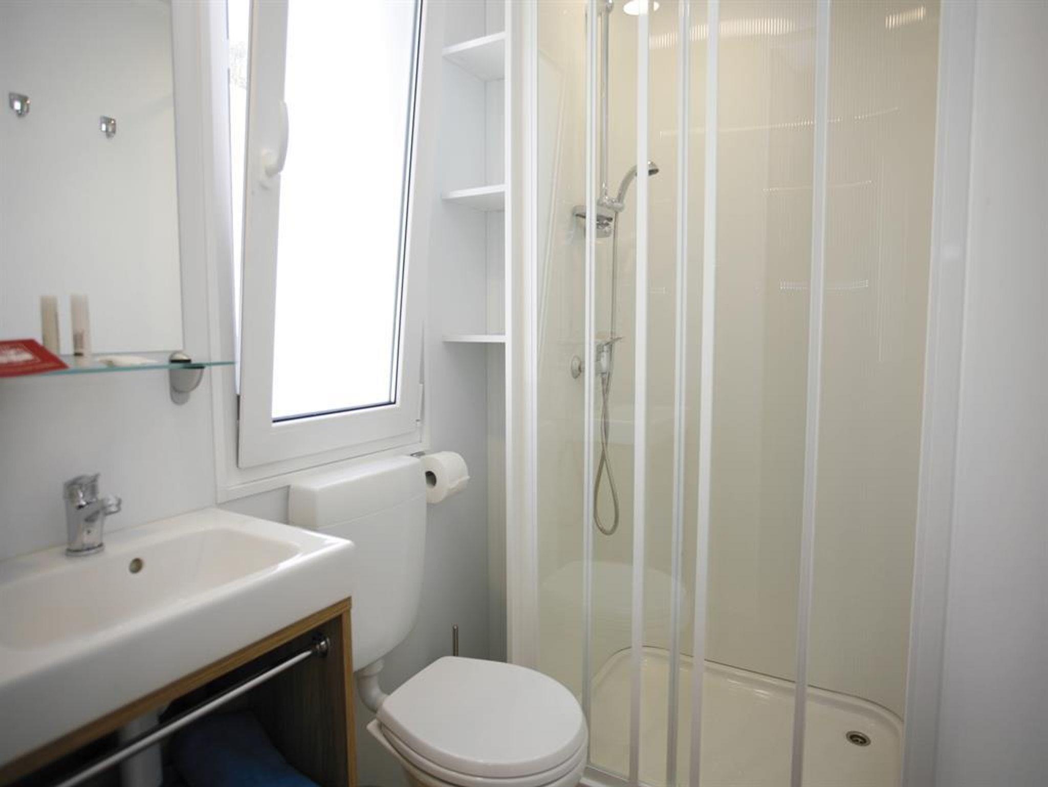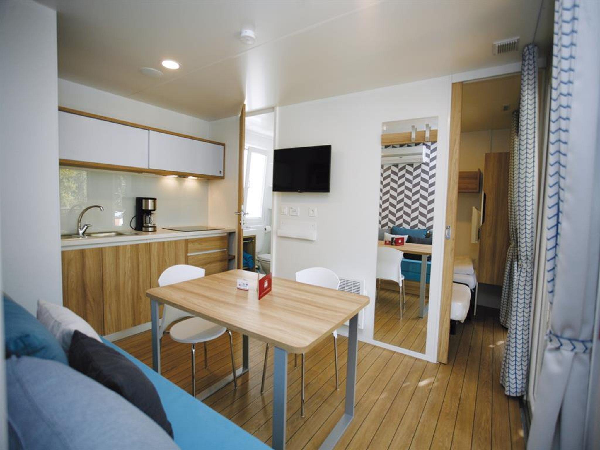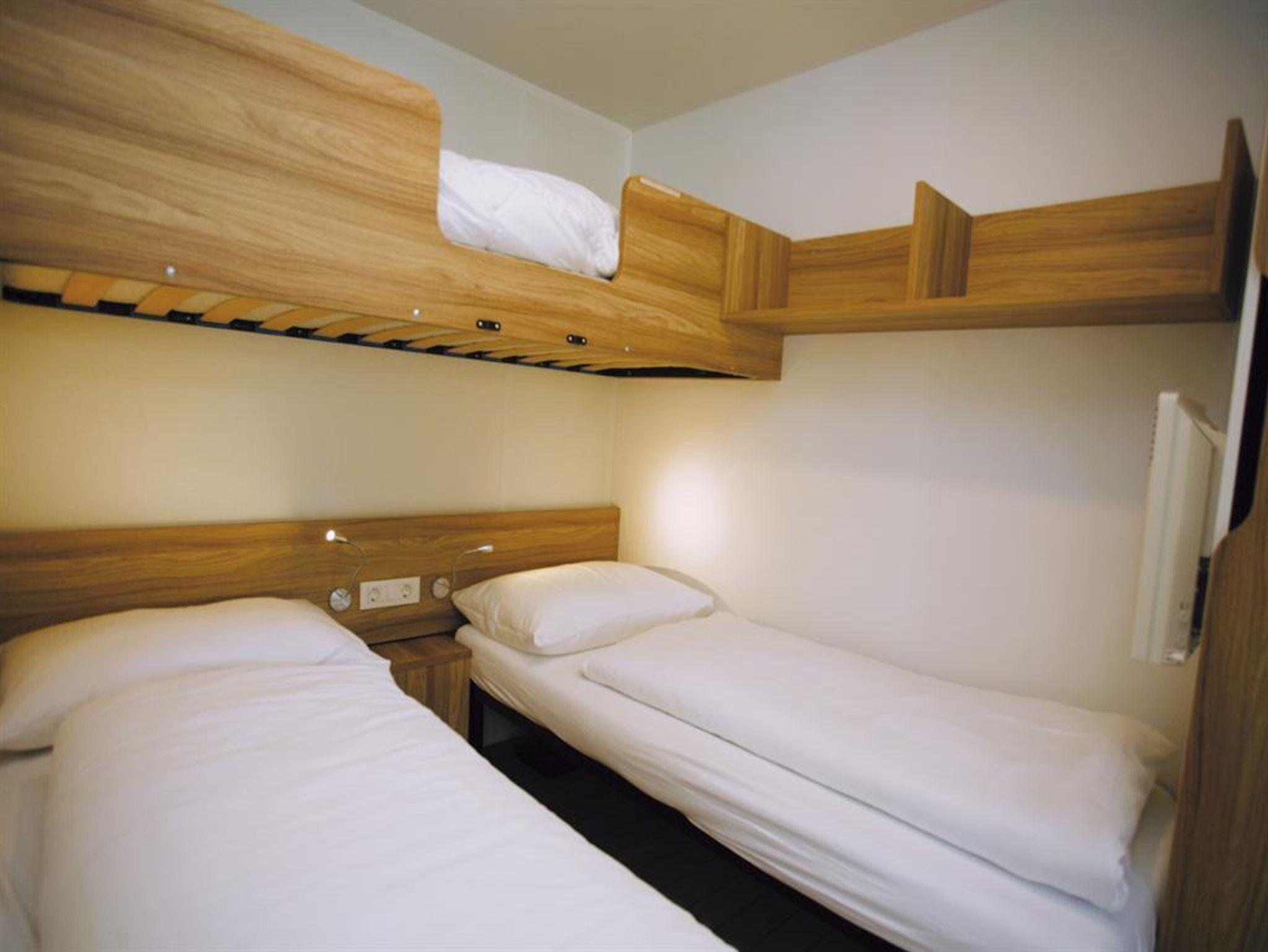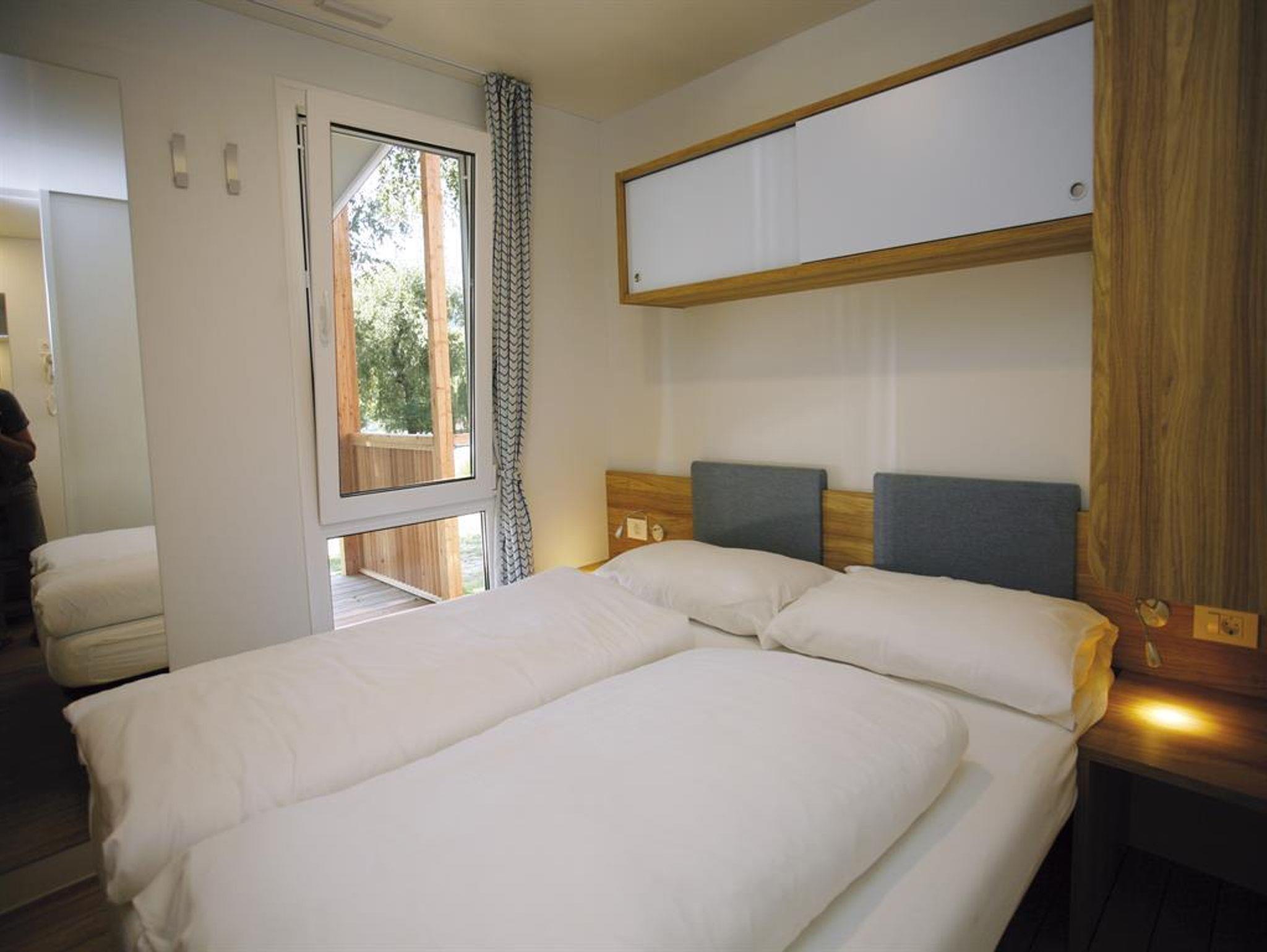 Modernes Ferienhäuschen auf dem Campingplatzgelände - bestehend aus Schlafzimmer mit Doppelbett, zweites Schlafzimmer mit zwei getrennten Betten, 3. Bett als Hochbett möglich, 2 Badezimmer mit Dusche/WC, voll ausgestattete Küche mit Geschirrspüler und Mikrowelle, Geschirr, Kaffeemaschine, Wohnzimmer mit Essplatz für 6 Personen, überdachte Terrasse mit Mobiliar, Outdoor Liegebetten, Holzkohlengrill, 2xSat-TV, Blue Tooth Soundsystem, Klimanlage (gegen Gebühr), Gratis W-Lan, gebührenfreier PKW-Parkplatz, sowie Abstellplatz für Fahrräder und Ferienutensilien. Frühstück und Abendessen werden im Hotel Haupthaus serviert.