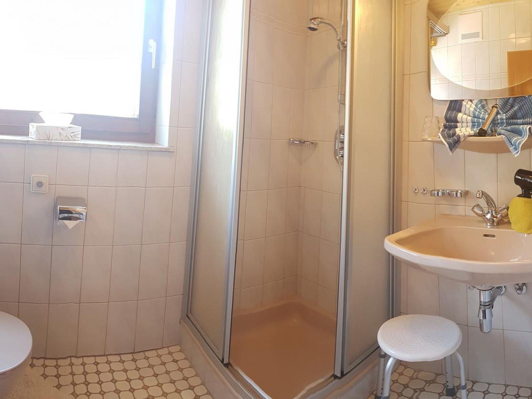 Die durch handwerkliche Tischlerarbeit gediegen und praktisch eingerichtete Ferienwohnung im Untergeschoß besteht aus einem kombinierten Wohn-Schlafraum mit direktem Zugang auf die Sonnenterrasse mit gemütlicher Sitzmöglichkeit. Das separate Schlafzimmer mit Doppelbett und großem Einbauschrank schließt sich an dem Wohnraum an. Die abgeschlossene Küche mit Sitzecke wird durch Kühlschrank, Heißluftherd mit 4 Keramikkochplatten sowie sämtlichen Geschirr komplettiert. Neben dem Vorraum mit Garderobe steht noch eine Dusche mit WC zur Verfügung.