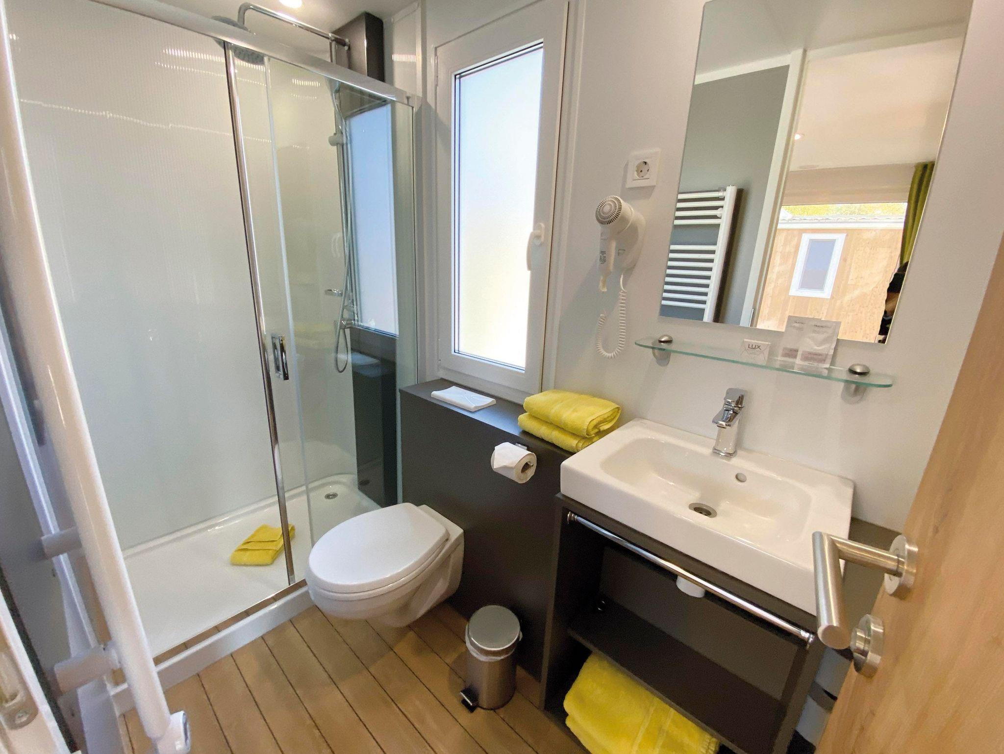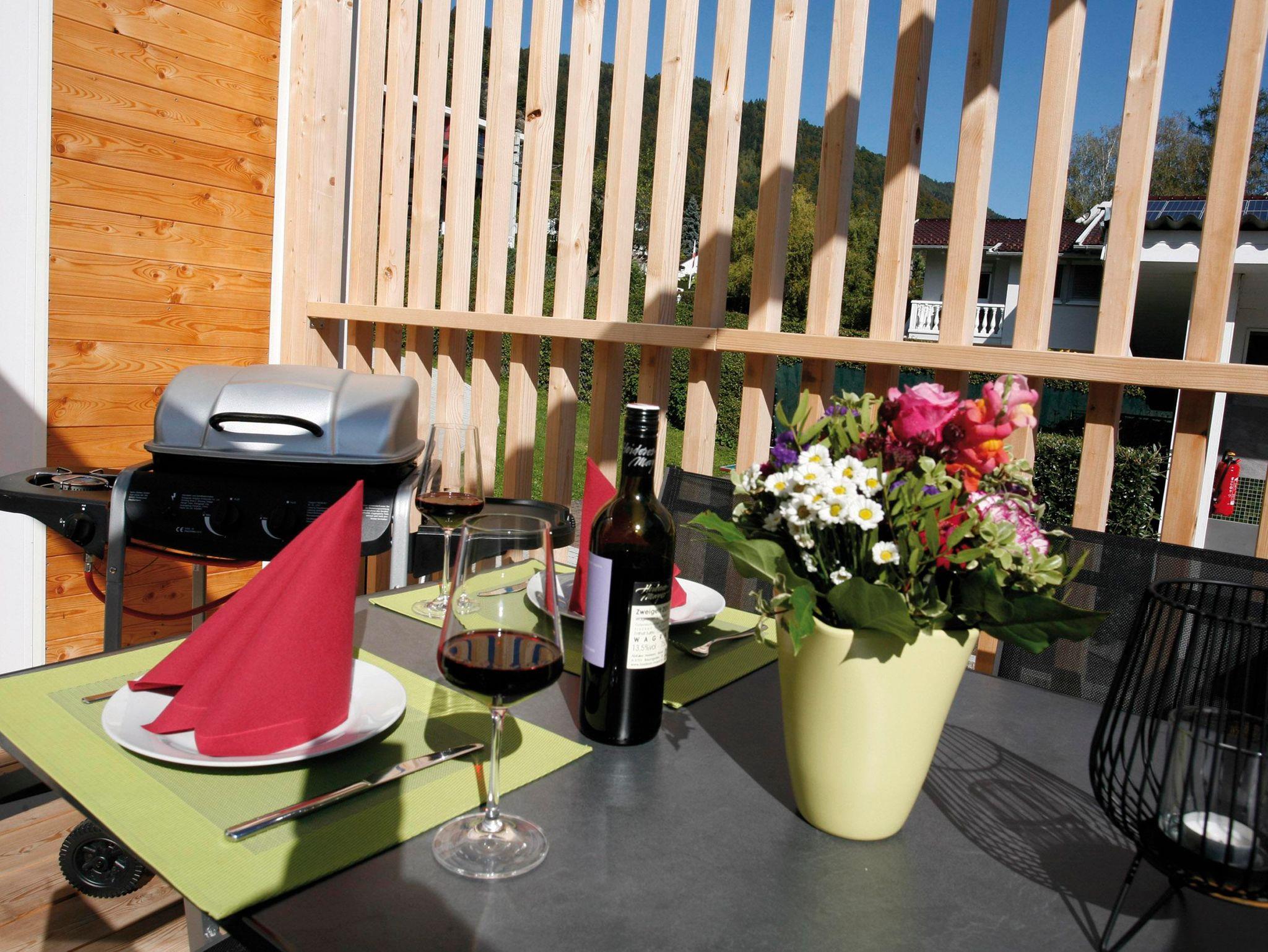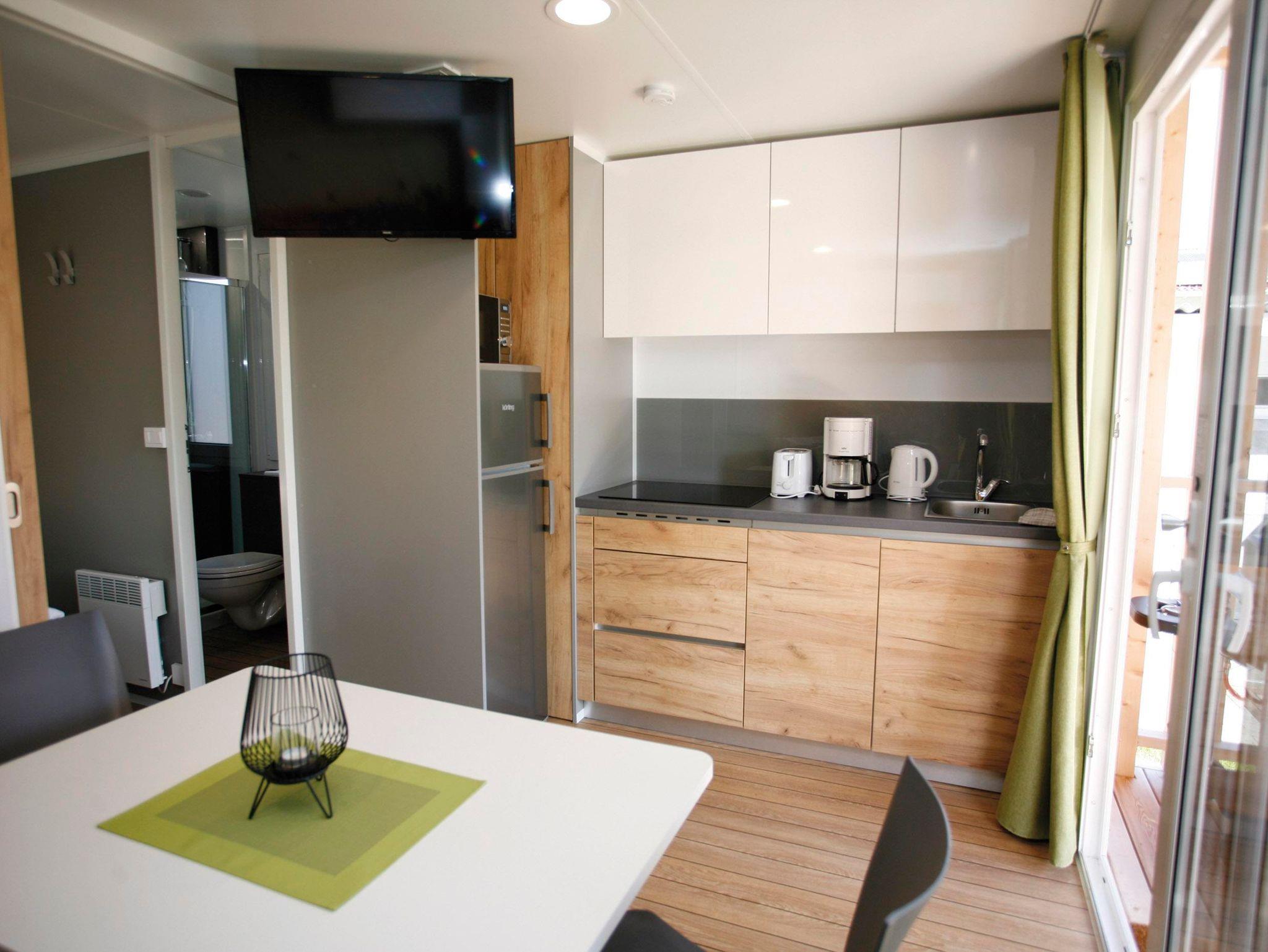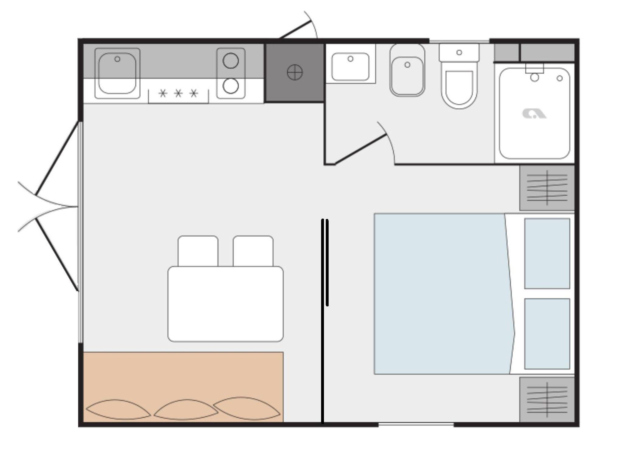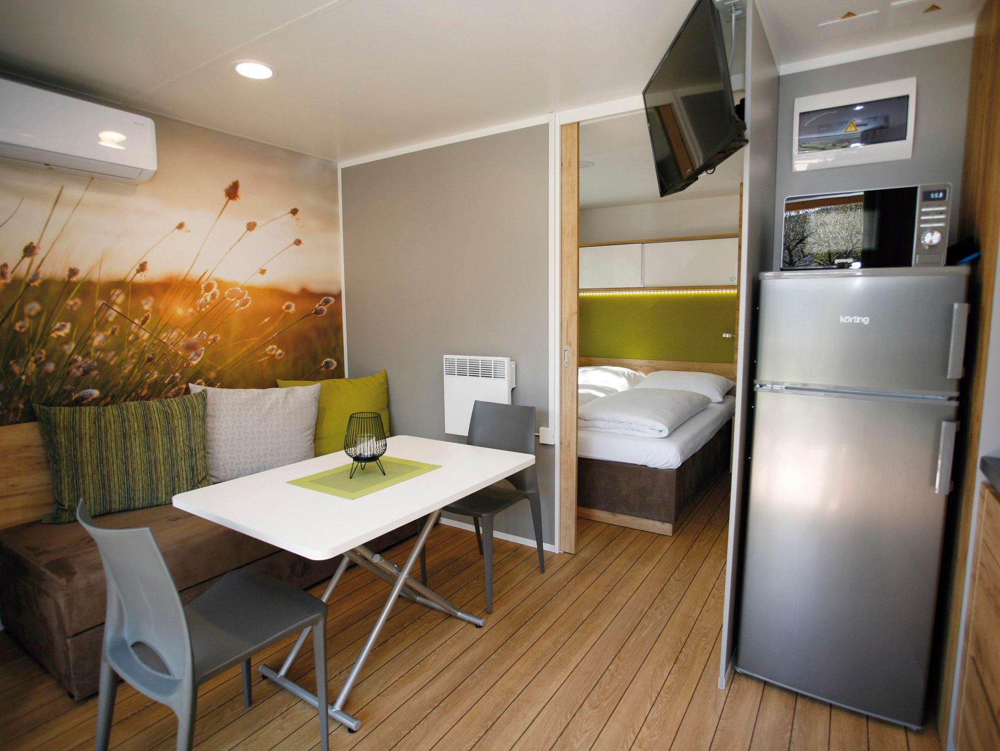 Modernes Ferienhäuschen für 2 - 3 Personen - bestehend aus Schlafzimmer mit Doppelbett, Badezimmer mit Dusche/WC, voll ausgestattete Küchenzeile mit Geschirr, Kaffeemaschine, Wohn- Essbereich mit Doppelschlafcouch, Terrasse mit Mobiliar, Outdoor Liegebetten, Gasgriller, Sat-TV, Klimanlage (gegen Gebühr), gratis W-Lan, gebührenfreier PKW-Parkplatz.