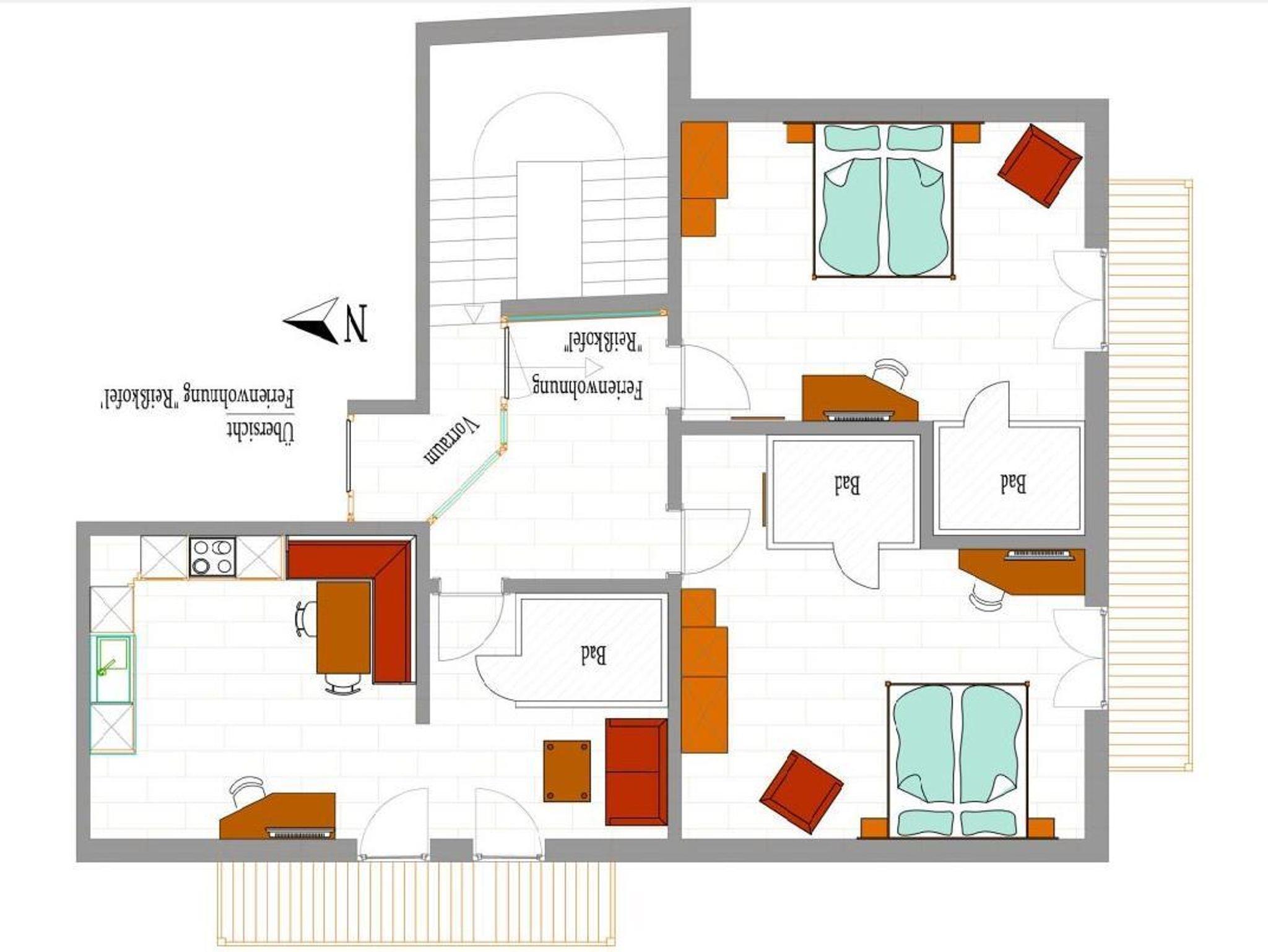 70 m2 Wohnfläche im 2. Stock laden ein zum Wohlfühlen. Die Ferienwohnung bietet Platz für 2 bis 4 Personen und ist ausgestattet mit Fichtenholzmöbeln, kleine Wohnküche mit Kühlschrank, Mikrowelle, Kaffeemaschine, Wasserkocher, E-Herd mit Backrohr, Geschirrspüler, extra Wohnzimmer mit gemütlicher Sitz-Couch, Flachbildschirm mit SAT-TV, Radio, gratis W-LAN, 2 getrennte Doppelbettzimmer mit eigener Dusche und WC, Fön, 2 Balkone mit Sitzgelegenheit und Hängesessel.