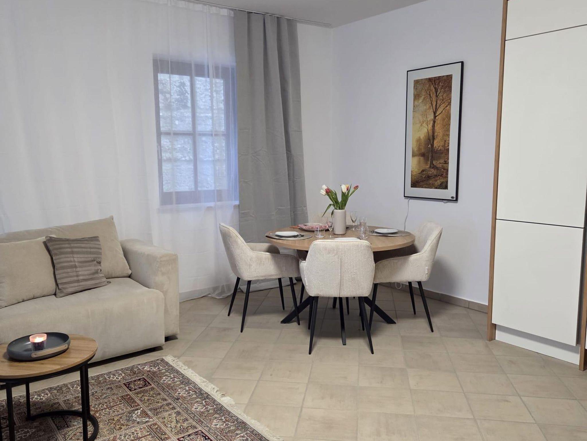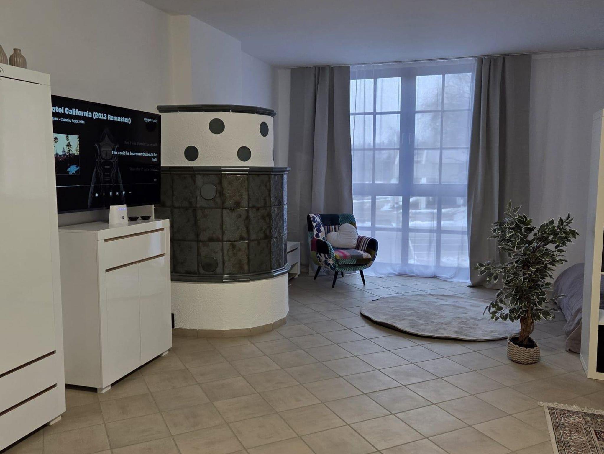 Diese gemütliche Ferienwohnung bietet alles, was man für einen entspannten Aufenthalt benötigt. Herzstück des Wohnbereichs ist der traditionelle Kachelofen, der gemeinsam mit dem Fernseher und einer bequemen Schlafcouch für eine behagliche Atmosphäre sorgt. Die vollausgestattete Küche mit angrenzendem Esstisch und vier Stühlen lädt zu gemeinsamen Mahlzeiten ein. Das Badezimmer ist funktional mit Dusche und WC ausgestattet und verfügt zudem über eine praktische Waschmaschine.