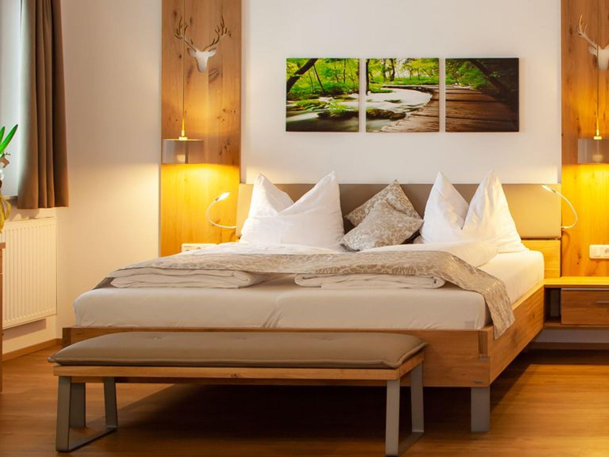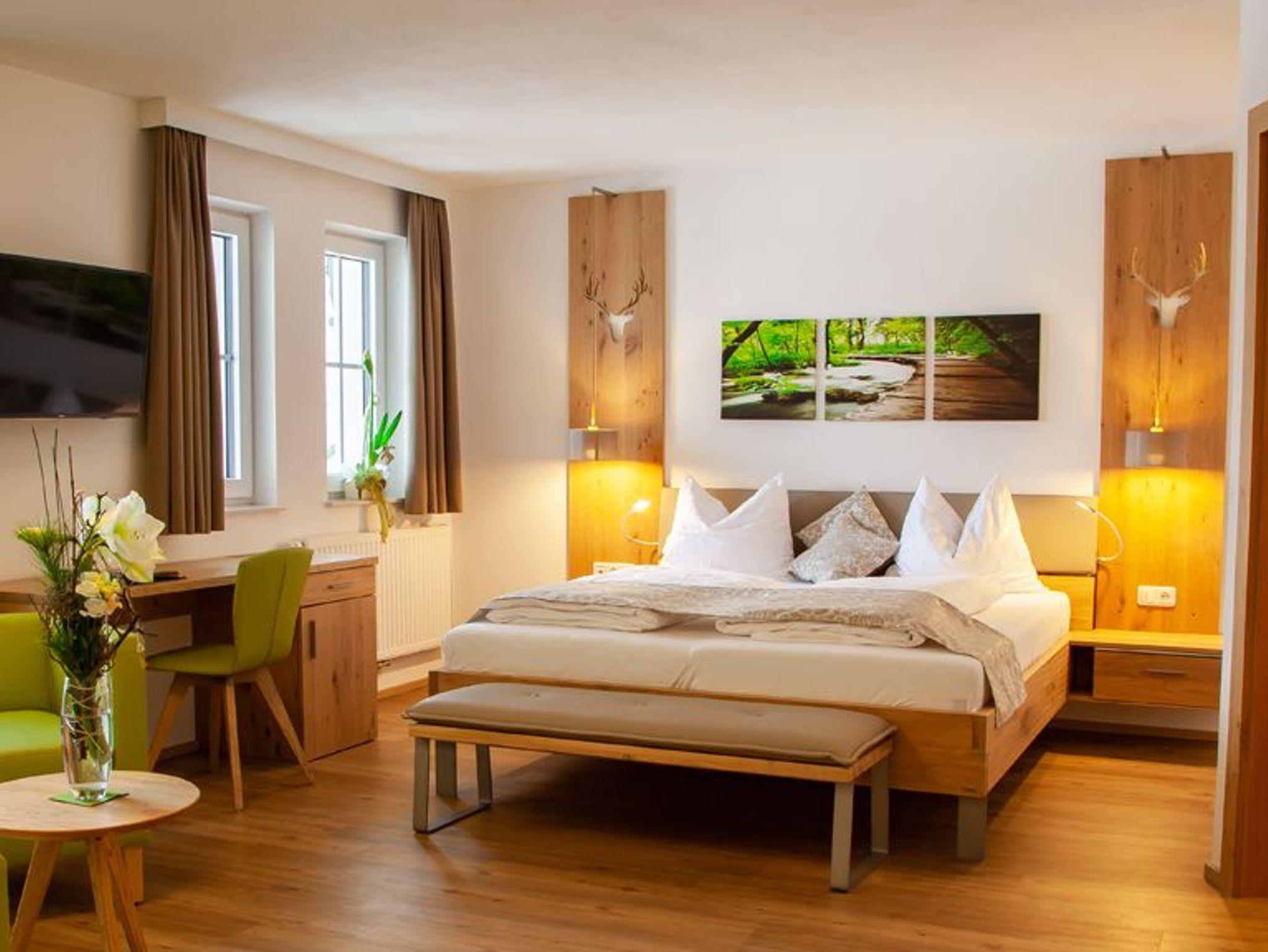 Luxuszimmer deluxe luxuriöses neues Doppelzimmer mit Vollholzmöbeln auf ca. 32m², Balkon mit Relaxstühlen, Bad mit Dusche und WC, gemütliche Sitzgelegenheit mit Tisch und Schreibtisch, Föhn und Schminkspiegel, Safe, Telefon, Radio-Sat-TV, Wellnesstasche mit Bademantel für die Dauer des Aufenthalts, Tiefgaragenstellplatz, kostenloses W-LAN. Aufpreis für das 4gängige Abendmenü 19Euro pro Person und Tag.